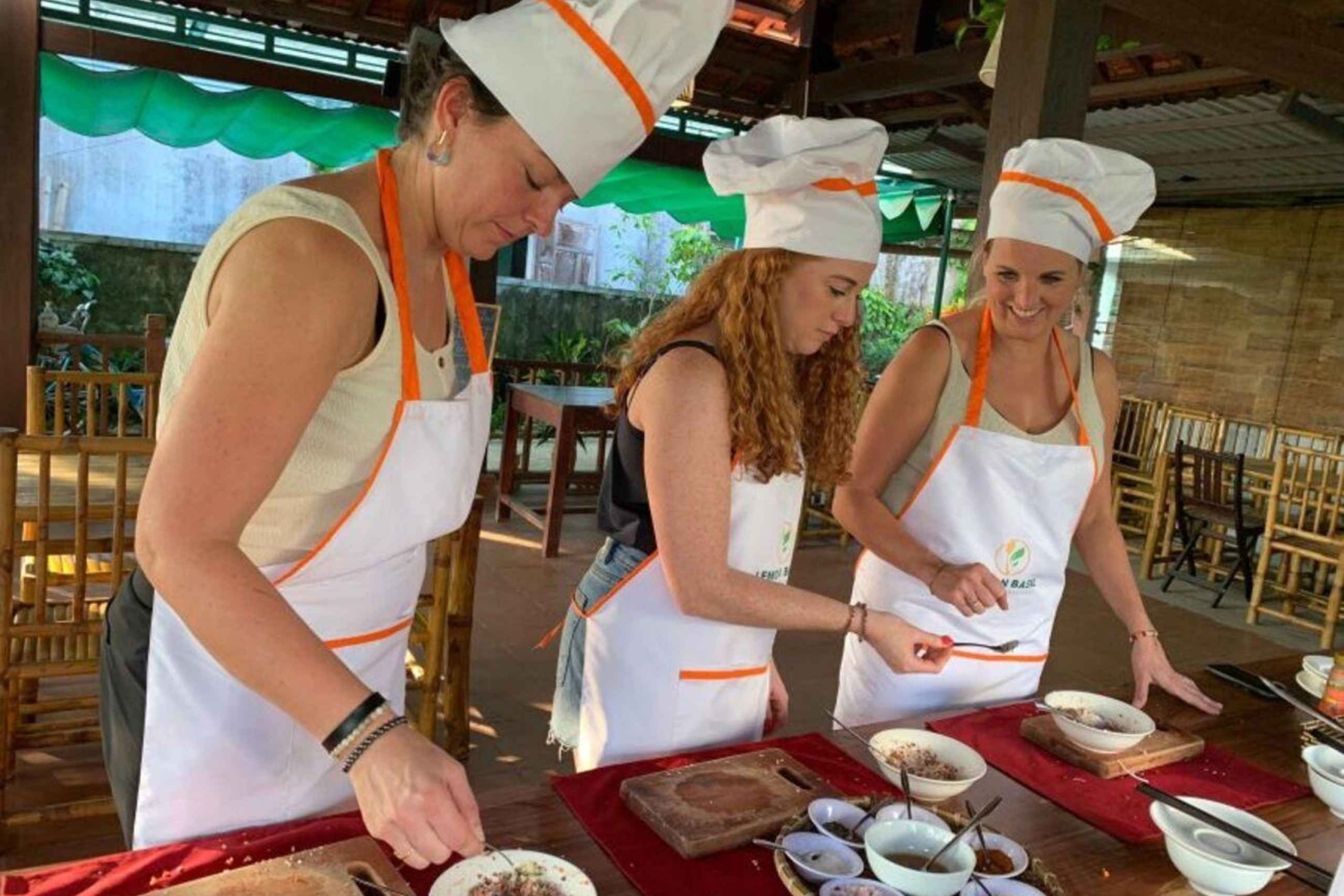 Lær at lave lækker og autentisk vietnamesisk mad ved at følge de detaljerede, trinvise instruktioner fra din engelsktalende kok. Lav traditionelle populære retter med ingredienser af høj kvalitet. Når alle er færdige, kan I få en snak med hinanden, mens I deler et måltid og smager på hinandens madlavning. *** Turens rejserute: - Lokal guide Afhentning på hotellet og transport til Cam Thanh Coconut Village-området - Derefter går vi til madlavningskursus i kokosnøddelandsbyen. - Nyd en velkomstdrink og tag et hvil i vores restaurant, og deltag derefter i madlavningsklassen. - Vores kok vil lære dig at lave 4 lokale retter, f.eks: Hoi An-rispandekager, Hoi An-forårsruller, papayasalat... - Efter timen kan du nyde det, du har lavet. - Madlavningskurset afsluttes, og du kører tilbage til hotellet. *** Børn under 3 år er gratis og deltager ikke i madlavningen, men deler al service med forældrene. *** Madlavningskurset kan kombineres med kødspisere. Vi vil dog forsøge at arrangere kun vegetariske deltagere i samme gruppe.Includes