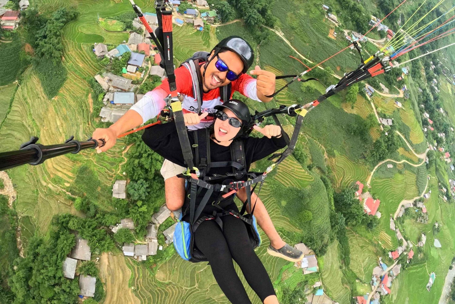 Oplev Sapa fra et betagende nyt perspektiv med vores tandemparagliding-oplevelse over den ikoniske Muong Hoa-dal. Dette spændende, men sikre eventyr er perfekt for førstegangsbesøgende og erfarne spændingssøgende. Start fra Hang Da Village, der ligger 1.500 meter over havets overflade, og svæv yndefuldt over dalens berømte risterrasser, tågedækkede landsbyer og majestætiske bjergtoppe. Flyvningen kombinerer spændingen ved at svæve gennem luften med roen i Sapas naturlige skønhed, hvilket skaber en uforglemmelig oplevelse. Når du lander i landsbyen Lao Chai, får du mulighed for at udforske den lokale H'mong-kultur og smage traditionelle retter, så eventyret ikke kun handler om flyvningen, men også er en kulturel rejse. Alle flyvninger udføres af certificerede og erfarne piloter, der bruger professionelt udstyr af international standard for at sikre din sikkerhed og komfort. Under flyvningen kan du tage fantastiske billeder og videoer, så du kan bevare den betagende udsigt og de unikke øjeblikke højt over dalen. Du behøver ingen erfaring – bare tag din eventyrlyst og et godt helbred med. Denne paragliding-oplevelse kombinerer adrenalin, naturskøn skønhed og kulturel opdagelse til én problemfri rejse, der giver minder, der varer hele livet. Uanset søger en unik måde at se Sapa på, et adrenalinsus eller et fredeligt øjeblik, hvor du svæver over fantastiske landskaber, er denne paragliding-oplevelse et must. Tag med os på et uforglemmeligt eventyr, hvor spænding møder ro, og det nordlige Vietnams skønhed udfolder sig under dig.Includes