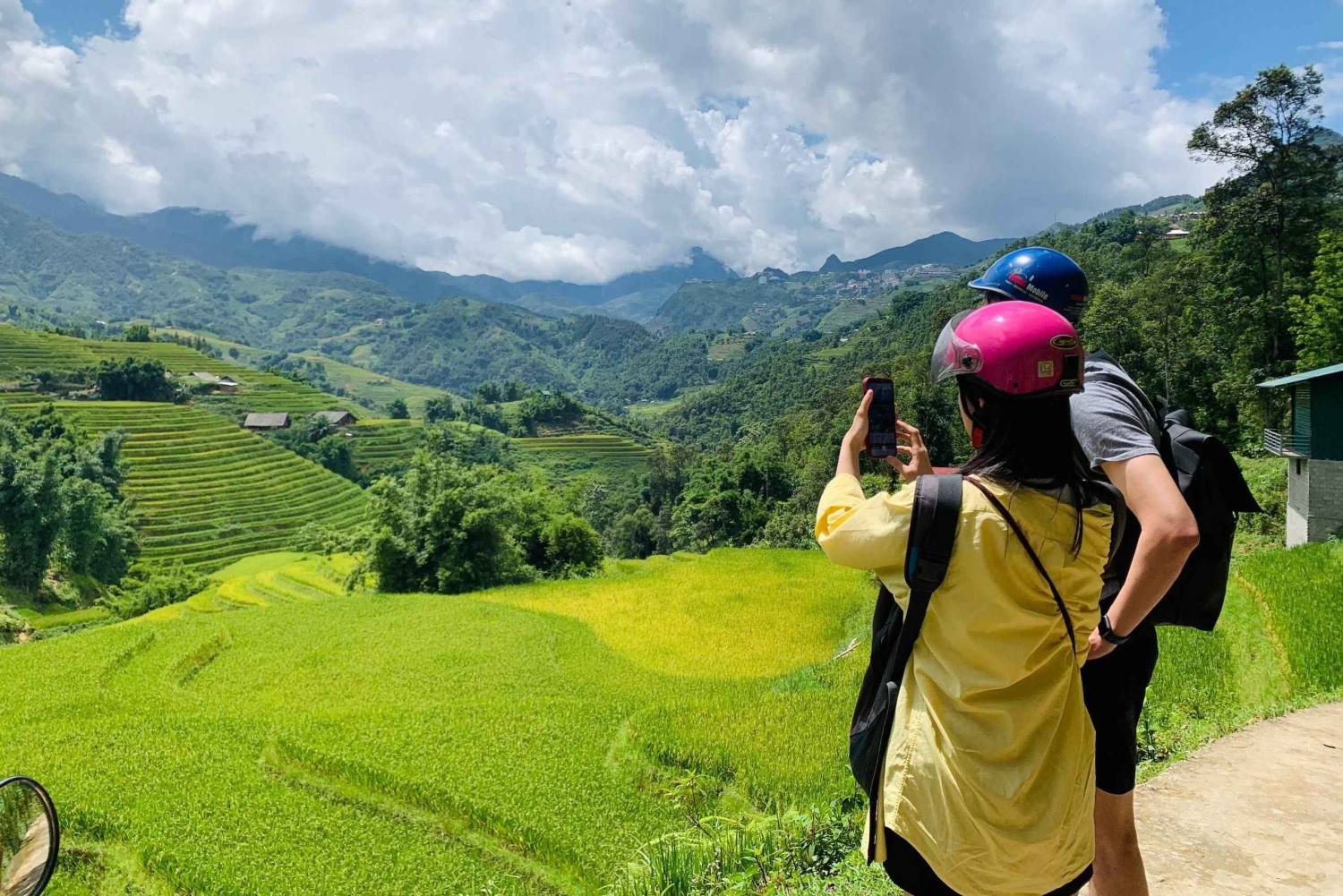 Turen starter kl. 8.30 om morgenen. Vores guide afhenter dig på dit hotel eller foran stenkirken, der ligger i centrum af Sapa. Derefter vil guiden introducere dig til rejseruten, og hvordan du betjener motorcyklen sikkert. Din rejse begynder fra Sapa til toppen af O Quy Ho-passet, et af de fire smukkeste pas i Vietnam. Du kører langs denne rute og nyder det spektakulære landskab med Hoang Lien Son-bjergkæden og Oolong-te-bakkerne sammen med smukke kirsebærtræer. Efter 20 minutters kørsel når du dit første stop, Silver Falls. Silver Falls, som er over 200 meter højt, ligger opstrøms for Muong Hoa ved foden af O Quy Ho-passet. Når du besøger Silver Falls, skal du gå ca. 1 km i en rundstrækning, hvor du kan se de lokales kardemommefarme mod den storslåede Muong Hoa-dal og det hvide vand, der flyder fra en højde på over 1.800 meter. Du fortsætter derefter i ca. 10 minutter for at nå Love Waterfall. Dette område er også en del af Hoang Lien Son Nationalpark. Du skal gå på opdagelse i cirka en time, så du kan fordybe dig i den store skov og lytte til fuglenes sang og lyden af rindende vand. Love Waterfall, der ligger skjult i skoven i 2.000 meters højde over havet, har et fald på 100 meter. Dets mest specielle træk er dets uberørte og rolige skønhed. Hvis vejret er godt, kan du stoppe og tage et forfriskende bad ved foden af vandfaldet, hvor vandet er køligt og rent og strømmer fra den gamle skov. Bagefter fortsætter du på motorcykel til Lonely Tree (Haven Gate), hvor du kan tage billeder og beundre hele dalen, der er fyldt med skove og lokale kardemommefarme. Hvis vejret er godt, er jeg sikker på, at du vil blive forbløffet over dette steds naturlige skønhed. Næste etape af din rejse tager dig langs Muong Hoa-dalen ind i lokale landsbyer, hvor du kan beundre de majestætiske terrassemarker og de smukt uberørte landsbyer, der er utroligt maleriske. Du kører gennem landsbyerne Sin Chai, Y Linh Ho og Lao Chai, hvor terrassemarkerne og træhusene er kendt for at være de smukkeste i Sapa. Du stopper ved en lille H'mong-restaurant ved floden for at nyde en lækker frokost og få mulighed for at opleve det lokale køkken. Efter frokosten går du en kort tur for at besøge en lille sort Hmong-familie og lære om det lokale liv, kulturer, traditioner, tøj ... og hvordan de lever. Og hvordan de lever. Du mærker vildskaben og det ekstremt enkle liv dukke op i dit sind, og du kan stille alle de spørgsmål, som du længe har været nysgerrig efter at få svar på. Derefter fortsætter du med at køre for at besøge 3 landsbyer, nemlig Ta Van, Hau Thao og Su Pan, hvorefter du kommer tilbage til Sapa Town eller dit hotel, og så har du afsluttet en ekstremt smuk og meningsfuld tur, turen slutter kl. 14.30 - 15.300.Includes
