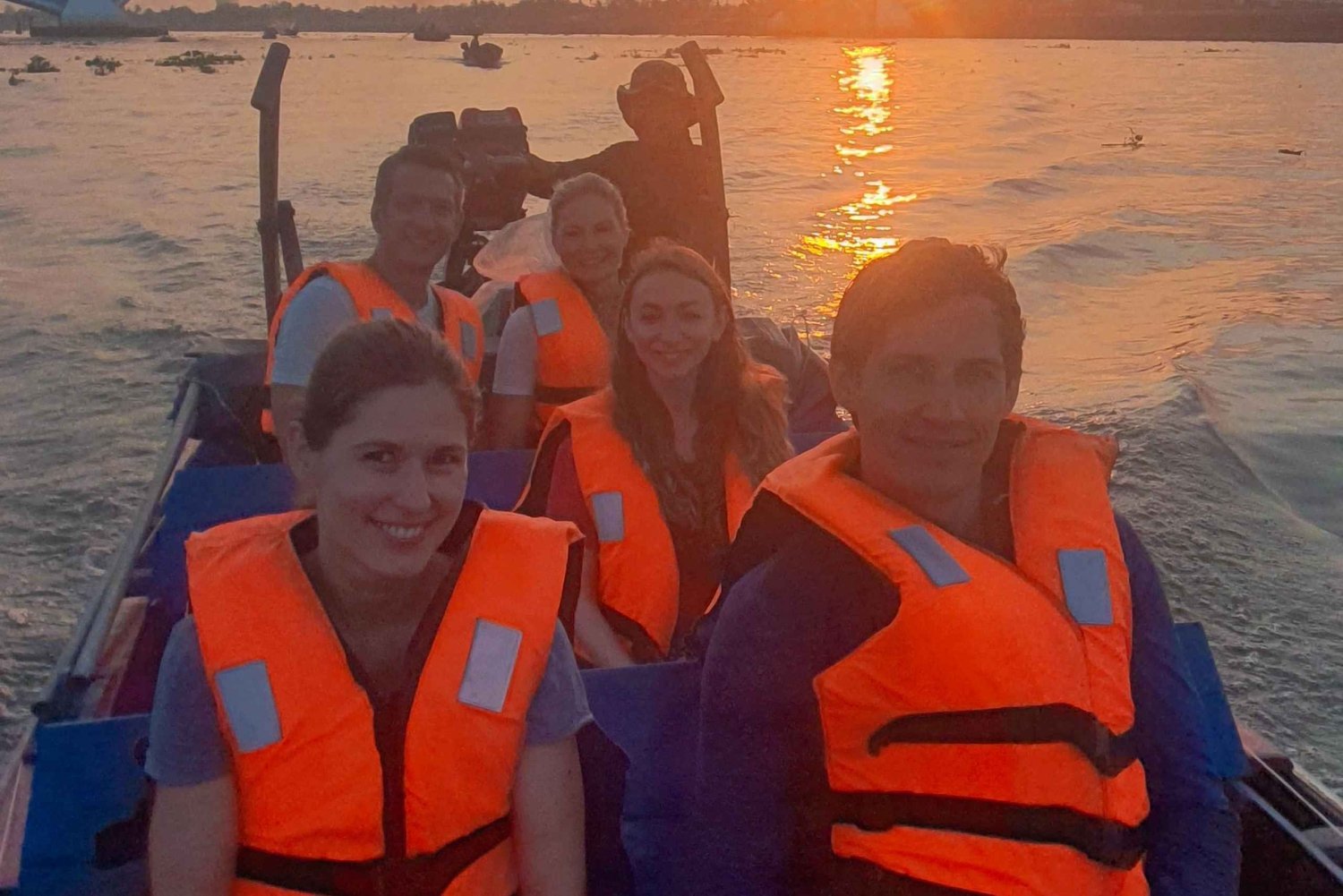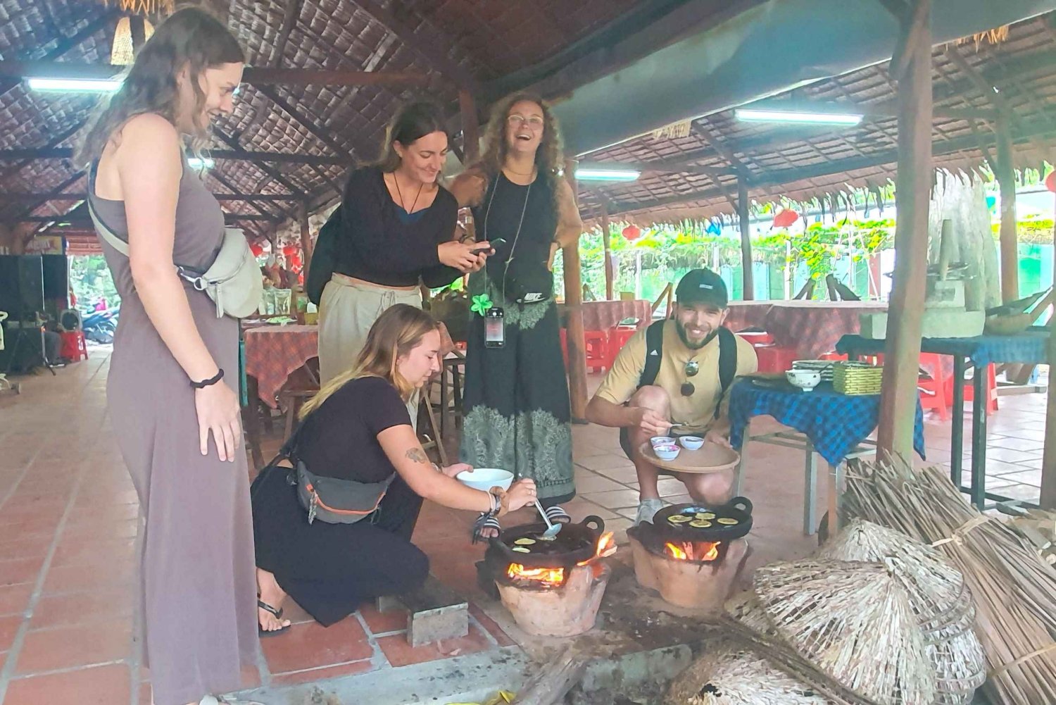 Entdecke das Mekong-Delta: Ein ganztägiges authentisches Erlebnis Beginne deine Reise um 5:30 Uhr, wenn das erste Licht über den Fluss fällt. Auf einem traditionellen vietnamesischen Boot entdeckst du die ruhige Schönheit des Mekong. Dein fachkundiger Guide erzählt dir von der reichen Geschichte, der Kultur und dem täglichen Leben im Delta. Erlebe einen atemberaubenden Sonnenaufgang Wenn das Wetter es zulässt, kannst du einen atemberaubenden Sonnenaufgang über dem Fluss erleben und dann zum schwimmenden Markt von Cai Rang fahren, einem der lebendigsten Märkte Vietnams. Erlebe den pulsierenden Markt Tauche ein in den lebhaften Markt von Cai Rang, wo Boote frische Produkte und Waren verkaufen und einen echten Eindruck vom lokalen Leben vermitteln. Authentisches vietnamesisches Frühstück auf dem Wasser Genieße ein traditionelles vietnamesisches Frühstück mit Reisnudeln, frischen Zutaten und einer würzigen Brühe, gepaart mit frisch gebrühtem vietnamesischem Kaffee. Vegetarische Optionen sind verfügbar. Entdecke das friedliche Herz des Mekong Fahre durch friedliche Kanäle, umgeben von üppigen Landschaften. Besuche einen tropischen Obstgarten und erfahre von deinem Guide mehr über die lokale Landwirtschaft. Lerne, traditionelle vietnamesische Gerichte zuzubereiten Lerne die Zubereitung von TINY VIETNAMESE PANCAKE' (SAVOURY) mit frischen lokalen Zutaten. Genieße deine Kreationen in einem ruhigen tropischen Garten. Tropische Früchte und Tee in einer traditionellen Hütte Entspanne dich in einer strohgedeckten Hütte bei tropischen Früchten und grünem Tee und genieße die ruhige Flussumgebung und den friedlichen Lebensrhythmus. Besuche den ruhigeren schwimmenden Markt Am Nachmittag besuchst du den schwimmenden Markt von Cai Rang zu einer ruhigeren Zeit. Entdecke die ruhige Routine der Verkäufer und besuche ein schwimmendes Haus, um mit den Einheimischen zu sprechen. Beende dein unvergessliches Mekong-Delta-Erlebnis Um 11:30 Uhr kehrst du zum Ausgangspunkt zurück und denkst an die unvergesslichen Erinnerungen an die lokale Kultur, die atemberaubenden Landschaften und die herzliche Gastfreundschaft des Mekong-Deltas.Includes