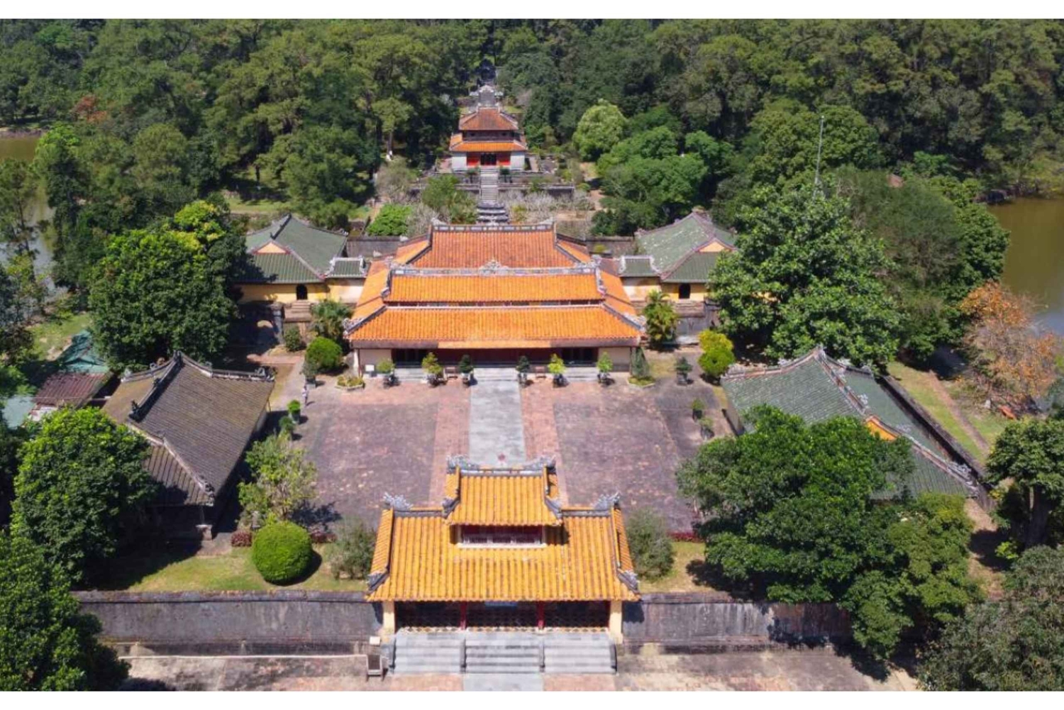 Beginne deinen Tag mit einer bequemen Abholung von deinem Hotel. Wenn du noch nichts gefrühstückt hast, mach einen Halt in einem lokalen Restaurant, um authentisches Bún bò Huế zu genießen. Dann geht's in die Kaiserstadt Hue, wo du 2 Stunden lang Paläste, königliche Tore und Hallen erkunden kannst. Besuche dann den geheimnisvollen Thuy-Tien-See und seinen verlassenen Wasserpark, wo du einzigartige Fotos von der Drachenskulptur machen kannst. Weiter geht's zum Grab von Khai Dinh, das für seine Ost-West-Fusion bekannt ist, und zum ruhigen Grab von Minh Mang, das von Natur umgeben ist. Mach einen Zwischenstopp für ein lokales Mittagessen, bevor du zum poetischen Tu-Duc-Grab mit seinen Seen, Gärten und historischen Geschichten aufbrichst. Besuche ein Weihrauch-Dorf, wo du Weihrauchstäbchen rollen und die Handwerkstradition kennenlernen kannst. Fahre weiter zur friedlichen Tu-Hieu-Pagode, die in einem Pinienwald versteckt ist, und zur ikonischen Thien-Mu-Pagode, die den Parfüm-Fluss überblickt. Beende deinen Tag mit einem Halt in einem lokalen Geschäft, um die köstliche traditionelle süße Suppe von Hue zu probieren.Includes