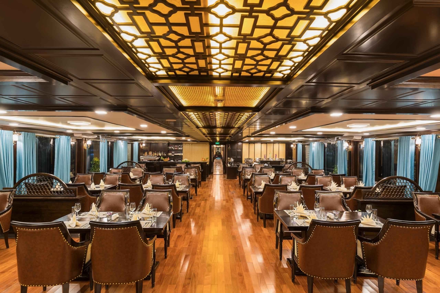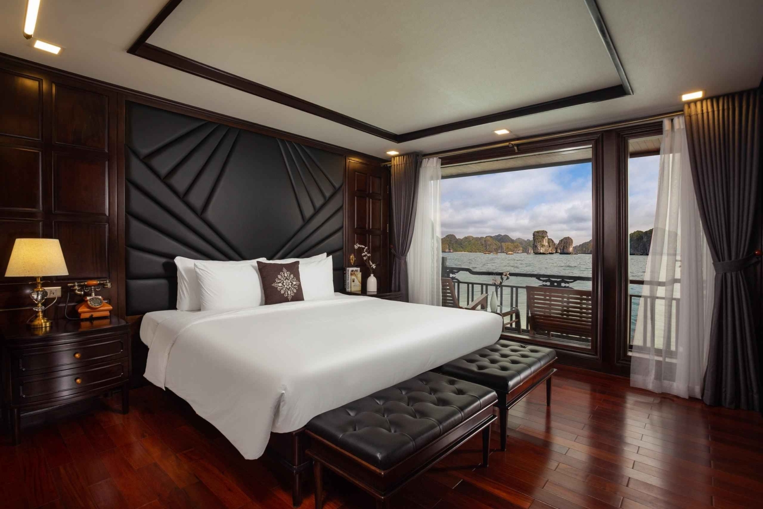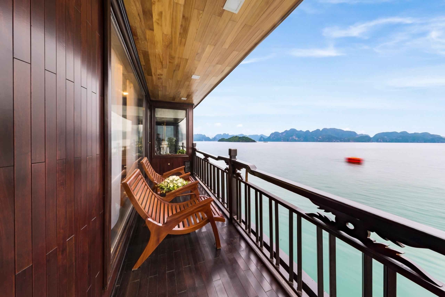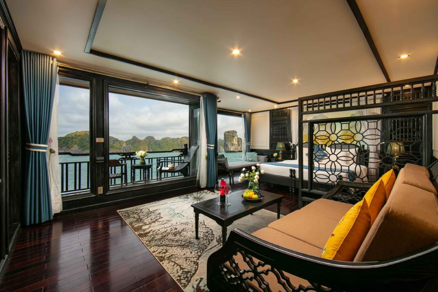 Cabina de lujo completamente equipada con aire acondicionado, baño de mármol y artículos de baño Balcón privado con vista al mar Baño con bañera o ducha Todas las comidas a bordo Traslado en lancha rápida o auxiliar Bebida de bienvenida Servicio de habitaciones las 24 horas Ciclismo en el pueblo de Viet Hai Demostración de cocina Entrada y tarifas turísticas Tai Chi por la mañana Kayak, paseos en botes de bambú, espeleología y pesca de calamares Wi-Fi Guía Fiesta al atardecerImportant Information
