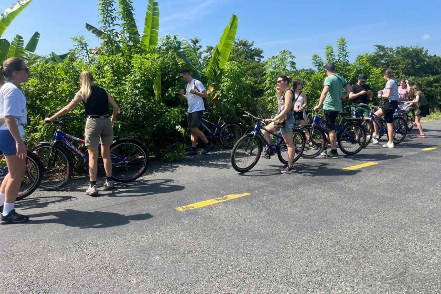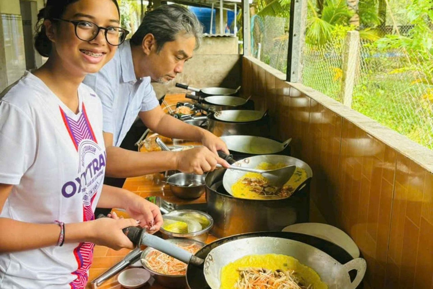 Día 1: Ciudad Ho Chi Minh – My Tho – Ben Tre – Can Tho (almuerzo) Empieza el día con una visita a la pagoda de Vinh Trang, una elegante mezcla de arquitectura vietnamita, china y jemer. Súbete a un barco en el puerto de My Tho para explorar la isla del Unicornio (Thoi Son), conocida por sus exuberantes huertos y sus amables lugareños. Visita un taller de dulces de coco, prueba dulces recién hechos y té con miel, y disfruta de la música tradicional del sur en un tranquilo jardín. Deslízate por los canales a la sombra de las palmeras en un tradicional sampán y, después, saborea un almuerzo vietnamita junto al río. Por la tarde, viaja a Can Tho, haz el registro de entrada en el hotel y disfruta de tiempo libre para explorar la ciudad a tu propio ritmo. Día 2: Mercado flotante de Cai Rang – Ciudad Ho Chi Minh (desayuno/almuerzo) Madruga para descubrir el vibrante mercado flotante de Cai Rang, donde los barcos repletos de frutas y verduras crean una colorida escena matutina. Visita un taller de fideos de arroz y una casa histórica para echar un vistazo a la auténtica vida local. Más tarde, únete a una clase de cocina práctica y aprende a hacer Bánh Xèo o Bánh Khọt, y luego disfruta de tu comida recién preparada. Termina el viaje con un relajante paseo en bicicleta por pueblos tranquilos, donde podrás relacionarte con los lugareños antes de regresar a Ciudad Ho Chi Minh por la tarde. ***Este tour combina naturaleza, cultura y vida cotidiana, ofreciendo la escapada perfecta de 2 días para quienes buscan el verdadero espíritu del delta del Mekong. Ten en cuenta que el orden de las actividades puede variar ligeramente en función del tiempo, el tráfico o las condiciones locales, pero se incluirán todos los puntos destacados.Includes