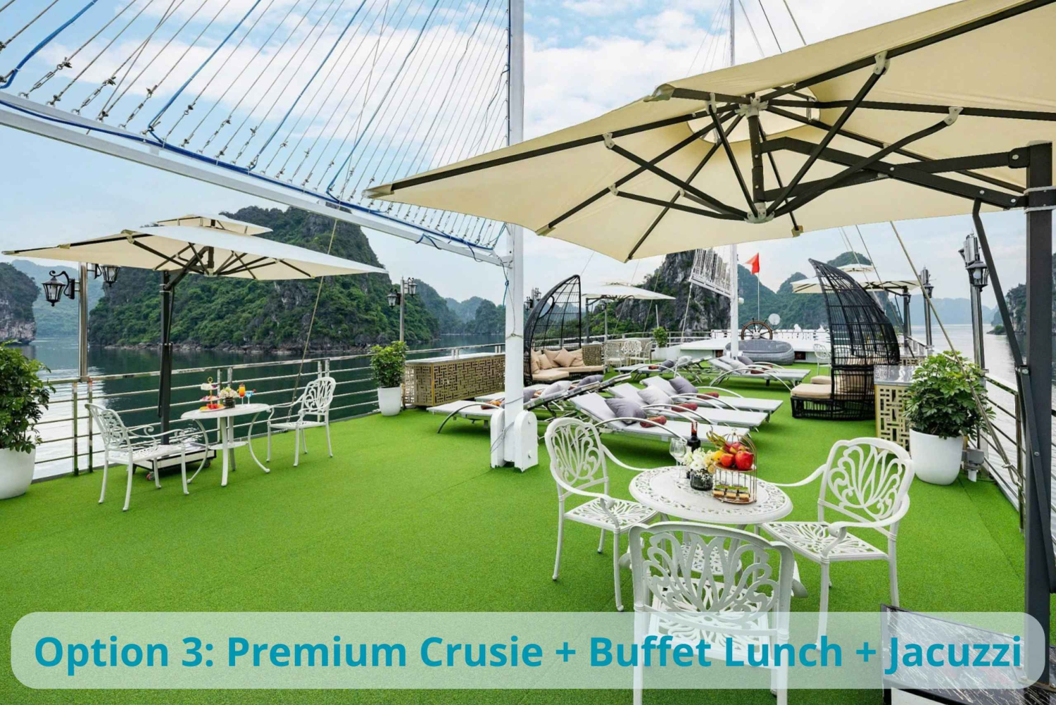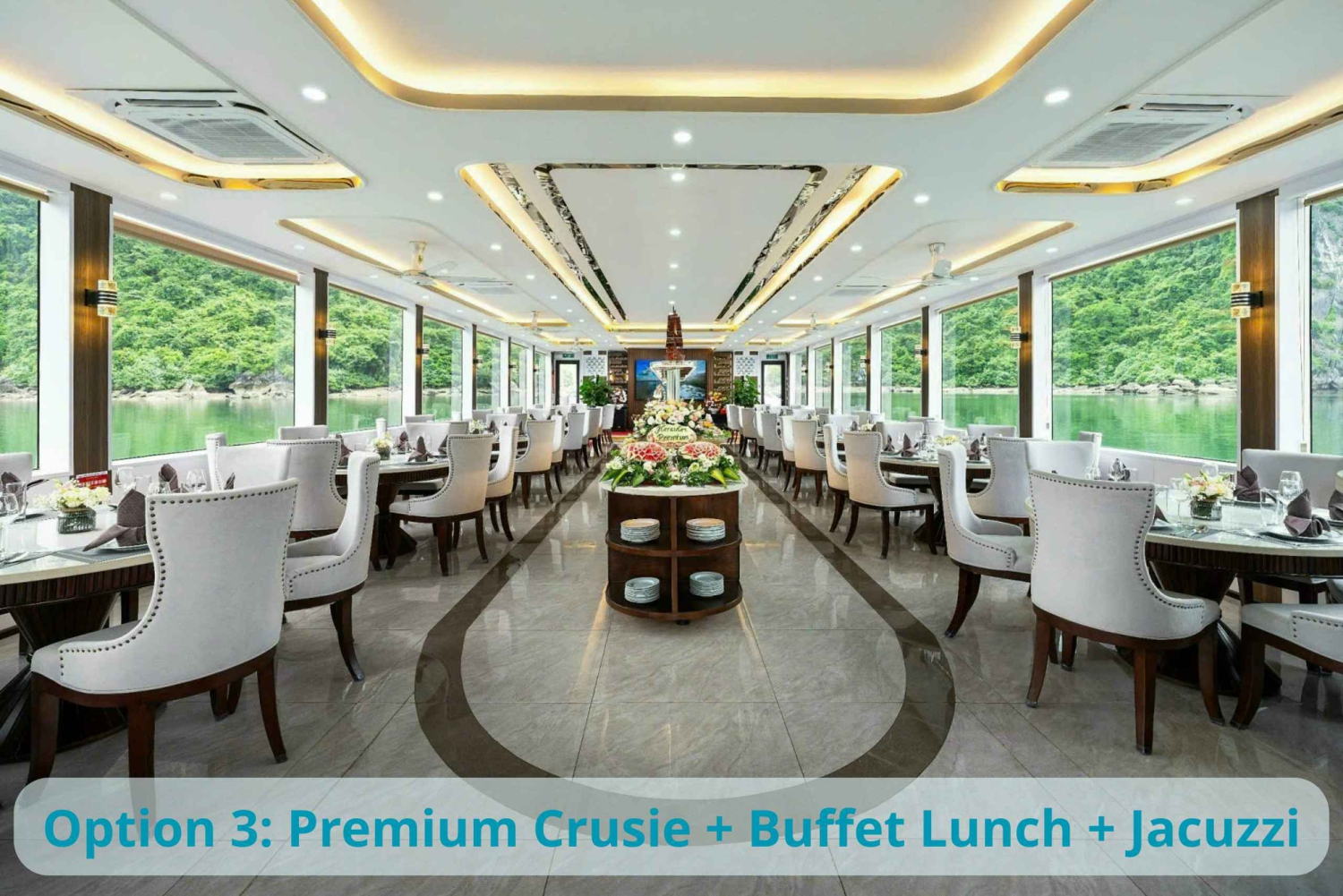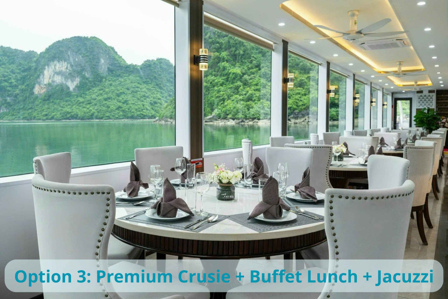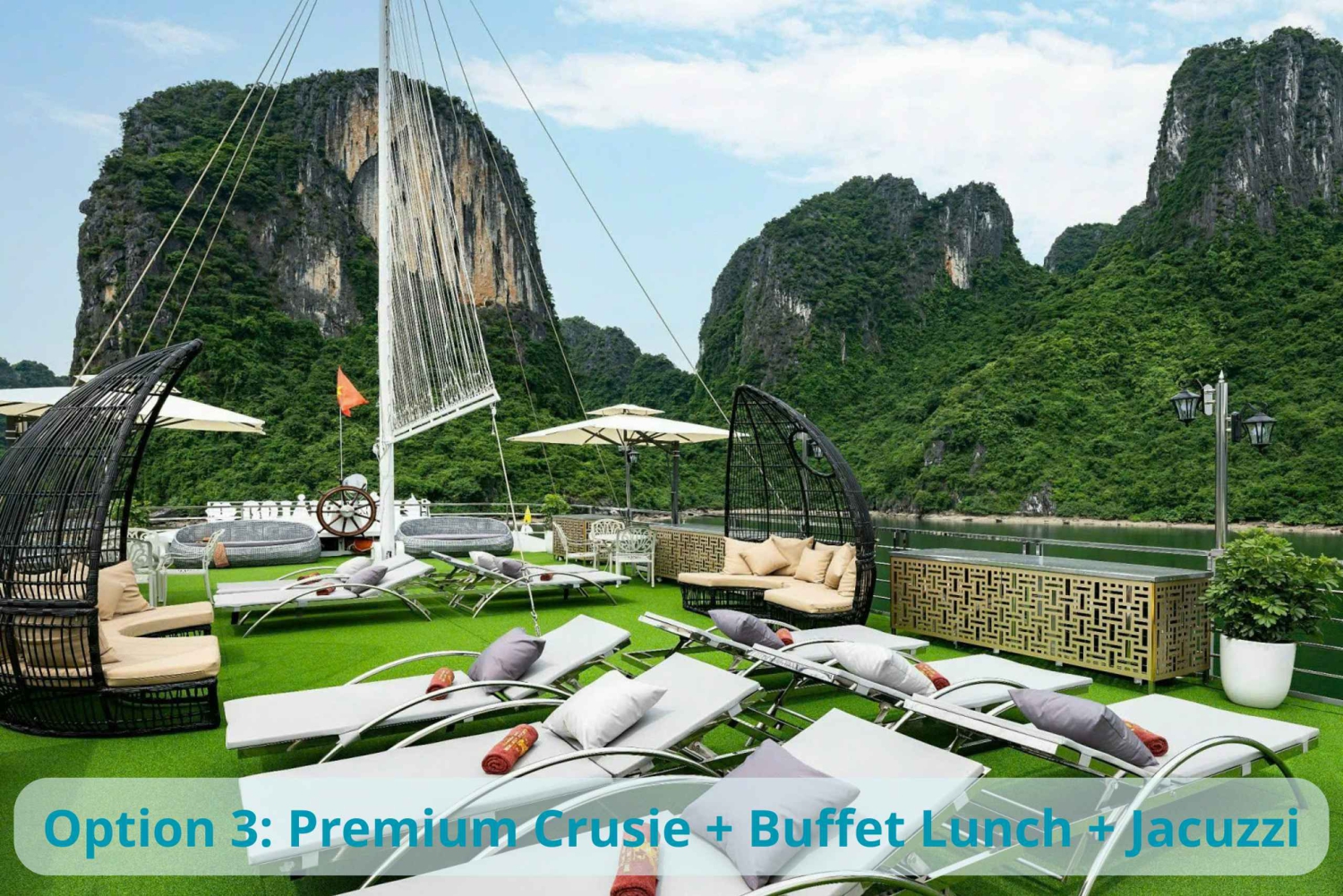 Recogida y regreso en el casco antiguo de Hanói (si se selecciona) Guía de habla inglesa Crucero de lujo por la bahía de Halong Visita: cueva de Sung Sot, isla Titop y cueva de Luon Kayak o paseo en barco de bambú Todos los precios de entrada Almuerzo vietnamita (hay opciones vegetarianas/veganas) Almuerzo buffet para el crucero prémium si se selecciona la opción Fiesta al atardecer (vino, té, fruta, aperitivos) 1 botella de agua mineral en el autobúsImportant Information