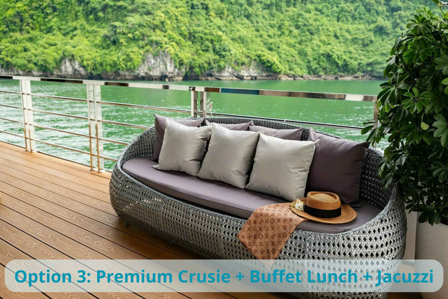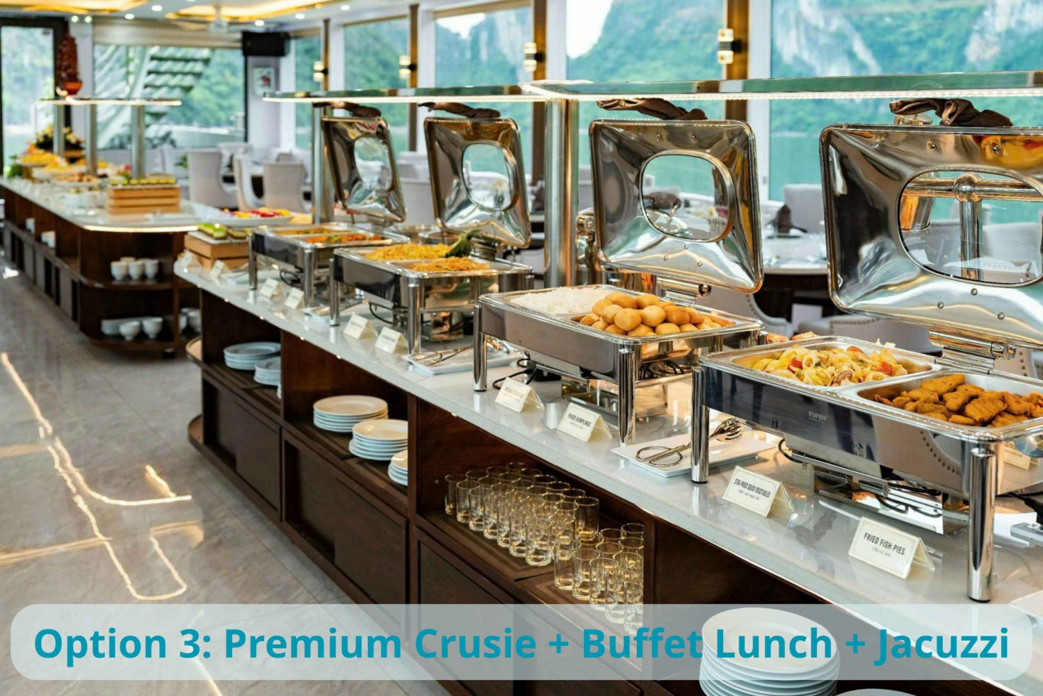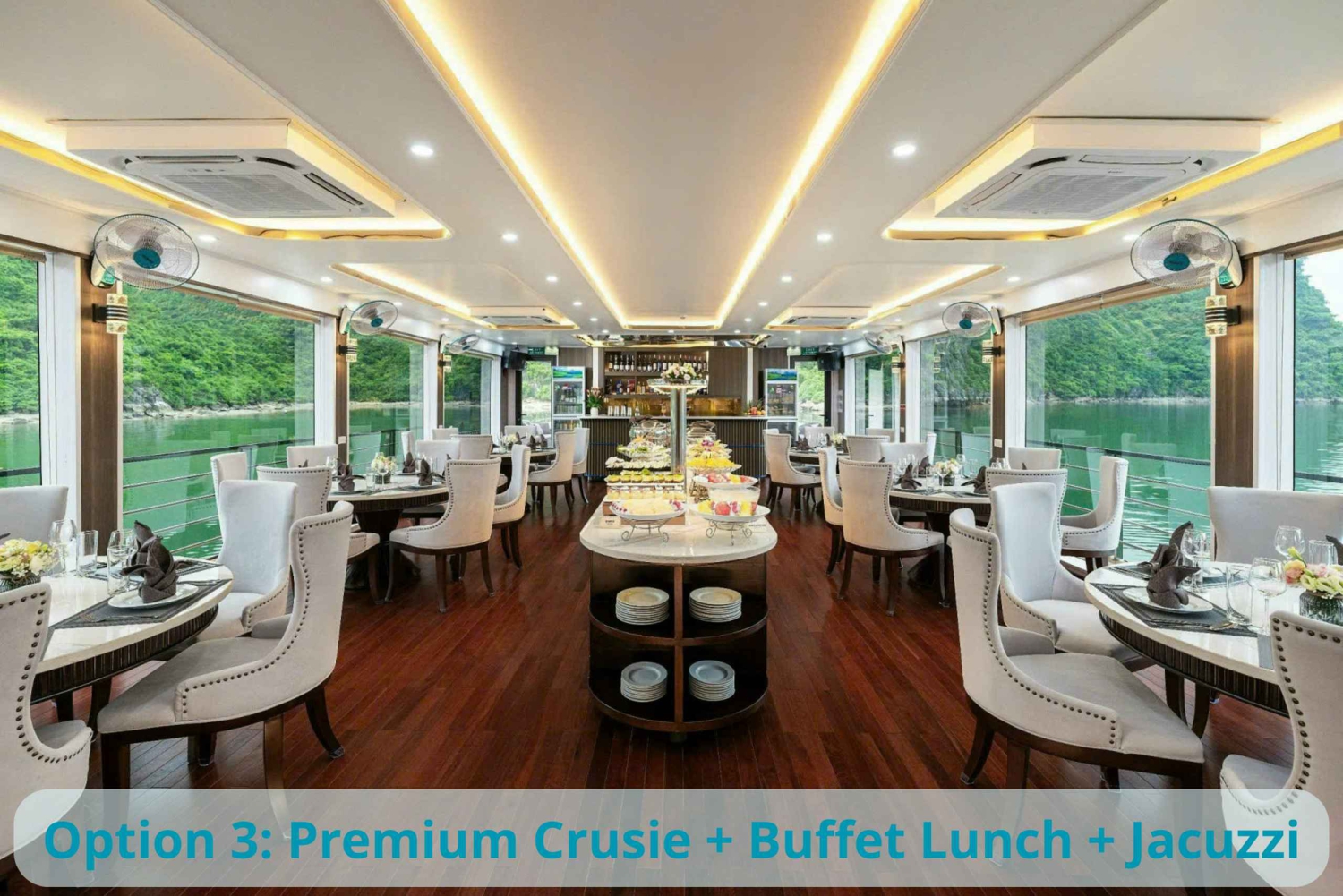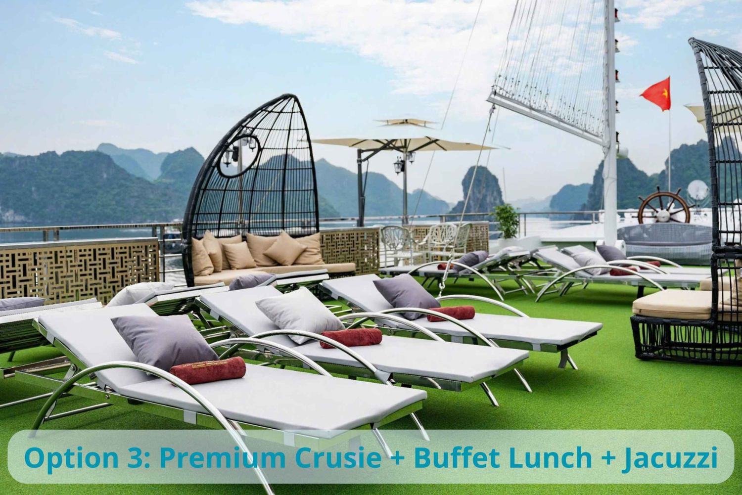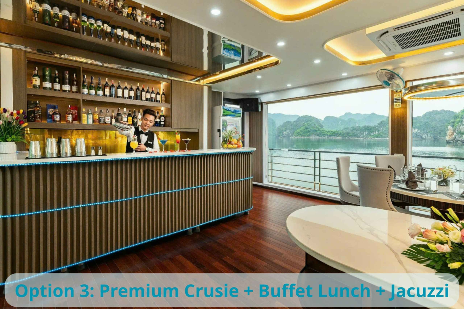 Recogida y regreso en el casco antiguo de Hanói (si se selecciona) Guía de habla inglesa Crucero de lujo por la bahía de Halong Visita: cueva de Sung Sot, isla Titop y cueva de Luon Kayak o paseo en barco de bambú Todos los precios de entrada Almuerzo vietnamita (hay opciones vegetarianas/veganas) Almuerzo buffet para el crucero prémium si se selecciona la opción Fiesta al atardecer (vino, té, fruta, aperitivos) 1 botella de agua mineral en el autobúsImportant Information