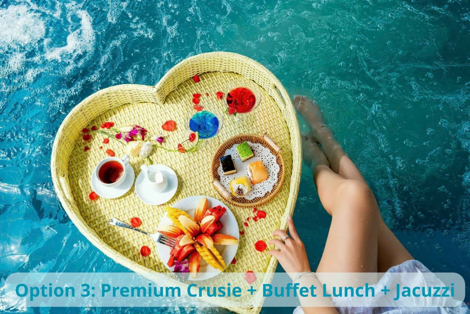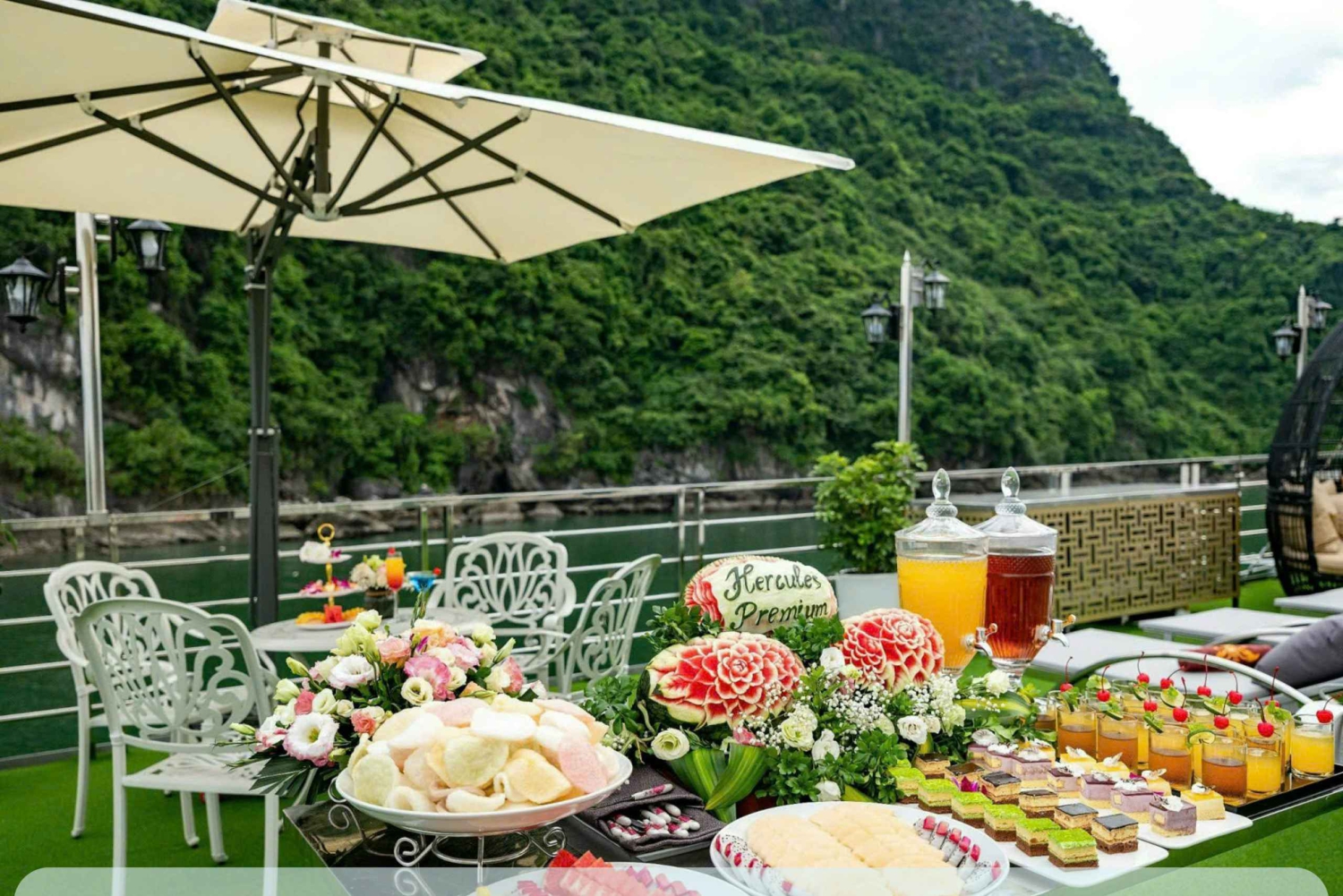 - Fiesta al atardecer: vino tinto, comida ligera y frutas en la bahía de Halong, Patrimonio de la Humanidad de la UNESCO