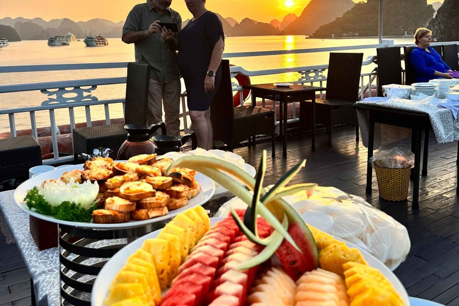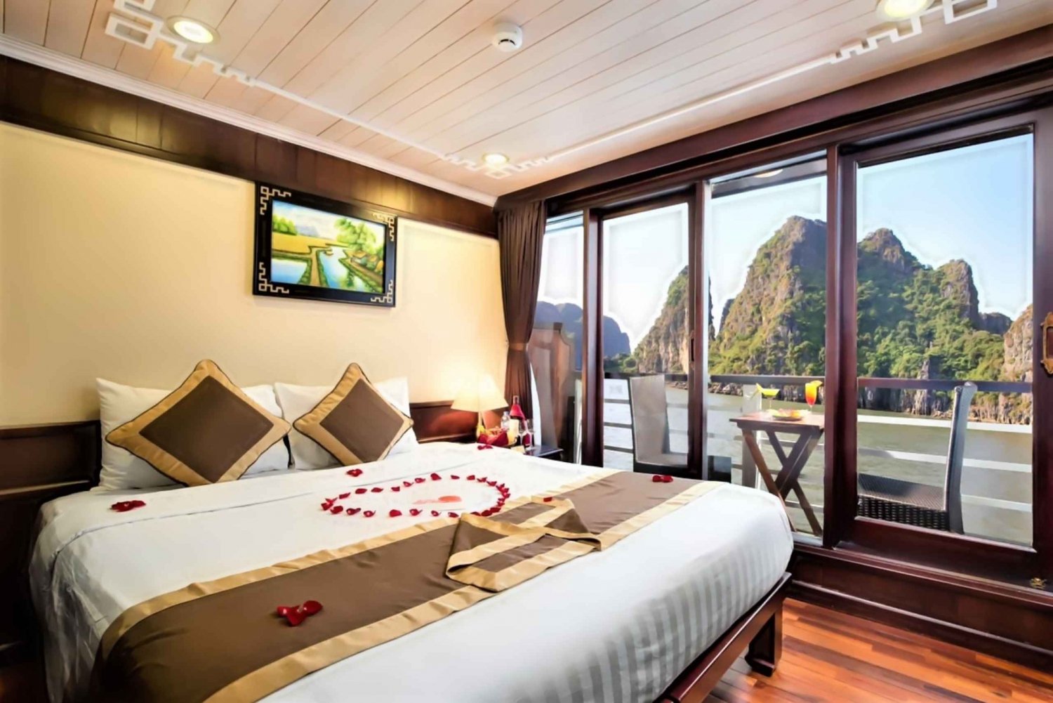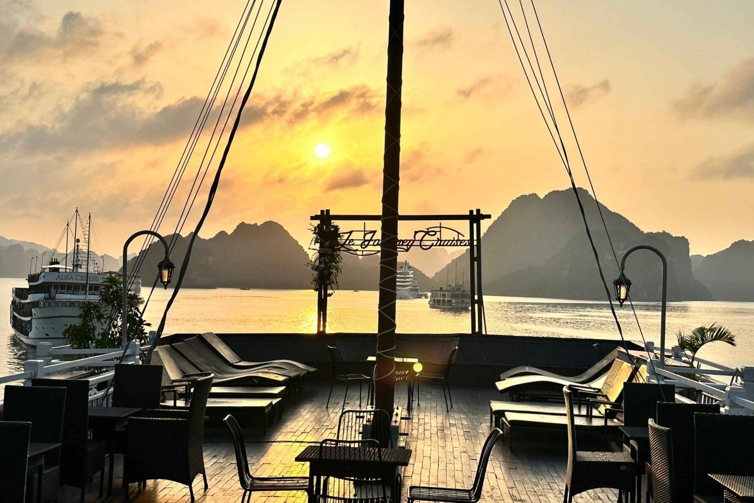 Cena x 1 Desayuno x 1 Comida x 2 Agua embotellada Ducha y agua caliente, baño privado. Bañera para el tipo de camarote Suite Baño completo bajo petición WIFI GRATUITO en la zona pública y la oficina del crucero Entrada con ticket para todas las comidas y actividades Kayak/Barco de Bambú, Baño en la Playa, Clase de Cocina, Clase de Tai Chi, Hora Feliz de Bebidas Traslado de ida y vuelta de Hanoi a Halong (3 horas de viaje por autopista en autobús o limusina) Entrada/Admisión - Cueva de Sung Sot, Isla de Ti Top, Cueva de Luon, Bahía de Ha LongEasy cancellation