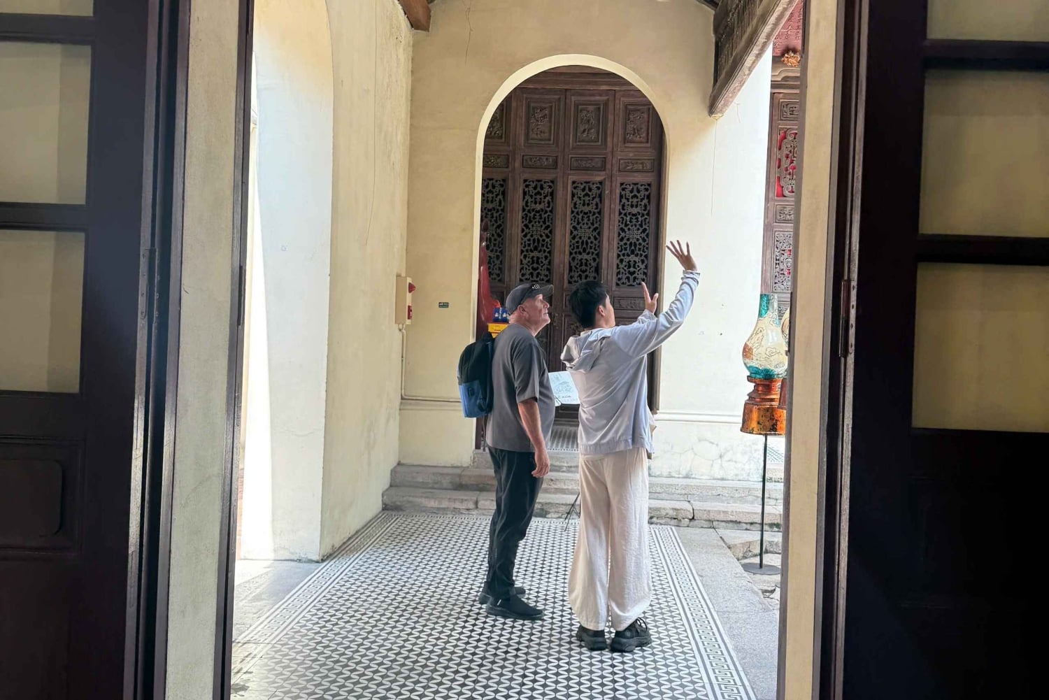 1) Lago Hoan Kiem - Templo Ngoc Son: Empieza tu viaje en el corazón de Hanói, el lago Hoan Kiem. Pasea por la orilla del lago y admira la icónica Torre de la Pluma, símbolo del conocimiento y la literatura. Cruza el encantador puente rojo que conduce a un pequeño templo isleño. El agua tranquila y los árboles centenarios crean una atmósfera serena, ofreciendo una visión del alma espiritual e histórica de Vietnam. 2) Parada para picar algo: a continuación, haz una pausa para tomar un refrescante tentempié callejero. Combina el crujido de la papaya rallada, el sabroso aroma de la carne seca y el toque del aliño de lima, creando un equilibrio perfecto de sabores dulces, ácidos y picantes. Es ligero, vibrante y lleno de carácter local. 3) Taller de artesanía: a continuación, pasea por un tranquilo callejón donde te espera un taller de artesanía escondido. Observa a los expertos artesanos trabajar y admira su dedicación a la artesanía tradicional. También recibirás un pequeño regalo hecho a mano para que te lo lleves a casa. 4) Casa comunal de Kim Ngan: después, visita un espacio comunal sagrado que una vez fue utilizado por generaciones de artesanos para honrar al antepasado espiritual de todas las artesanías. Este lugar histórico refleja el profundo respeto de Hanói por las tradiciones artesanales y el arte. 4) Salón de la Asamblea Cantonesa: A continuación, dirígete a un elegante edificio histórico donde los estilos arquitectónicos vietnamita y chino se mezclan armoniosamente. El aroma del incienso y las delicadas tallas revelan las raíces multiculturales de la ciudad. 4) Antigua puerta de la ciudad de Quan Chuong: más tarde, camina por la última puerta antigua que queda del casco antiguo. Se alza con orgullo como símbolo de la fuerza y la perdurable historia de Hanói. 5) Mercado de Dong Xuan y mercado húmedo local: luego, explora un animado mercado local lleno de colores, aromas y sonidos. Cada rincón cuenta una historia de la vida cotidiana. 6) Parada para almorzar/cenar: después, disfruta de una deliciosa comida con el plato estrella de Hanói, cerdo a la parrilla servido con fideos de arroz, hierbas frescas y una salsa picante. Esta sabrosa combinación captura a la perfección la esencia de la cocina del norte de Vietnam. 7) Parada para el postre: a continuación, disfruta de un dónut vietnamita caliente relleno de pasta dulce de frijol mungo, crujiente por fuera, suave y fragante por dentro, con el toque justo de dulzor. Es un dulce local reconfortante que se te derrite en la boca. 8) Cafetería de huevo escondida: por último, relájate en una acogedora cafetería escondida en un tranquilo callejón. Saborea una taza de café con huevo o chocolate con huevo, una de las creaciones más emblemáticas de Hanói. Esta bebida única combina café vietnamita fuerte y aromático con una espuma suave y aterciopelada hecha de yema de huevo batida y leche condensada. El resultado es una armonía perfecta de amargor y dulzor: rico como el tiramisú, pero claramente vietnamita. Disfrútalo lentamente mientras reflexionas sobre las vibrantes experiencias y el encanto atemporal del casco antiguo.Includes