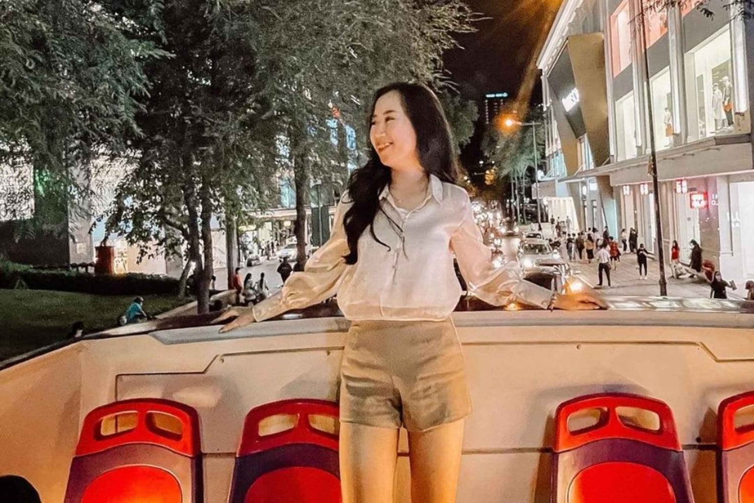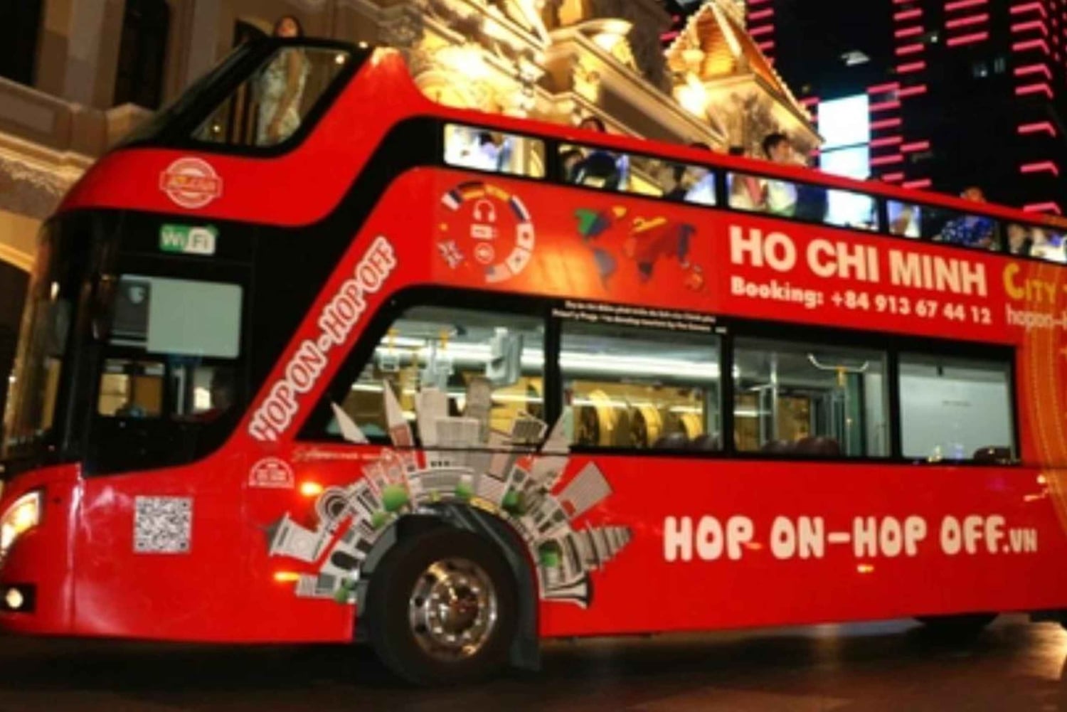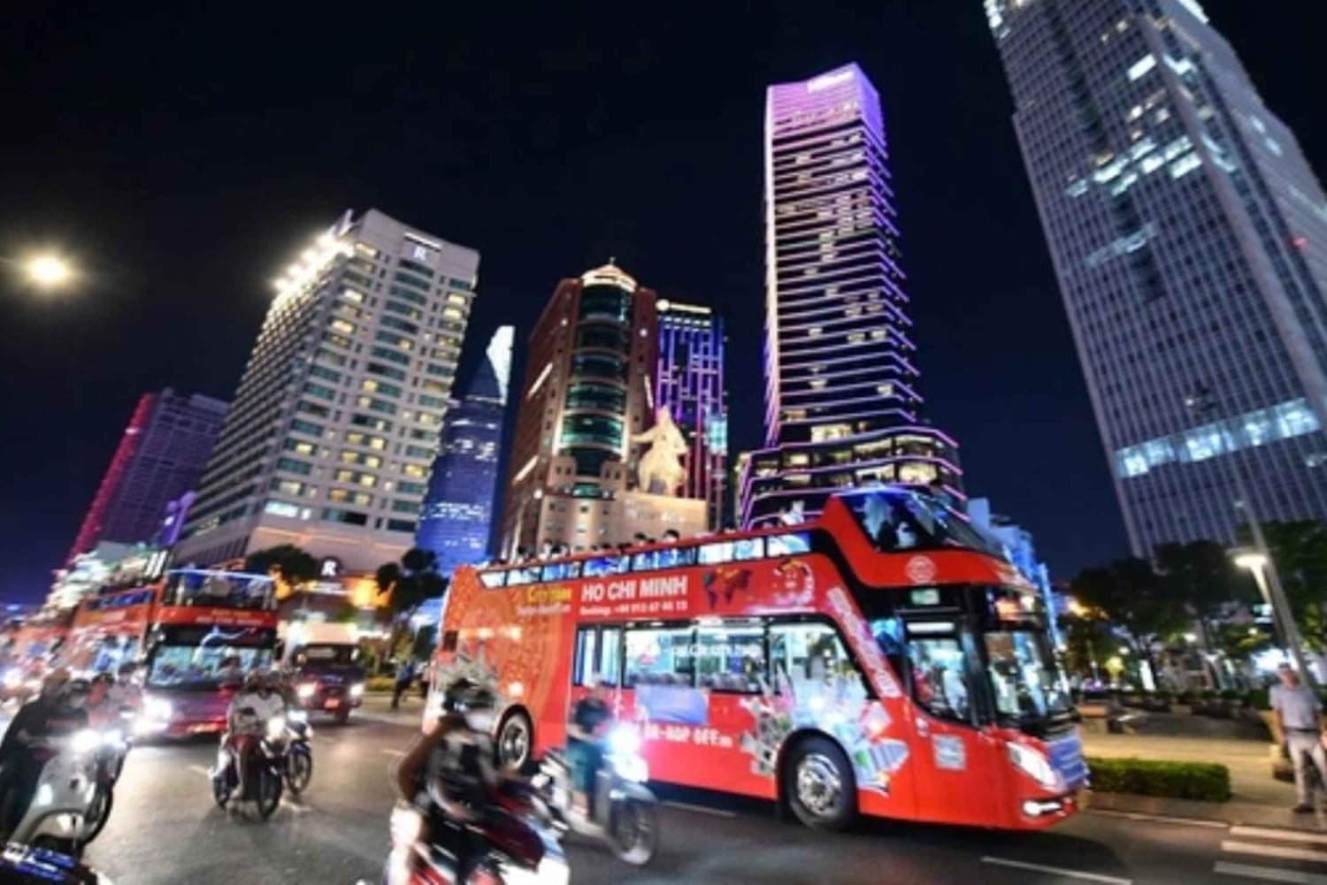 Experience Ho Chi Minh City at night on a double-decker bus. Enjoy panoramic views of iconic landmarks, vibrant streets, and colorful night lights with convenient hotel pickup.