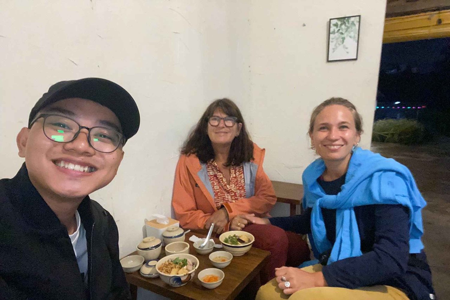 El guía te recogerá en el hotel en moto a las 17:00 para ir a la cafetería de la azotea en el distrito 2. El mejor momento para sumergirte en una vista impresionante desde el atardecer es bajar al río Saigón. Allí, puedes ver la vista completa del edificio más alto de Vietnam (Landmark 81) y decenas de barcos que cruzan el río. Contempla el precioso atardecer con una sabrosa taza de café o té. Luego, pasaremos por muchos cruces y callejones y probaremos decenas de sabrosas comidas locales. 1. Arroz partido: es un plato muy conocido y familiar para todos los vietnamitas, cuyo nombre local es «Cơm Tấm». Cada plato de arroz incluye costillas de cerdo a la parrilla, tortilla, rollitos de primavera y pepinillos. El alma del plato es la salsa de pescado espesa, los pepinillos y el ajo. 2. Pastel Khọt vietnamita: en realidad es un plato, no un pastel. Lleva gambas, cerdo y brotes de soja. Mezclan agua con cúrcuma para hacer harina y luego la ponen en forma de círculo caliente con aceite. El pastel es extremadamente crujiente, colorido y sabroso. Coge una lechuga fresca, papel de arroz y enróllalo. Mójalo en salsa de pescado. 3. Brochetas de cerdo a la parrilla: es una comida callejera familiar de Ho Chi Minh por la noche. Nos sentamos en un taburete y mordemos un trozo caliente de brocheta de cerdo a la parrilla. 4. Carne de res envuelta en hojas de betel (Bò Lá Lốt): es un popular plato vietnamita elaborado con carne de res picada mezclada con especias aromáticas y asada a la perfección. Las hojas de betel le dan a la carne un sabor ahumado y herbal único. A menudo se sirve con fideos de arroz, hierbas frescas y salsa para mojar. 5, Bò Né vietnamita: un plato de carne de vacuno chisporroteante que se sirve en una plancha caliente. Suele llevar rodajas de carne tierna, huevos fritos, paté de hígado, cebolla y, a veces, salchichas o albóndigas. Se sirve muy caliente con un poco de mantequilla y salsa de soja. A menudo, se acompaña con verduras frescas y una crujiente baguette. 6, Sopa dulce con leche de coco (Chè): es un colorido postre hecho de frijoles, gelatina, frutas y arroz glutinoso. La cremosa leche de coco añade un rico y fragante sabor a la dulzura. Se sirve frío o caliente y ofrece un refrescante sabor tropical. 7. Después del tour, el guía te dará un bonito regalo que será uno de tus mejores recuerdos de Ho Chi Minh. El guía te dejará en el hotel Contacta por WhatsApp para obtener un descuentoIncludes
