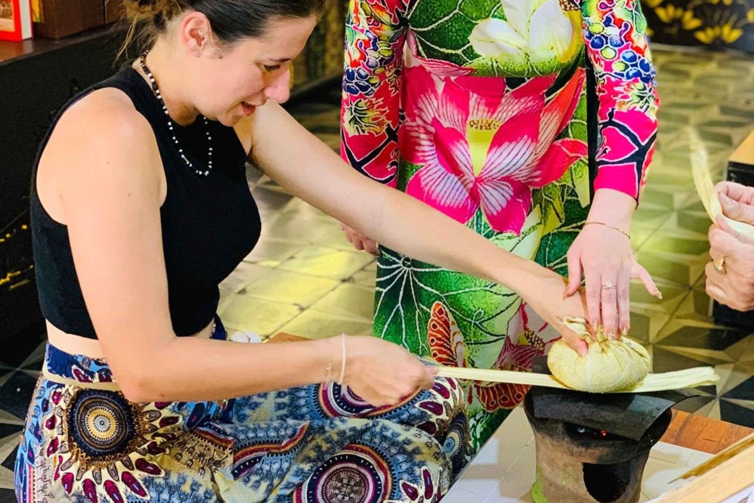 Empieza el día con una experiencia de té en Hiên Trà Nhị Độ Mai, donde la cultura tradicional vietnamita del té se mezcla con un ambiente tranquilo e íntimo, ofreciéndote un comienzo consciente. Luego, visita la icónica Chùa Thiên Mụ, con vistas al río Perfume. Explora la arquitectura antigua y los patios tranquilos que invitan a la contemplación silenciosa. Termina tu día en Không Gian Văn Hóa Lục Bộ, donde el patrimonio, el arte y el espíritu cultural de Hue se despliegan en un encantador entorno histórico. Participa en una experiencia práctica con expertos locales para hacer una flor de papel, una artesanía tradicional que se conserva en algunas casas de Hue. Esta experiencia está diseñada para sumergirte en el ritmo suave de Hue, equilibrando el té, la cultura y la espiritualidad para la paz interior.Includes