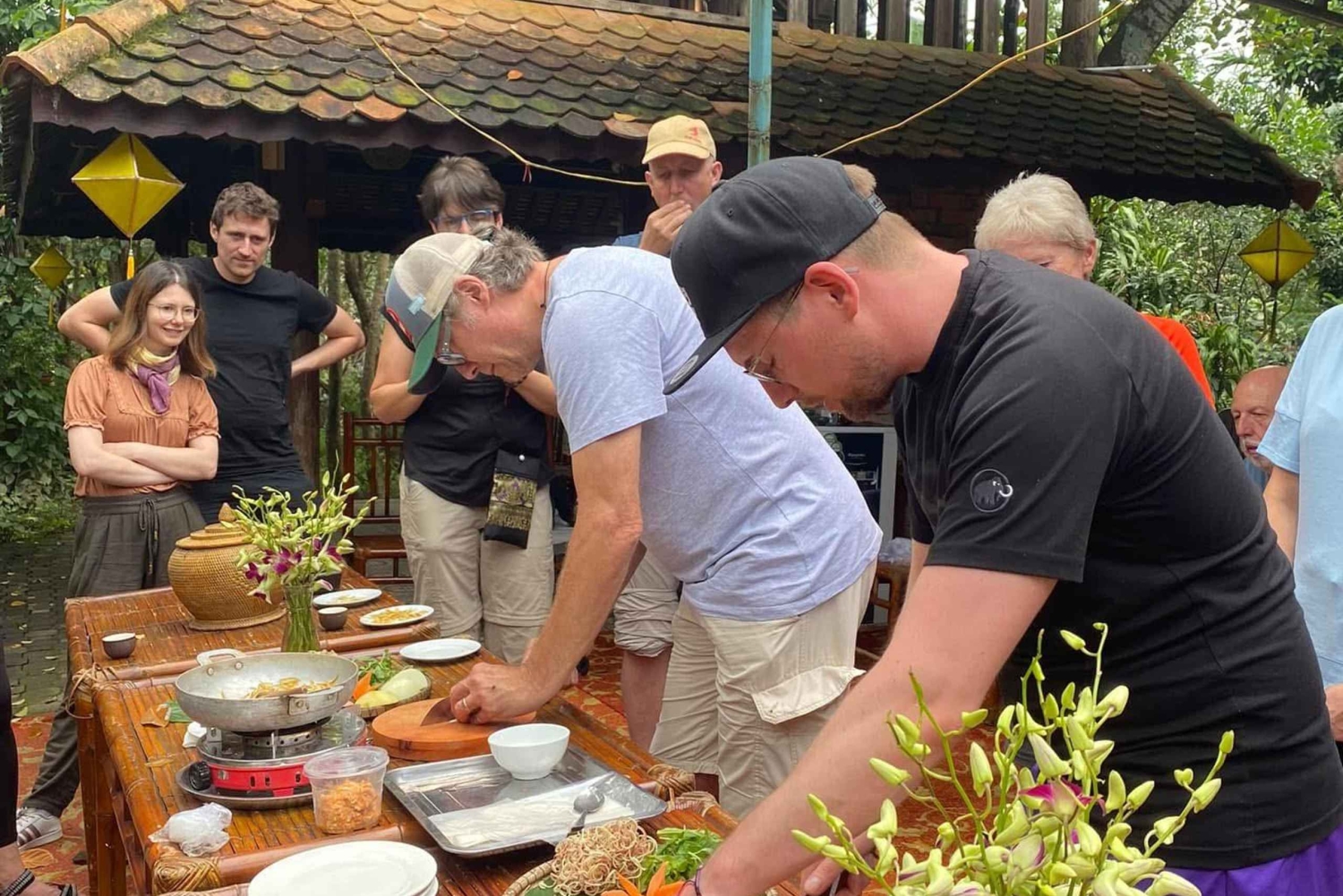 Comienza tu viaje para descubrir tesoros ocultos y el encanto rural de Hue. Explora el monasterio de Thien An, un raro monasterio católico en Vietnam con una elegante arquitectura de inspiración asiática. Enclavado entre verdes colinas de pinos, el monasterio irradia tranquilidad con su brisa fresca y su belleza atemporal. A continuación, dirígete al lago Thuy Tien, situado a unos 10 km de la ciudad. Lo que en su día fue un complejo de ocio, ahora atrae a viajeros aventureros por su inquietante belleza y su atmósfera misteriosa, descrito por HuffPost como un destino «espeluznante pero fascinante». Llegue a la aldea de Thuy Bieu, conocida por sus huertos de pomelos Thanh Tra y sus tranquilas casas con jardín. Recorra en bicicleta los sombreados huertos de pomelos, visite la casa comunal Luong Quan y explore las antiguas casas con jardín Ruong, que muestran la arquitectura única de Hue. Visite un mercado rural local, donde aprenderá sobre los ingredientes cotidianos y la cultura gastronómica local. Participa en una clase de cocina con anfitriones locales y aprende a preparar rollitos de primavera fritos al estilo Hue y mermelada Thanh Tra. Prueba a pintar sobre seda, una artesanía tradicional local transmitida de generación en generación. Disfruta de un tranquilo almuerzo en una casa con jardín centenaria, una de las más emblemáticas de la aldea de Luong Quan. Los platos son preparados con ingredientes locales frescos y limpios por hábiles mujeres de Hue, resaltando los sabores del centro de Vietnam.Includes