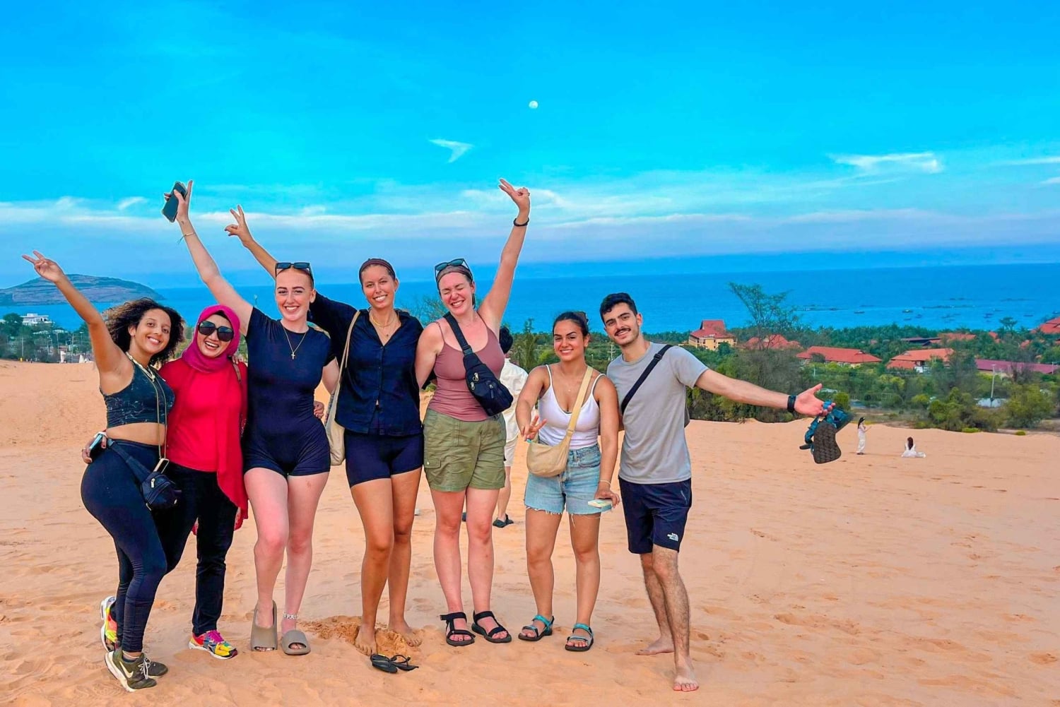 Explora las dunas de arena en este tour privado. Haz un tour privado desde Mui Ne al amanecer o al atardecer y explora las Dunas de Arena Blanca, maravíllate con las Dunas de Arena Roja y admira los colores del sol. Excursión al Amanecer Comienza tu aventura bien temprano con la recogida en tu hotel en un jeep privado. Dirígete a las Dunas de Arena Blanca para contemplar los impresionantes colores del amanecer y disfrutar del hermoso paisaje. Vive la experiencia de conducir un quad ATV por las dunas. El conductor de un quad te llevará a las dunas más altas, se detendrá para ver el amanecer y te llevará al lago de los lotos. Después de una hora, sal hacia las Dunas de Arena Roja. Mientras conduces, detente para hacer fotos del impresionante paisaje playero desde la carretera. Una vez llegues a las Dunas de Arena Roja, tómate un tiempo para disfrutar de las vistas de la playa y la ciudad. A continuación, continúa hasta el cercano pueblo pesquero. Pasea por el pueblo, observa cómo trabajan los pescadores locales y visita el mercado de pescado antes de dirigirte al arroyo de las hadas. Camina descalzo a lo largo del arroyo durante unos 800 metros, contemplando los árboles y la arenisca, y luego regresa a tu hotel. Excursión al Atardecer Comienza tu aventura al atardecer con una recogida en tu hotel por la tarde y dirígete directamente al arroyo de las hadas. Pasa aproximadamente una hora caminando descalzo por el arroyo y haciendo fotos antes de dirigirte al cercano pueblo de pescadores para experimentar el ritmo relajado de la vida local. A continuación, dirígete a las Dunas de Arena Blanca. Pasa alrededor de una hora contemplando el impresionante paisaje. Experimenta un paseo en quad ATV por las dunas. El conductor de un quad te llevará a las dunas más altas, se detendrá para contemplarlas y te llevará al lago de los lotos. A continuación, dirígete a las Dunas de Arena Roja. Por el camino, puedes parar a hacerte fotos con el todoterreno y disfrutar de la hermosa carretera que bordea la playa. Después de llegar, contempla la hermosa puesta de sol antes de regresar a tu hotel.Includes