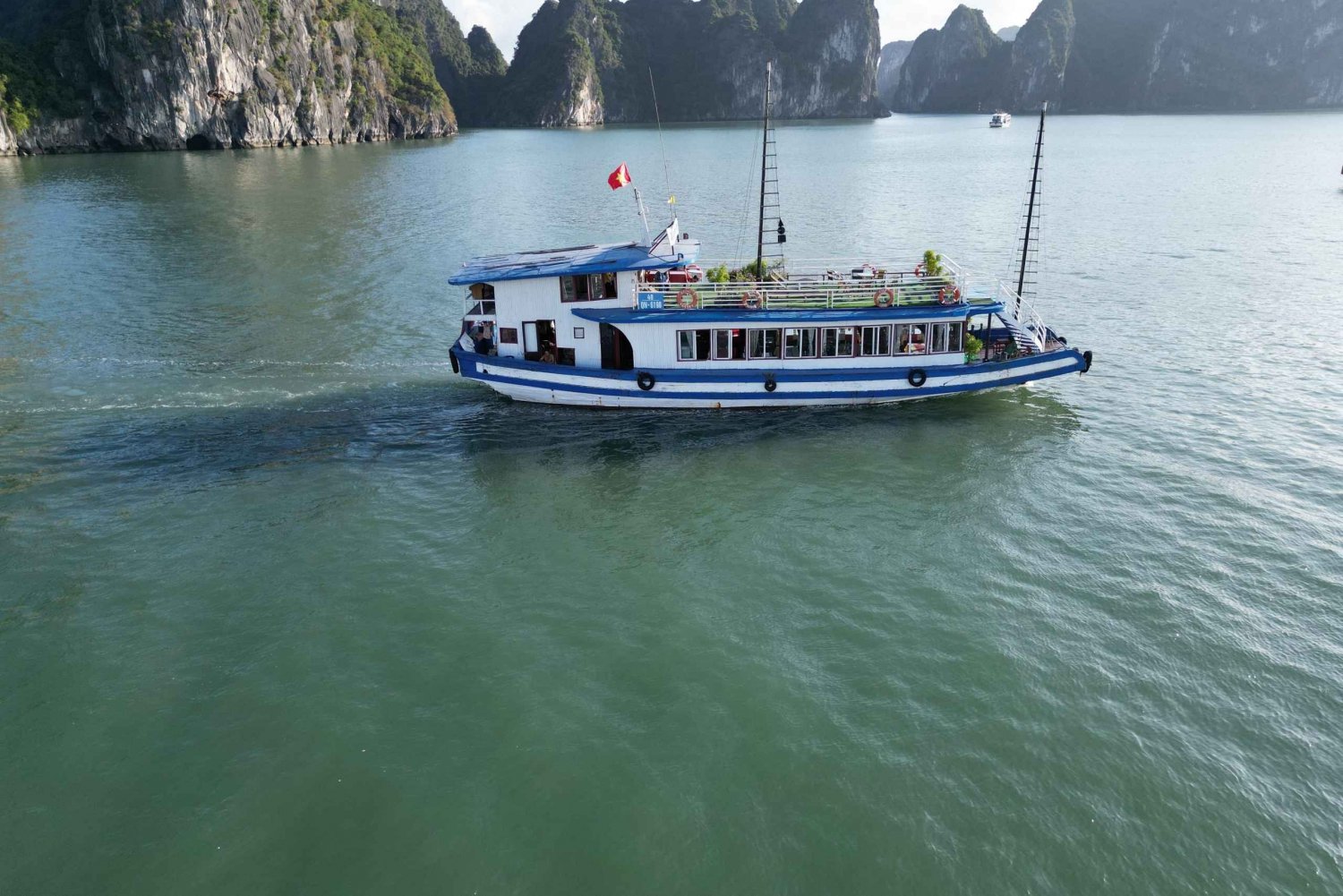 - Pickup at your hotels in Hanoi by our professional driver and tour guide at the time you booked. Enjoy luxury, modern, comfortable round-trip transport from Hanoi by National Expressway through the Red River delta is a great opportunity to see what daily life is like for Vietnamese farmers. Rice fields and water buffalo flank both sides of the road. Take a rest stop at a halfway point before continuing to Ha Long Bay. The most interesting glimpses into rural life come during February and June when whole families are busy transplanting the young rice plants to the growing fields. Arrive at Halong Tourist Wharf. Our cruise team will board you and take you into the bay. On the way out, a fresh seafood lunch (vegetarian option available if requested) will be served. The limestone bedrock and sheer cliffs of the countless islets have inspired local people to come up with equally fanciful names: Stone Dogs Island, Incense Burner Island, and Fighting Cocks Island - the symbol of Ha Long Bay. You will then head on to Thien Cung Grotto (Heavenly Palace Grotto), a magnificent and otherworldly cave. Explore its huge chambers adorned with stalactites and stalagmites of all kinds. It's most impressive with four holy animals: dragon, unicorn, turtle, and phoenix, and a magic heaven gate. Cruising to the floating village, where you will enjoy 40 minutes of Kayaking or Bamboo boating around the islands and water tunnels and bask in the charm of this natural paradise. After 4 hours of cruising, you will be brought back to the Halong tourist wharf, where your vehicle will be waiting to take you back to Hanoi.Includes