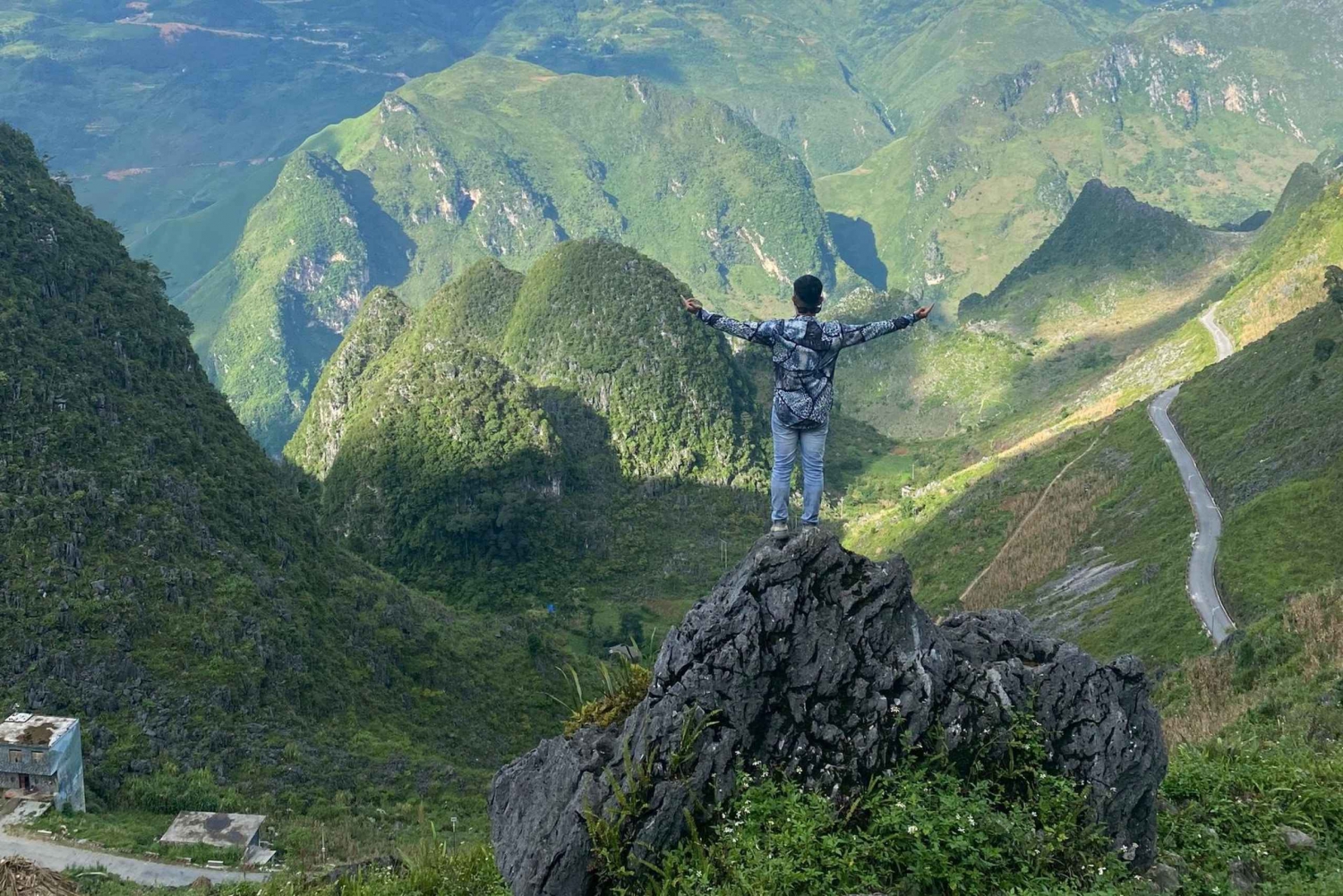 Day 1: Ha Giang – Quan Ba – Du Gia . + Have Breakfast : 7:30am + Departure Time : 8:30am + Distance : Approximately 100km ( 4 – 5 hours on the way ) + Highlights of the trip : - Bac Sum Slope – Quan Ban Heaven Gate - Lung Tam Linen Weaving Village - Du Gia WaterFall + Checkin Homestay – Lolo Homestay ( Tay People ) + Family dinner together with local dishs and happy water + Free time : karaoke , dancing , sharing stories … etc . Day 2 : Du Gia – Meo Vac – Dong Van . + Have breakfast at homestay : 7:30am + Hit the road : 8:30am + Distance : Approximately 100km ( 4 – 5 hours on the way ) + Highlights of the trip : - Nho Que River - Tu San Canyon - Ma Pi Leng Pass - Fair Market Meo Vac ( Only Sunday ) . + Checkin Homestay – Dong Van Homestay + Family dinner together with local dishs and happy water + Free time : karaoke , dancing , sharing stories … etc . Day 3 : Dong Van – Yen Minh – Ha Giang . + Have breakfast at homestay : 7:30am + We will be on the road : 8:30am + Distance : Approximately 160km ( 6 – 7 hours on the way ) + Highlights of the trip : - H’Mong King Palace – Sung La Valley - Bac Sum Slope – Can Ty Slope + Arriver to Ha Giang City at between 15h00 or 15h30Includes