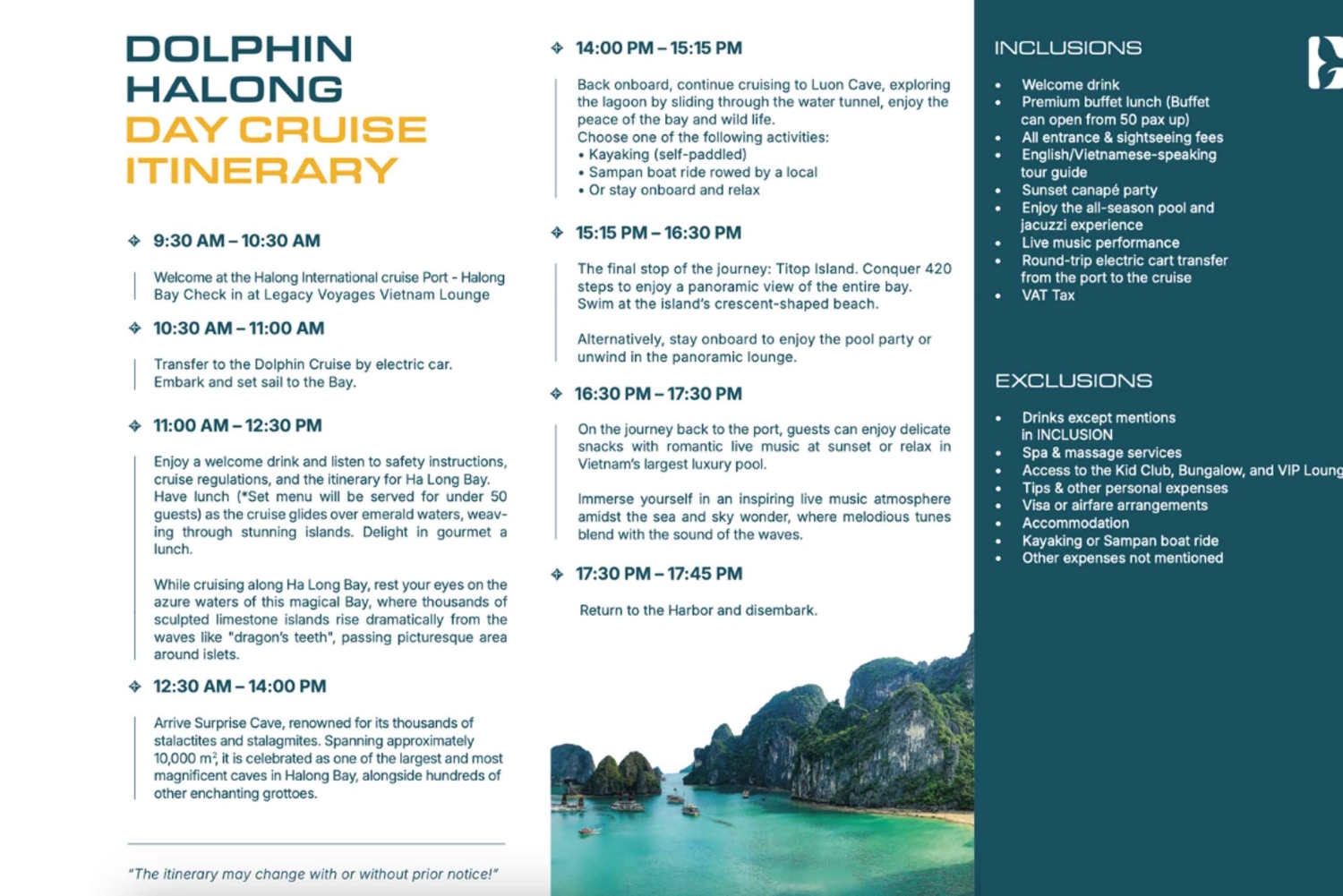 Sightseeing cruise on Dolphin Halong Visit to Sung Sot Cave Kayaking at Luon Cave (extra kayak fee) Stop at Titov Island Canapé party on Upper DeckImportant Information