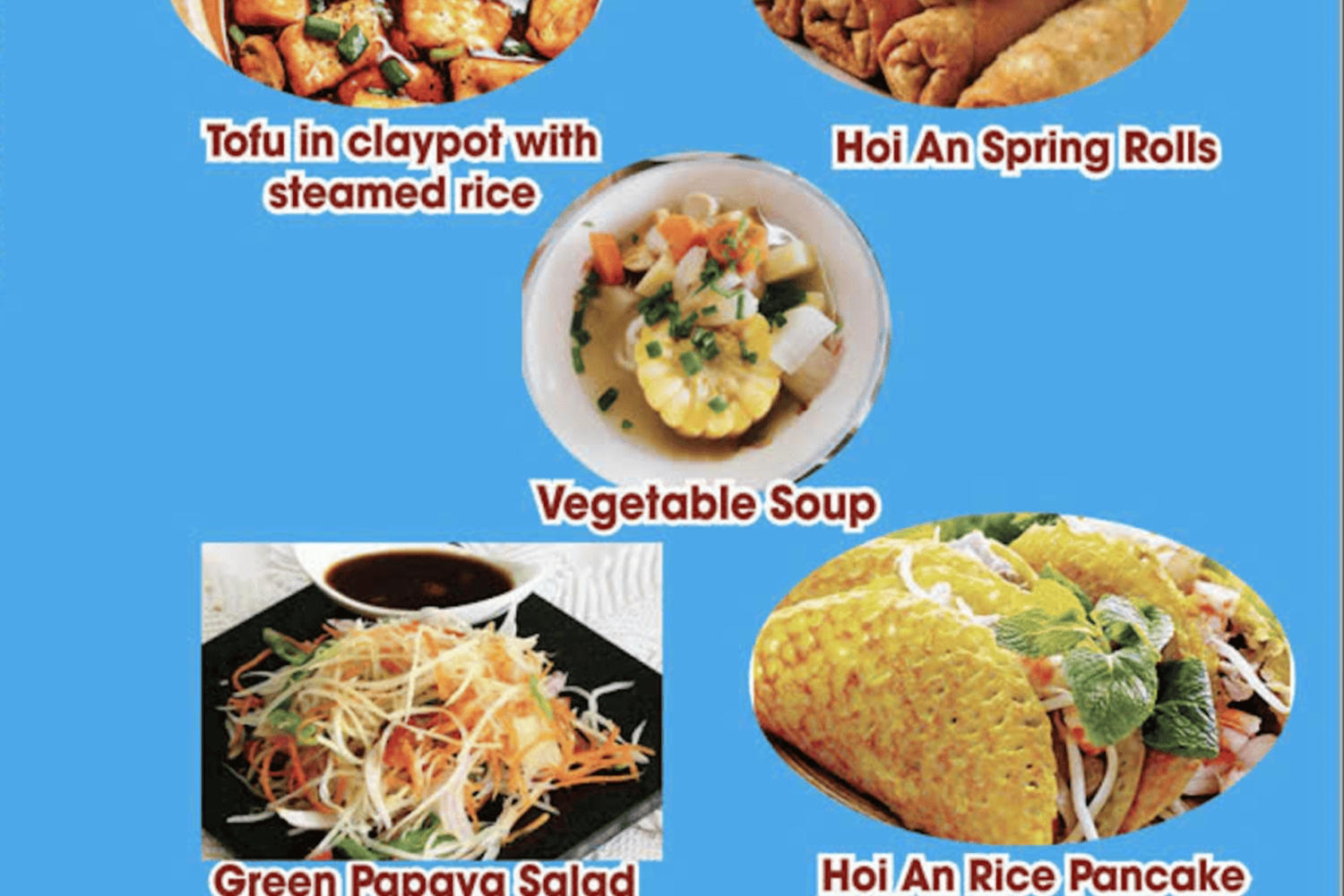 - The operator will contact you from 16:00-20:00, one day in advance, to reconfirm the meet-up time and location Vegetarian menu is available as per requested You can pick the menu that you will be served on the participation date on check-out page Beside your 5-course cooking class cuisines, the operator will prepare 3 more dishes (Sauteed garlic spinach, steamed rice & dessert) Free for 01 child/booking aged 0-4 as long as they will not occupy separate seats. A child ticket will be required for each additional child