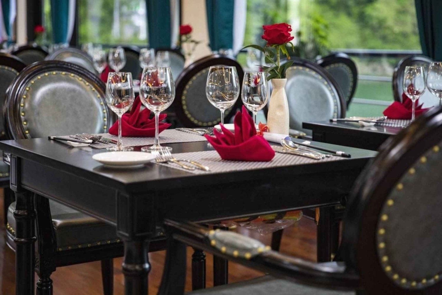Jour 1 : Hanoï - Tuan Chau - Lan Ha 08h00 : Prise en charge à Hanoï Votre voyage débutera par un confortable transfert en limousine depuis le quartier historique de Hanoï (service de transfert sur réservation). Installez-vous confortablement dans les sièges en cuir et admirez le paysage. 11h30 - 12h00 : Arrivée Veuillez vous enregistrer au salon, puis embarquer à bord de votre bateau de croisière de luxe. Une boisson de bienvenue et une serviette chaude pour se rafraîchir vous attendent. 12h30 : Déjeuner À mesure que le navire s'enfonce dans la baie d'Halong, les falaises calcaires émergent des eaux émeraude dans un silence quasi total, loin des itinéraires fréquentés d'Ha Long, rendant votre voyage à la fois intime et extraordinaire. Profitez d'un déjeuner gastronomique. 15 h 00 : Grotte du Sombre et de la Lumière Explorez la grotte en kayak ou en bateau en bambou. Le paysage mêle les teintes de la mer, du ciel et des arbres, laissant les visiteurs fascinés comme s'ils étaient tombés sur un paradis mythique. 17h00 : Temps libre Rafraîchissez-vous dans la piscine saisonnière, sirotez un cocktail au bar de la piscine ou détendez-vous sur la terrasse panoramique au coucher du soleil. 18h00 : Cours de cuisine vietnamienne Rejoignez le chef pour apprendre à préparer des rouleaux de printemps traditionnels avec des légumes frais. 19h00 : Dîner à bord Laissez-vous tenter par les saveurs vietnamiennes et internationales dans un cadre élégant. Si les fruits de mer ne sont pas votre choix préféré ou si vous avez des exigences alimentaires particulières, nous nous adapterons à vos besoins. 21 h 00 : Choisissez votre propre rythme : profitez de la musique au bar, détendez-vous avec un massage, entraînez-vous à la salle de sport ou chantez au karaoké. Jour 2 : Lever du soleil - Kayak - Hanoï 06h00 : Séance de Taï Chi matinale Réveillez-vous au son des vagues douces contre la coque, ouvrez la porte de votre balcon et profitez de l'air frais et de la brise matinale. Éveillez votre corps avec une séance de Tai Chi sur le pont du bateau ou plongez dans la piscine saisonnière tandis que le soleil se lève sur les sommets calcaires. 07h00 : Petit-déjeuner léger Café, thé et pâtisseries frais servis dans la salle à manger. 07h45 : Lagon d'Ao Ech / Baie de Lan Ha L'exploration de la région en kayak vous offrira des expériences uniques : vous pourrez observer de près l'imposant karst calcaire, naviguer lentement à travers plusieurs grottes et lagons cachés, inaccessibles aux grandes croisières, ou vous baigner dans des eaux claires, calmes et étincelantes. 9 h : retour à bord du bateau Veuillez préparer vos bagages et profiter de vos derniers instants sur le pont. 09h30 : Brunch Un repas d'adieu est servi tandis que le navire retourne lentement au port. 10 h 45 - 11 h : Débarquement Veuillez saluer l'équipage avant de retourner sur la terre ferme. 11h30 : Arrivée à la salle d'attente de la croisière. Poursuivez votre voyage vers Hanoï. Fin de l'excursion.Includes