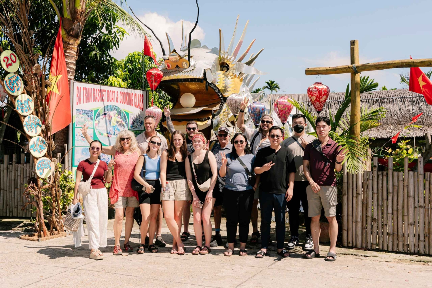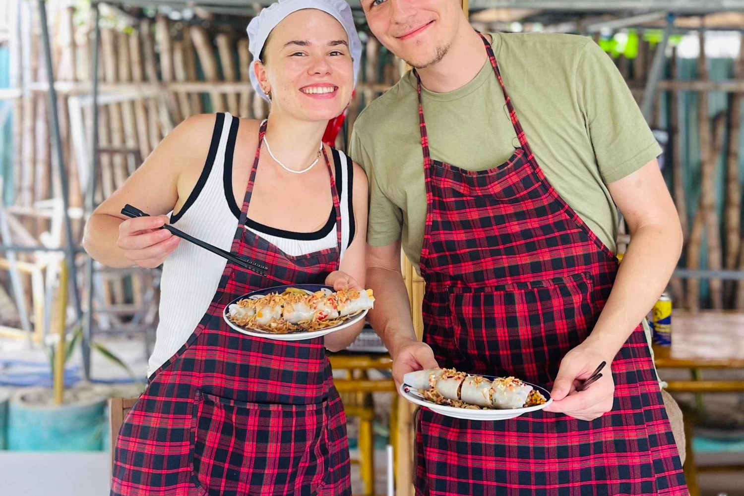 - Tout d'abord, nous nous rendons au marché central de Hoi An pour acheter les matières premières nécessaires à votre cours de cuisine. Vous pourrez apprécier l'effervescence du marché matinal et avoir l'opportunité d'un contact direct avec les vendeurs. Nos guides touristiques vous présenteront les ingrédients nécessaires pour les cours de cuisine. Ensuite, nous nous rendrons à la Forêt de Noix de Coco, un site historique de Hoi An. Nous explorons la jungle de cocotiers à bord d'un bateau traditionnel local appelé Bateau-Panier en Bambou. Nous avons l'occasion de capturer de minuscules crabes, de prendre des photos, de faire du tourisme et même de faire tourner les petits bateaux... Après la promenade en bateau, nous commençons notre cours de cuisine pour préparer des plats traditionnels vietnamiens : Pho Bo (soupe de nouilles au bœuf), Banh Xeo (crêpe frite vietnamienne), Banh Cuon (rouleau de riz à la vapeur) et Che (soupe aux haricots mungo). Savourez les plats que vous aurez préparés vous-même. - Pour terminer, nous serons transférés à l'atelier de fabrication de lanternes dans la vieille ville de Hoi An, où vous pourrez fabriquer votre propre lanterne à la main, un souvenir unique de Hoi An.Includes