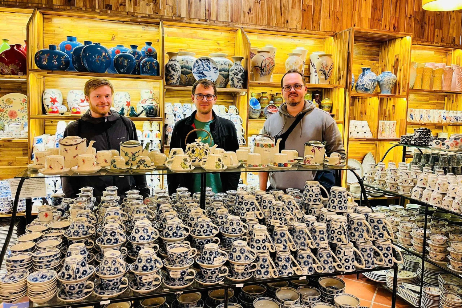 Commencez votre aventure dans la vieille ville animée de Hanoï, en naviguant à travers ses rues étroites et ses marchés animés. Passez devant des lieux d'intérêt célèbres tels que l'Opéra de Hanoï, le Mausolée de Hô Chi Minh et le Lac de l'Ouest. Rendez-vous à la périphérie de Hanoï, où vous pourrez admirer des vues pittoresques sur les rizières, les petits villages et la végétation luxuriante. Explorez le célèbre village de céramique de Bat Trang, réputé pour ses traditions de fabrication de poterie remontant au XVe siècle. Vous avez la possibilité de participer à un cours pour créer vos propres objets, tels qu'un bol ou une tasse, qui porteront votre touche personnelle. Échangez avec les habitants, visitez des villages traditionnels et découvrez leur vie quotidienne et leurs coutumes. Savourez de délicieux mets locaux dans un restaurant local. Montez à bord d'une Jeep Légende de l'Armée Populaire du Vietnam, offrant une manière nostalgique et authentique de découvrir la ville et ses environs.Includes