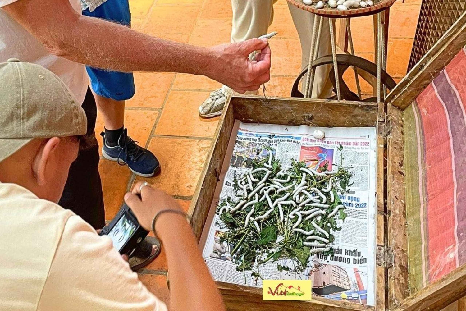 1. Chute d'eau de Pongour La cascade de Pongour, également connue sous le nom de 7 cascades, est la plus belle chute d'eau des hauts plateaux du centre. Elle est située dans le district de Duc Trong, à environ 50 km au sud de la ville de Da Lat, sur la route nationale 20. 2. La cascade de l'éléphant : L'une des chutes d'eau les plus puissantes de Dalat, découvrez la grotte venteuse sous la chute d'eau. ***En raison d'un problème de fonctionnement, la cascade de l'Éléphant est temporairement fermée. Cependant, vous pouvez toujours profiter de la vue sur cette chute d'eau à couper le souffle depuis la pagode Linh An (à une courte distance). 3. Pagode de Linh An La pagode Linh An, située à 33 km de la ville de Dalat, est devenue un lieu de visite attrayant pour de nombreux visiteurs. 4. Soie Cuong Hoan L'usine de tissage de la soie de Dalat est un lieu intéressant à visiter, pour voir l'ensemble du processus, du cocon au tissu. C'est la seule usine de soie du pays qui conserve l'ancienne méthode d'extraction de la soie des cocons. Les cocons sont trempés dans de l'eau chaude et le fil délicat est enroulé sur une machine qui défait le cocon. Le fil est ensuite enroulé sur une bobine, qui est utilisée sur un grand métier à tisser, pour le tisser en un tissu aux motifs délicats. 5. Ferme de grillons de Thien An Les touristes qui viennent ici sont guidés avec enthousiasme par le propriétaire de la ferme sur la façon d'élever des grillons, de les soigner, de les élever... En outre, les visiteurs peuvent également déguster des plats préparés à partir de grillons. 6. Plantation de café Me Linh Située à environ 23 km du centre de Da Lat, au sud-ouest, il faut traverser le magnifique col sinueux de Ta Nung. La plantation de café Me Linh vous permettra de déguster le café weasel original (autosuffisant), 7. Tricotage de bambou 8. Village de fleursIncludes