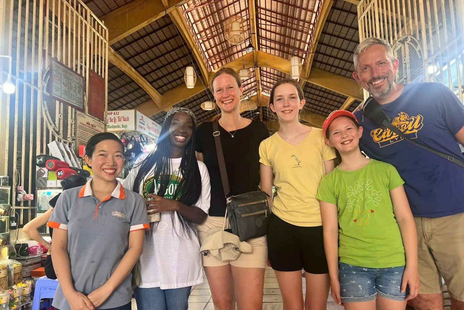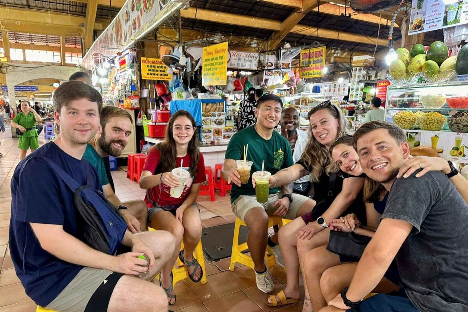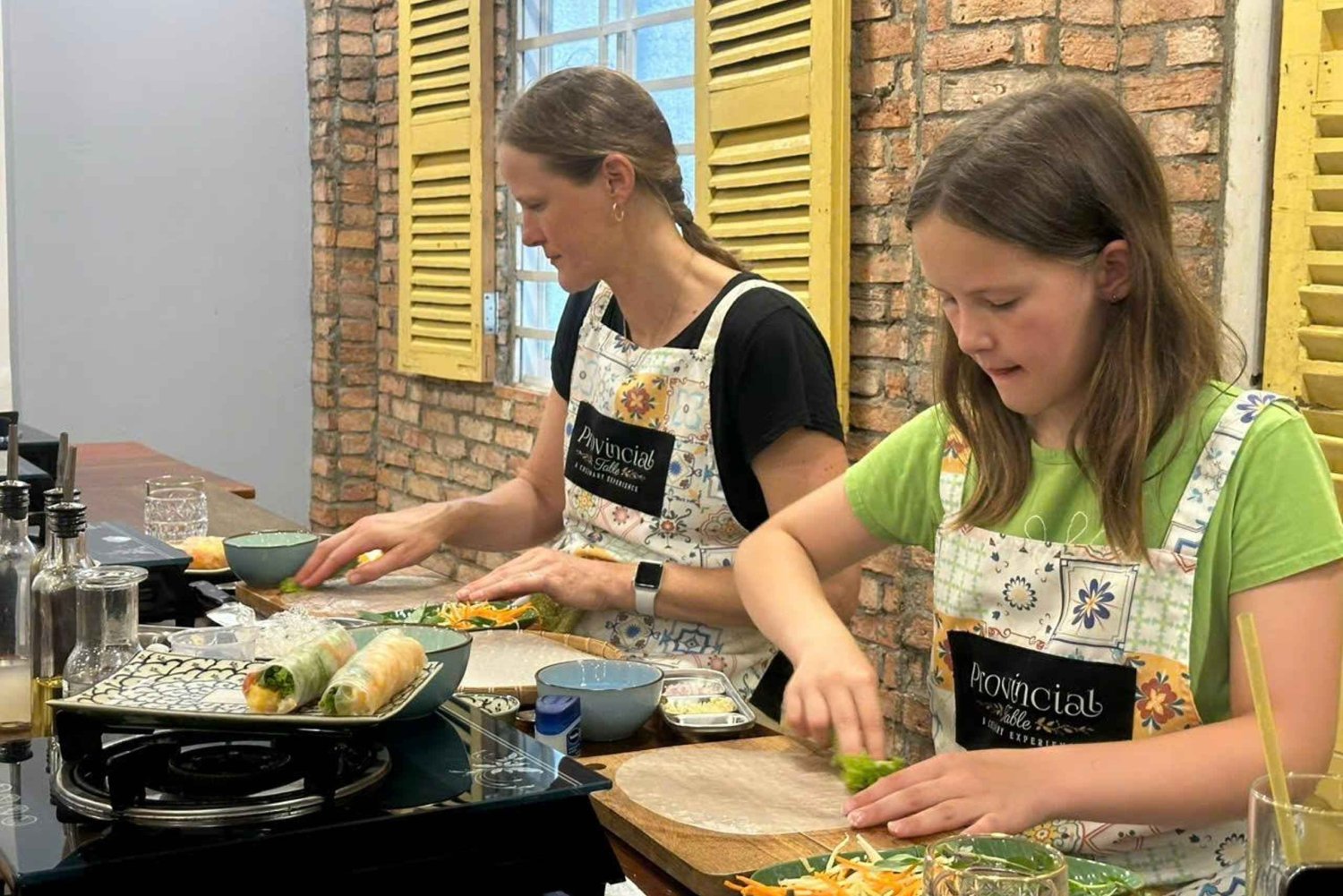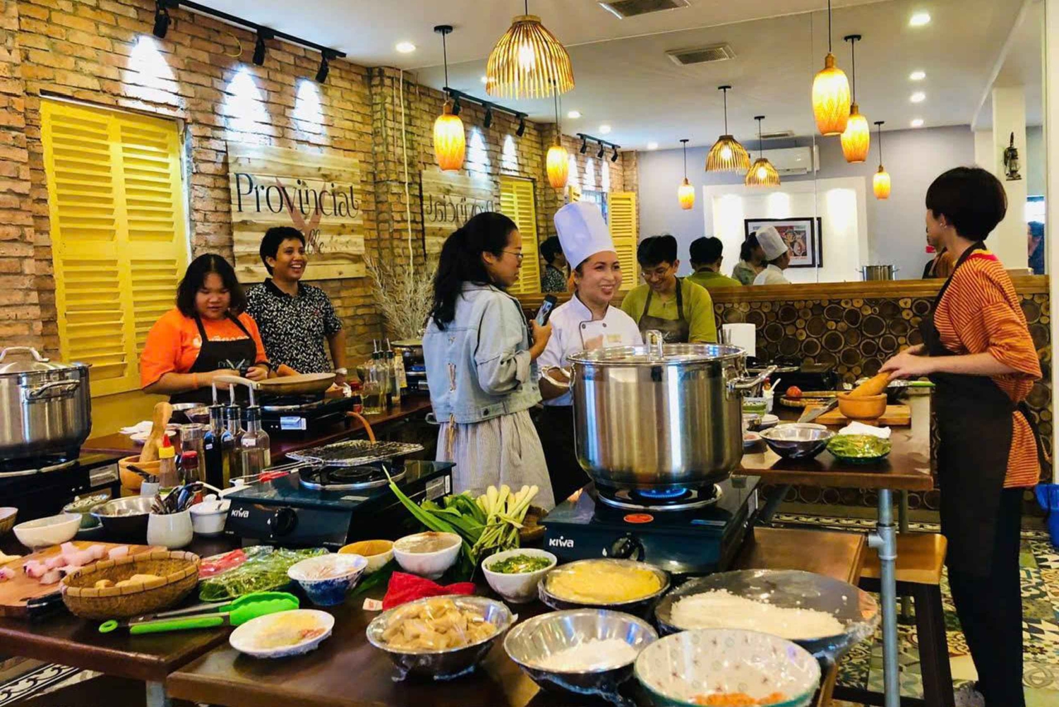 Corso di cucina guidato di 3 portate + dessert e tour del mercato tradizionale: TOUR DEL MERCATO: Il nostro tour guidato al mercato più iconico di Saigon, Cho Ben Thanh, offre una panoramica su come acquistiamo carne e verdure ogni giorno. Ogni visitatore ha l'opportunità di sperimentare in prima persona i vivaci e affollati mercati che continuano a far parte della vita quotidiana del popolo vietnamita. Unisciti a noi nelle nostre strutture, dove i nostri chef ti guideranno attraverso un pasto di quattro portate completamente interattivo. A ogni ospite viene assegnata una postazione di cucina privata e vengono forniti gli ingredienti necessari per perfezionare un menu meticolosamente curato di piatti classici vietnamiti. Aggiungi nuove ricette e tecniche al tuo repertorio culinario, mentre scopri in prima persona la cultura e il patrimonio che stanno dietro alla cucina vietnamita.Includes