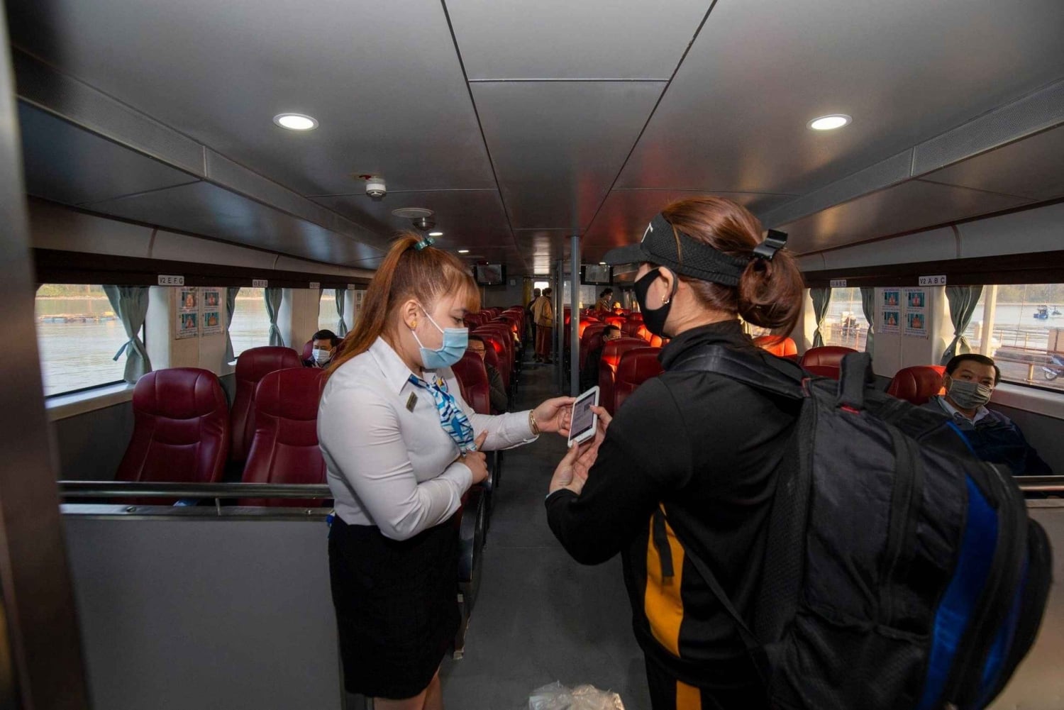 - 出発港:フーコックエクスプレスはチャン・デ・フィッシング港(ソクチャン)から、スーパードンはソクチャンターミナルから出発いたします。ご予約の際に、事業者と港をご確認ください。 到着:出発の45〜60分前にお越しください。 ベン・ダム港(コン・ダオ)へお越しください。 天気:2時間の外洋横断です。11月から3月は荒海が一般的です。ご予約前に天気予報をご確認ください。 船酔い:公海では船酔いする可能性があります。薬の服用をご検討ください。座席はリクライニングタイプです。 座席:足元にゆとりのある、ソフトなリクライニングバスの座席です。デッキへのアクセスには、上の座席をお選びください。 デッキ:バックデッキは写真撮影のために開放されています(最初と最後の15〜20分は閉鎖され、荒れた状態です)。エアコンは冷たくなります。 船内:WiFi、USB充電ポート、テレビ、軽食バー、トイレをご用意しております。飲み物や軽食をご用意しております(無料または有料)。 荷物:スペースは限られております。自転車/バイクは持ち込みできません。 定員:250~500名様です。 観光シーズンは事前予約をお願いいたします。