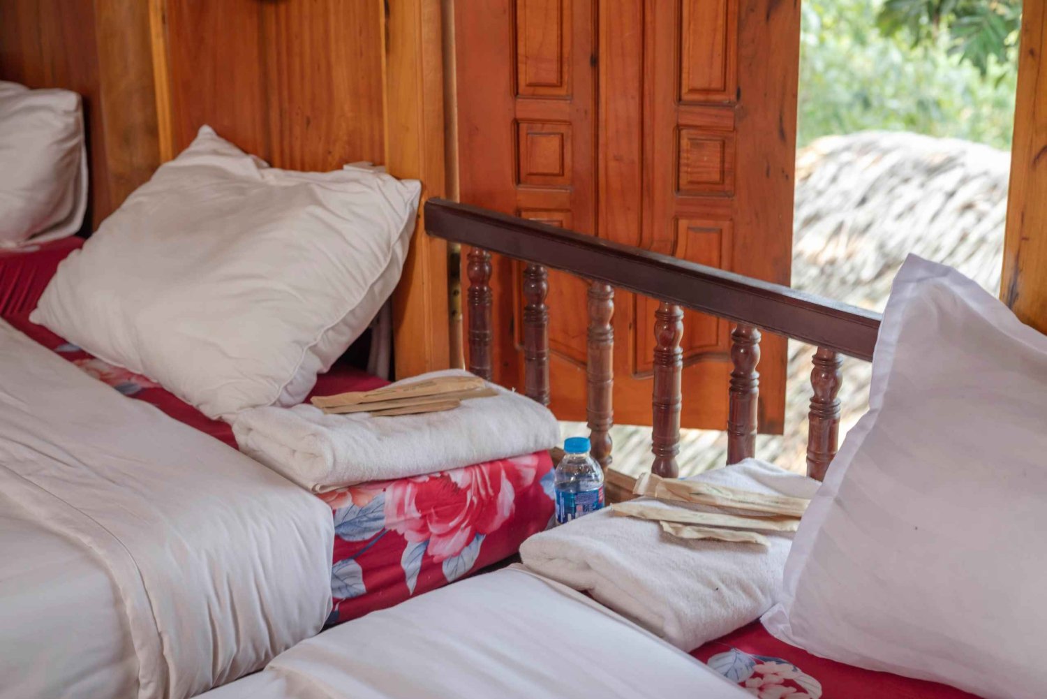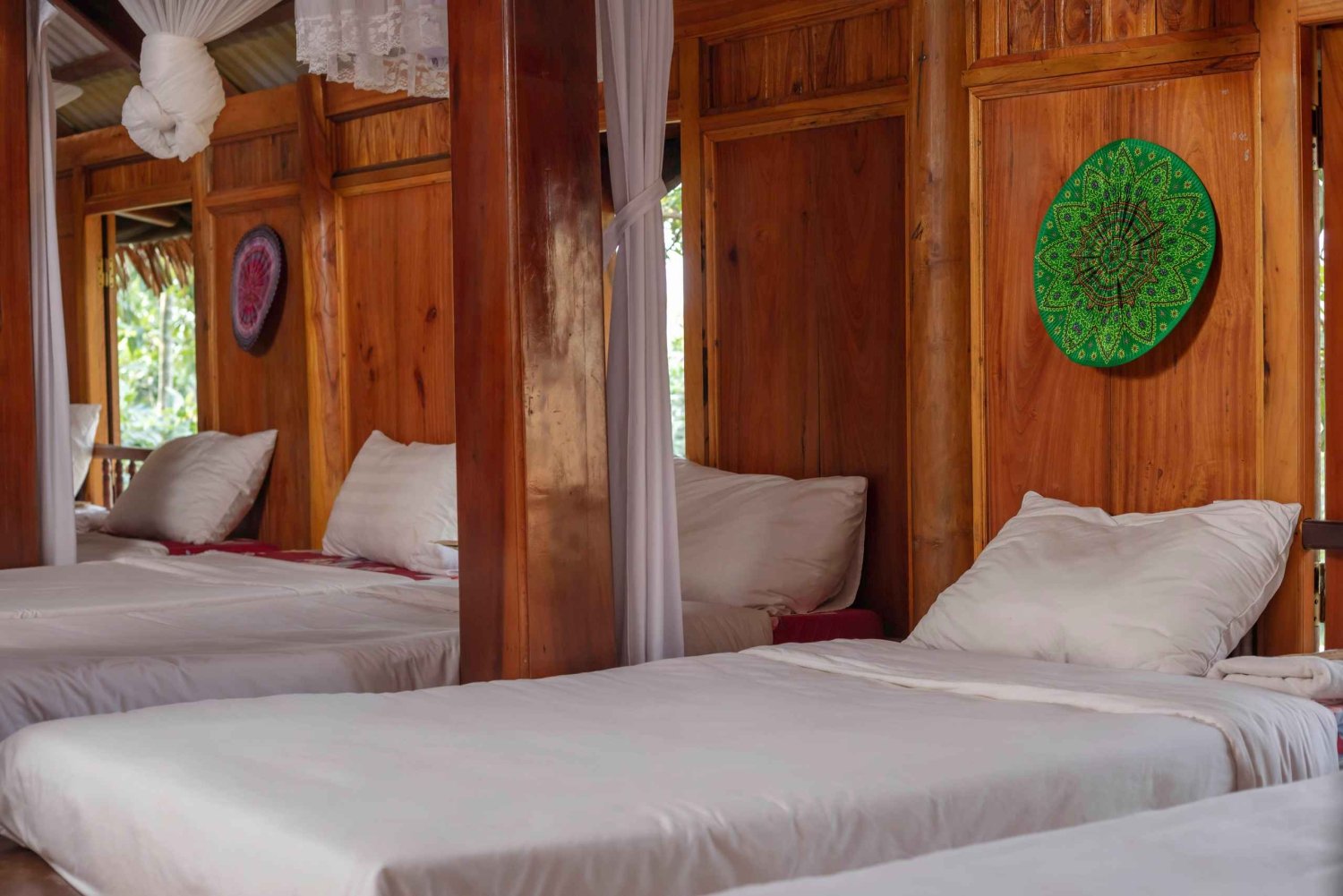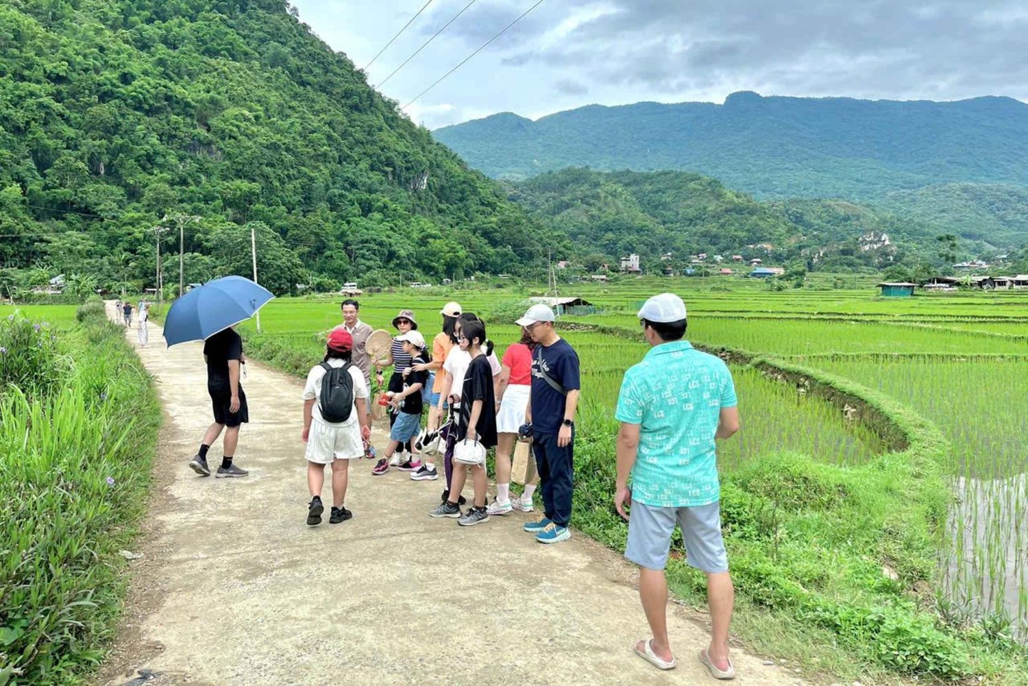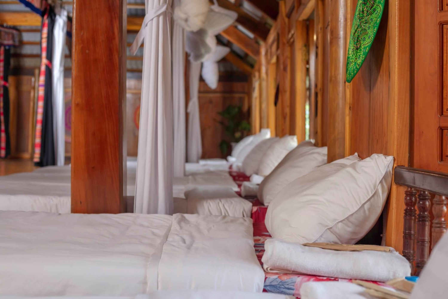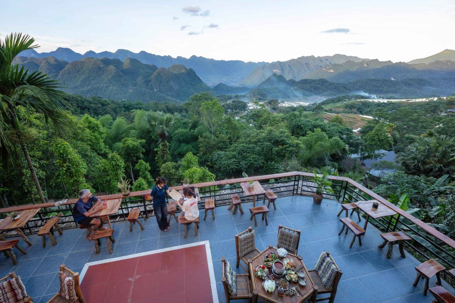 1 日目: ハノイ – プルオン (昼食 - 夕食) 村の生活 | 水車 | ラフティング 07:00 AM: 旧市街エリアのホテルにお迎えに上がります。渋滞がなければ、車で 4 時間かかります。 10:00 AM: 旅の途中で 15 分間休憩します。途中、絵のように美しい村の風景をお楽しみください。 12:00 PM: プルオン自然保護区に到着。地元のレストランで昼食をとります。予約した部屋にチェックインし (標準チェックイン時間は 14:00)、自分のペースでリラックスしてください。 01:30 PM: 午後はゆっくりと散歩します。 バンコンに移動し、2.5 km の散歩を始めます。吊り橋を渡って、最大の川が流れるプルオンで最も美しい村の 1 つに到着します。川沿いで、素晴らしい風景、田んぼ、村の生活を眺めます。ベトナムの山岳少数民族の驚くべき創造物である巨大な水車を探しましょう。難易度レベル 2/5。 チエウラウダムに到着し、竹のラフティング体験に乗り出します。地元の人々と一緒にラフティングを漕いで上流へ向かい、楽しみましょう。 午後 3:00: ラフティングは川の反対側に着きます。田んぼや村々を通る 2 km のトレッキングに乗り出し、ループ トレイルを完了します。幹線道路で送迎車と待ち合わせ、午後 5:00 までにホテルに戻ってリラックスします。 夜: 料理の探索とレジャー ご希望の場合はオプションの料理教室に参加できます。午後 7:00 においしいディナーを楽しんだ後、リラックスする自由時間があります。これでプルオンでの 1 日目は終了です。 2 日目: プルオン – ハノイ (朝食 - 昼食) 象徴的な棚田 | 地元の錦織 午前 7:00: 朝食を楽しみ、その日のアクティビティの準備をします。午前 8:30 までに準備を整えてください。 午前 8:45: 谷をゆっくりと歩いて、プルオンの中心地として知られるドン村まで行きます。この地域は、広大な段々畑を通る緩やかな道が自慢です。一歩進むごとに、魅惑的な風景の変化を目にすることでしょう。歩き続けると、ウオイ村に出会います。上から見ると、この村はそびえ立つ山のふもとにひっそりと佇んでいます。この風景は視覚的にも楽しいものであり、その美しさで携帯電話のメモリ カードがいっぱいになるかもしれません。 丘を下ってラン村に向かいます。この村は「プルオンのタイ人の王国」とも呼ばれ、約 100 世帯のタイ人が住んでいます。自転車でゆっくり走る (オプション) か、のんびりと散歩することもできます。ここでは、涼しい小川、緑豊かな農地、池で楽しそうに泳ぐアヒル、そしてフレンドリーな地元の人々の日常生活など、心安らぐ光景に出会えます。素朴で謙虚な彼らの日常の活動を観察する機会があり、特に伝統的な錦織りに焦点を当てています。この時間を利用して地元の人々と交流し、彼らの工芸品について学んでください。その後、11:30 までに部屋をチェックアウトし、昼食をとります。 午後 1:00: ハノイへのバスの旅の準備をします。渋滞がなければ、午後 6:30 までにハノイのホテルに到着する予定です。ツアーはハノイのホテルで終了します。Includes
