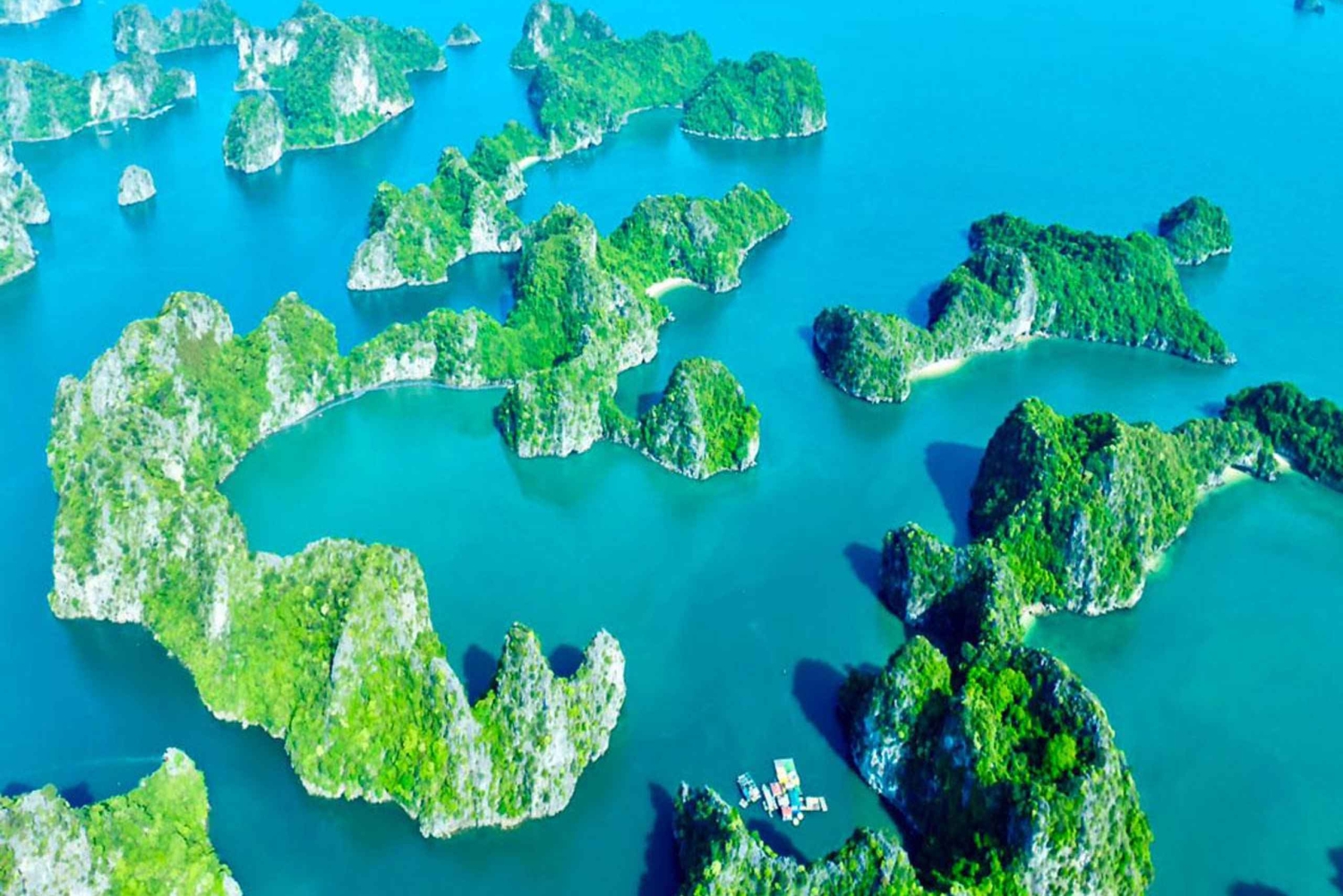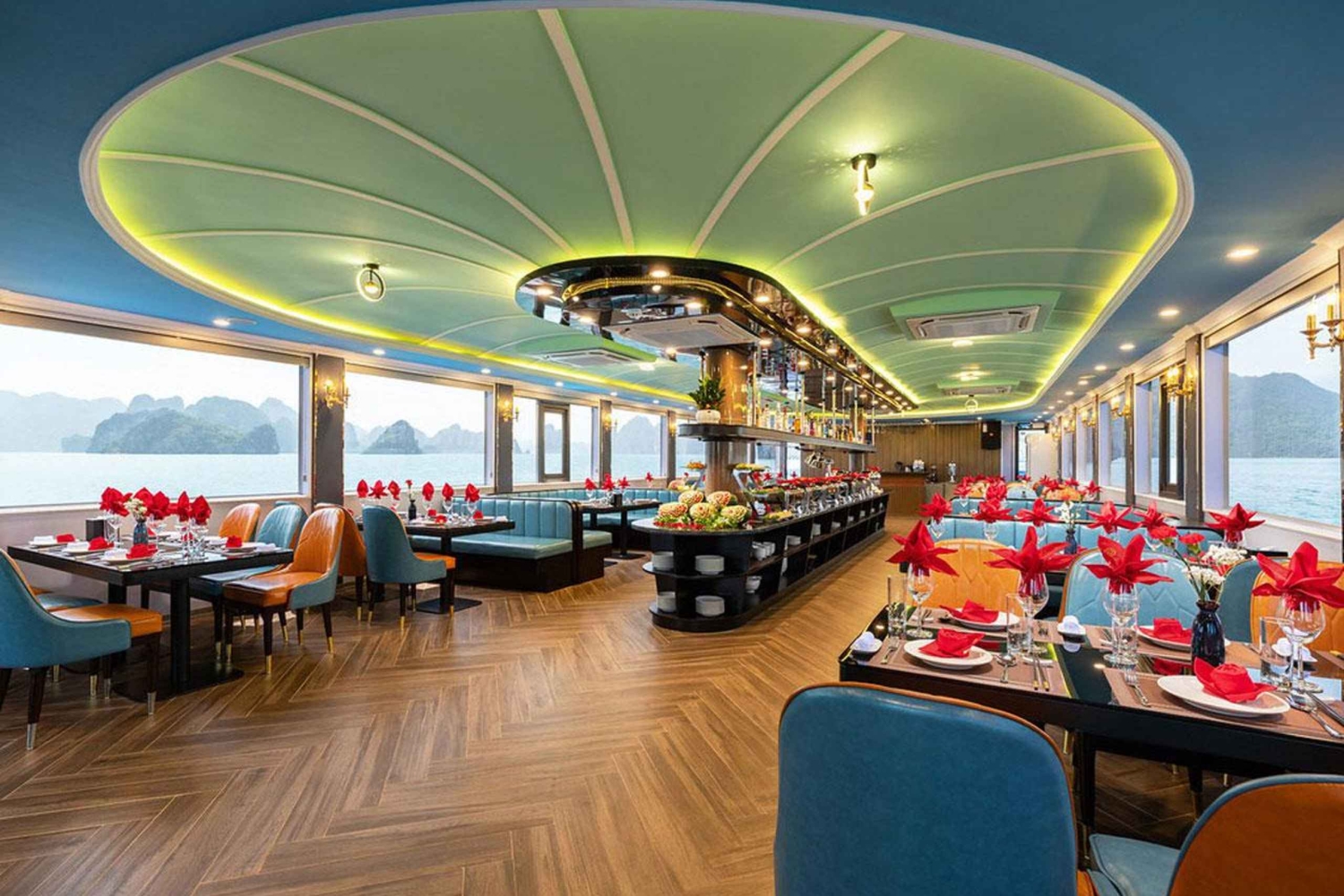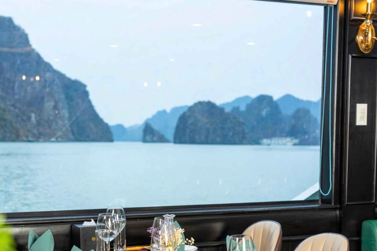 ハノイのホテルへお迎えにあがり、ハロン国際港までモダンなリムジンでゆっくりとお移動ください。到着後、港でチェックインし、船上でドリンクと冷たいタオルサービスをご用意しております。 バイ・トー山、マンヘッド島、マットキイ島をクルーズしながら、ハロン湾の最高のシーフードを使った5つ星のビュッフェ式ランチをお召し上がりください。次に、ハロン湾で最大かつ最も美しい洞窟の1つであるスンソット(サプライズ)洞窟に向かいます。この洞窟には、きらめく鍾乳石と自然の造形がたくさんあります。 次に、ルオン洞窟でカヤックまたは竹ボートツアーのいずれかをお選びください。ご自身でパドルを漕ぐか、現地の漕ぎ手に案内してもらい、石灰岩のトンネルを通り抜けて、崖に囲まれた静かなラグーンに向かいます。近くにサルがいるかもしれません。 その後、ティトップ島へ向かうか、ジャグジーでリラックスしていただけます。水泳を楽しんだり、頂上までハイキングしてパノラマの景色を眺めたり、船上のジャグジーでリラックスしながらハロン湾の自然の美しさをお楽しみください。 最後に、湾に沈む夕日を眺めながら、無料のお茶、ジュース、フルーツ、ペストリーをお楽しみください。オーロラの専用フライカムサービスで、その瞬間を捉えてください。ハロン国際港に戻り、下船後、ハノイのホテルまでお送りいたします。Includes