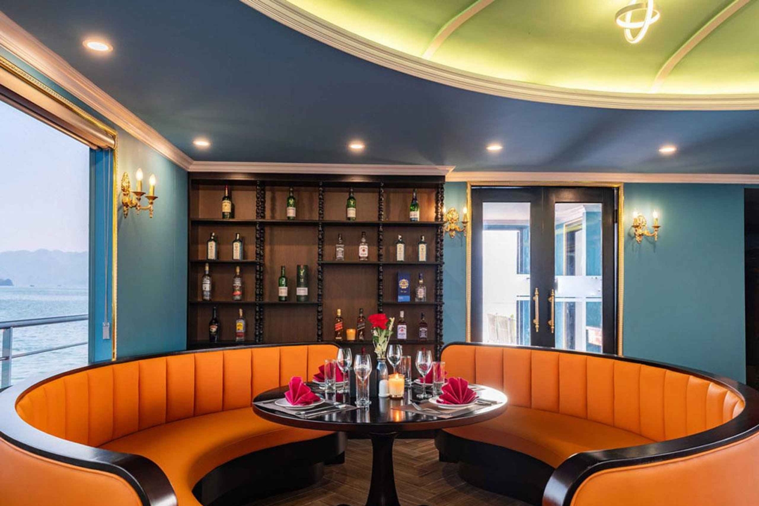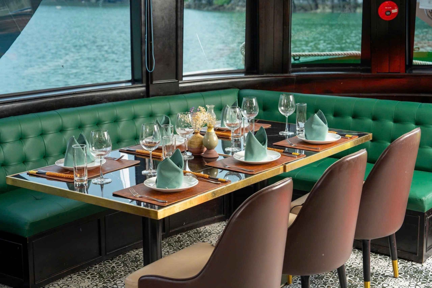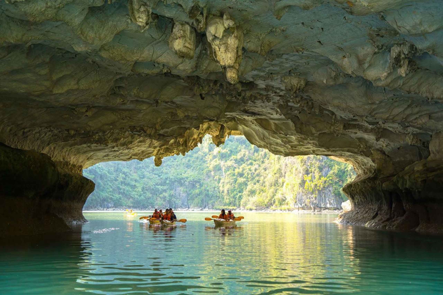 ハノイのホテルへお迎えにあがり、ハロン国際港までモダンなリムジンでゆっくりとお移動ください。到着後、港でチェックインし、船上でドリンクと冷たいタオルサービスをご用意しております。 バイ・トー山、マンヘッド島、マットキイ島をクルーズしながら、ハロン湾の最高のシーフードを使った5つ星のビュッフェ式ランチをお召し上がりください。次に、ハロン湾で最大かつ最も美しい洞窟の1つであるスンソット(サプライズ)洞窟に向かいます。この洞窟には、きらめく鍾乳石と自然の造形がたくさんあります。 次に、ルオン洞窟でカヤックまたは竹ボートツアーのいずれかをお選びください。ご自身でパドルを漕ぐか、現地の漕ぎ手に案内してもらい、石灰岩のトンネルを通り抜けて、崖に囲まれた静かなラグーンに向かいます。近くにサルがいるかもしれません。 その後、ティトップ島へ向かうか、ジャグジーでリラックスしていただけます。水泳を楽しんだり、頂上までハイキングしてパノラマの景色を眺めたり、船上のジャグジーでリラックスしながらハロン湾の自然の美しさをお楽しみください。 最後に、湾に沈む夕日を眺めながら、無料のお茶、ジュース、フルーツ、ペストリーをお楽しみください。オーロラの専用フライカムサービスで、その瞬間を捉えてください。ハロン国際港に戻り、下船後、ハノイのホテルまでお送りいたします。Includes