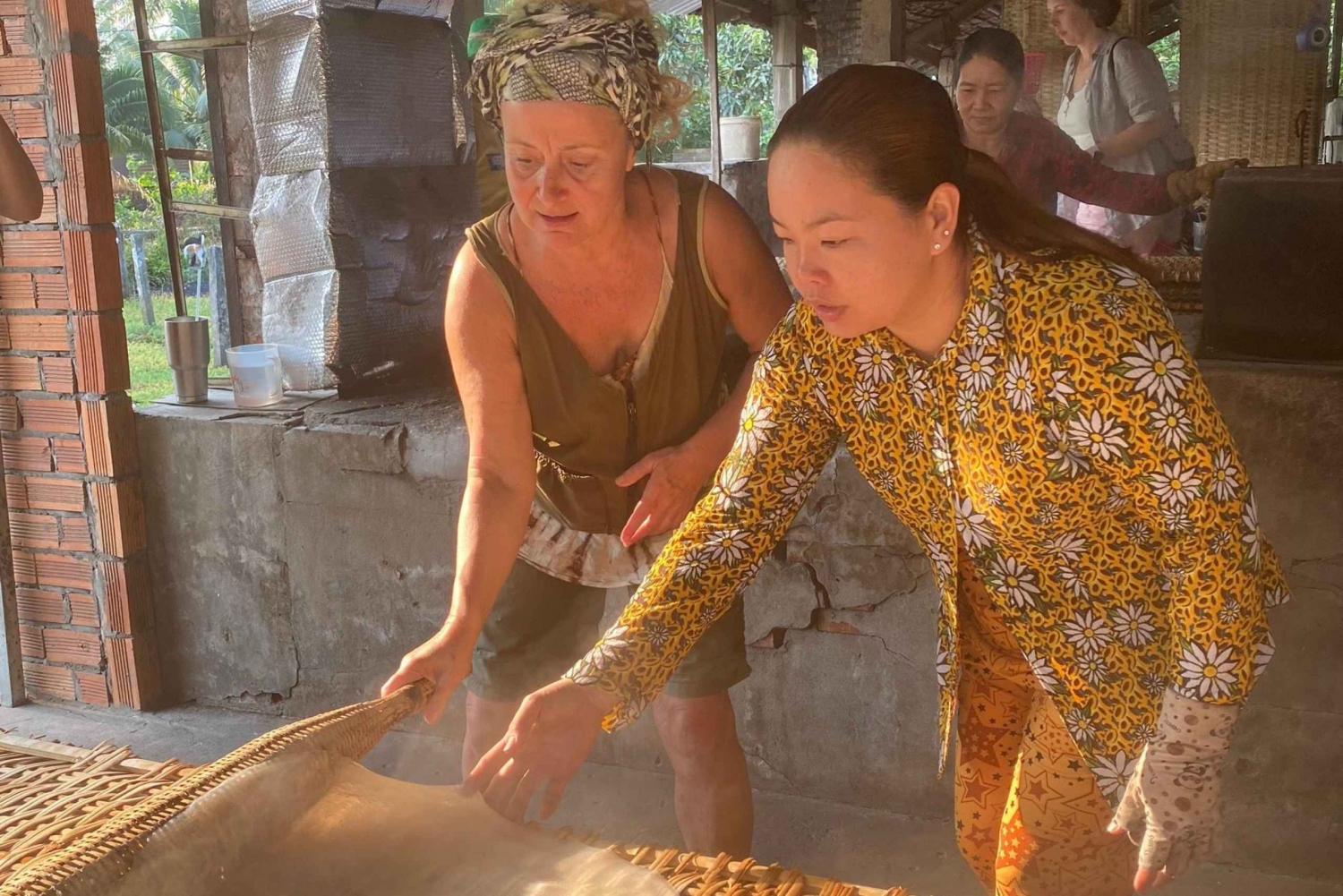 ツアー日程 分離4-6時間 朝5:00よりサンパン船にて出発 徒歩で5分、サンパンに乗ってハウ川を通り、カイ・ラン水上マーケットへ。メコンデルタで最も有名で大きな水上マーケットです。この市場は、この大河沿いに住む地元の人々のユニークな文化です。街で買い物をする代わりに、水路でアクセスするのに便利な川で買い物や物々交換をするのです。 ライスヌードルの工房を訪れ、手打ちの様子を見学 手漕ぎサンパンでくつろぎながらメコンデルタの村を散策 果樹園を訪れ、地元の人たちによるベトナム南部の民族音楽を聴きながら南国フルーツを堪能Includes