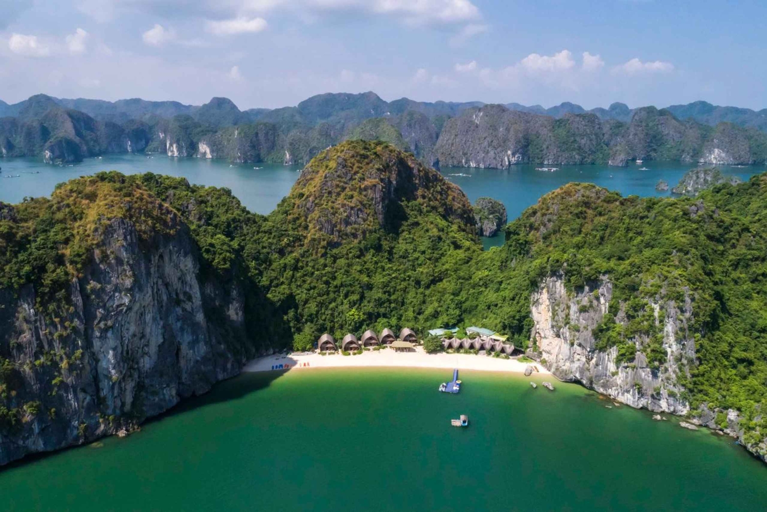 1日目:ハノイからハロン湾、ランハ湾へ 08:00:ハノイでお迎えいたします ハノイ旧市街から快適なリムジンで移動サービスをご利用いただき、旅を始めましょう(移動サービスをご予約いただいたお客様向け)。 革張りの座席にゆったりとお座席になり、田園風景をご覧ください。 11:30~12:00:到着いたします。ボートへの移動サービスをご利用ください。 ラウンジでチェックイン後、豪華なクルーズ船にご乗船ください。ウェルカムドリンクと温かいタオルでリフレッシュしていただけます。 12:30:昼食をお召し上がりください 船がハロン湾の奥へと進むにつれて、エメラルド色の海から石灰岩の崖が静かにそびえ立ちます。ハロンの賑やかなルートから離れて、親密で特別な旅をお楽しみください。グルメランチをお楽しみください。 15:00:ダーク&ブライト洞窟をご覧ください カヤックまたは竹舟で洞窟を探検しましょう。海、空、木々の色合いが融合した景色は、まるで神話の楽園に迷い込んだかのような魅力的な光景を呈しています。 17:00:自由時間です 季節限定のプールで涼を取ったり、プールバーでカクテルを飲んだり、太陽が沈み始める頃にはパノラマサンデッキでリラックスしてください。 太陽が沈むにつれて、湾は金色に輝きます。デッキで他の旅行者とハッピーアワー(2杯ご購入で1杯無料)を楽しんだり、プールに飛び込んだり、サンベッドでくつろいだり、カメラや心に夕日を収めたりしてください。 18:00:ベトナム料理教室をご案内します シェフと一緒に、新鮮な野菜を使った伝統的な春巻きの作り方を学びましょう。 19:00:船上でのご夕食 エレガントな雰囲気の中でベトナム料理と多国籍料理をお楽しみください。シーフードをお好みでない場合や、特別な食事のご要望がございましたら、対応させていただきます。 21:00:ご自身のペースでお楽しみください。バーで音楽を聴いたり、マッサージでリラックスしたり、ジムでトレーニングしたり、カラオケを楽しんだりできます。 2日目:日の出観賞 - カヤック - ハノイ 6:00:朝の太極拳をお楽しみください 船体に打ち付ける穏やかな波の音で目を覚まし、バルコニーのドアを開けて、新鮮な空気と朝のそよ風をお楽しみください。サンデッキで太極拳で体を目覚めさせるか、石灰岩の山頂に太陽が昇るのを眺めながら季節限定のプールにつかってみてはいかがでしょうか。 07:00:軽い朝食をお召し上がりください ダイニングルームでは、淹れたてのコーヒー、紅茶、ペストリーをご用意しております。 07:45:アオエチラグーン/ランハ湾へ カヤックでこの地域を探索すると、いくつかのユニークな体験ができます。巨大な石灰岩のカルストを間近でご覧いただけます。大きなクルーズではできない、いくつかの隠れた洞窟やラグーンをゆっくりと航行したり、きらめく澄んだ穏やかな水の中を泳いだりすることができます。 09:00:クルーズ船へお戻りください お荷物をまとめ、デッキで最後のひとときをお楽しみください。 09:30:ブランチをお召し上がりください 船がゆっくりと港に戻る間、お別れの食事をお楽しみください。 10:45~11:00:下船いたします 陸地に戻る前に、クルーに別れを告げてください。 11:30 クルーズの待合室に到着いたします。 ご自身でご旅行のお客様は、ご自身でご続行ください。移動サービスをご利用のお客様は、ハノイへの帰りのシャトルバスでおくつろぎください。 15:00。ツアーは終了いたします。Includes