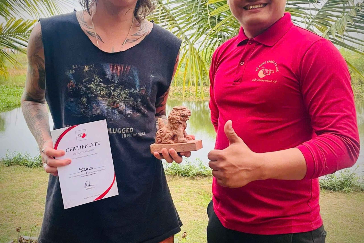 Ga met ons mee voor een dagje houtsnijden in Gonoi Village, op slechts 17 km van Hội An, waar je leert om je eigen houten beeldje te maken samen met een bekwame plaatselijke houtsnijder. Het is niet alleen een leuke en praktische ervaring - het is ook de perfecte manier om even weg te zijn van de drukke toeristenmassa's en wat rust op te snuiven. Op weg naar de werkplaats kom je door vredige dorpslandschappen, met rijstvelden en rivieren die zich onderweg ontvouwen - pure charme van het platteland. Eenmaal aangekomen ontmoet je onze getalenteerde kunstenaar, die je meeneemt voor een korte rondleiding door twee ongelooflijke kunstkamers. Stap eerst in de wereld van de vader, een gevierd nationaal kunstenaar, wiens minimuseum enorme sculpturen toont die de Vietnamese geschiedenis en cultuur tot leven brengen. Wandel dan naar de volgende kamer om de moderne creaties van zijn zoon te bewonderen, een mix van traditie met een frisse twist. Ga vervolgens naar het openlucht klaslokaal naast de werkplaats, waar een bekwame plaatselijke Vietnamese ambachtsman je wegwijs maakt in de kunst van het houtsnijden. Je gaat aan de slag met zagen, beitels en graveerpennen om je eigen houten beeld vorm te geven - of het nu een dier, een bloem of een ander ontwerp is dat tot je verbeelding spreekt. Als je de basiscontouren van je beeld hebt uitgehakt, nemen we om 11:30 uur een pauze om te lunchen met de familie van de kunstenaar. Je bent in voor een traktatie - een heerlijke vegetarische maaltijd klaargemaakt door de vrouw van de kunstenaar, geserveerd met warme gastvrijheid. Na ongeveer een uur ontspannen en bijtanken gaan we om 13:00 uur weer aan de slag om de laatste details toe te voegen om jouw creatie tot leven te brengen. Tegen 17:00 uur is je meesterwerk klaar en brengt onze chauffeur je terug naar Hội An. Je vertrekt met je handgesneden beeld, een leuk verhaal om te vertellen en een aantal nieuwe houtsnijvaardigheden om indruk te maken op je vrienden thuis. Het is een welbestede dag vol creativiteit, verbondenheid en een stukje Vietnam om voor altijd te bewaren!Includes