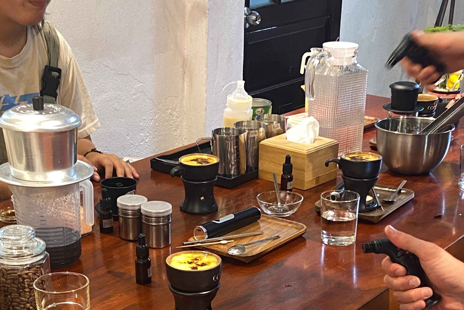 Stap in de gezellige wereld van Vietnamese koffie in het hart van Hue. Deze praktische workshop nodigt je uit om te ontspannen en te genieten van het traditionele zetproces met behulp van het iconische phin-filter. Onder begeleiding van een gepassioneerde lokale gastheer leer je hoe je de meest iconische koffiedranken van Vietnam maakt: eierkoffie, zoute koffie, kokoskoffie en de klassieke phin. De les begint met een introductie tot robusta-bonen, de ziel van Vietnamese koffie. Daarna zet je vier unieke soorten koffie, elk met hun eigen smaakverhaal en culturele achtergrond, en proef je ze. Of je nu een koffieliefhebber bent of gewoon nieuwsgierig, deze ervaring geeft je een beter begrip van hoe Vietnam sterke koffie tot een kunstvorm heeft gemaakt. Perfect voor reizigers die meer willen dan alleen een drankje — hier maak je kennis met het lokale leven, zet je je eigen kopje koffie en ga je naar huis met kennis en herinneringen.Includes