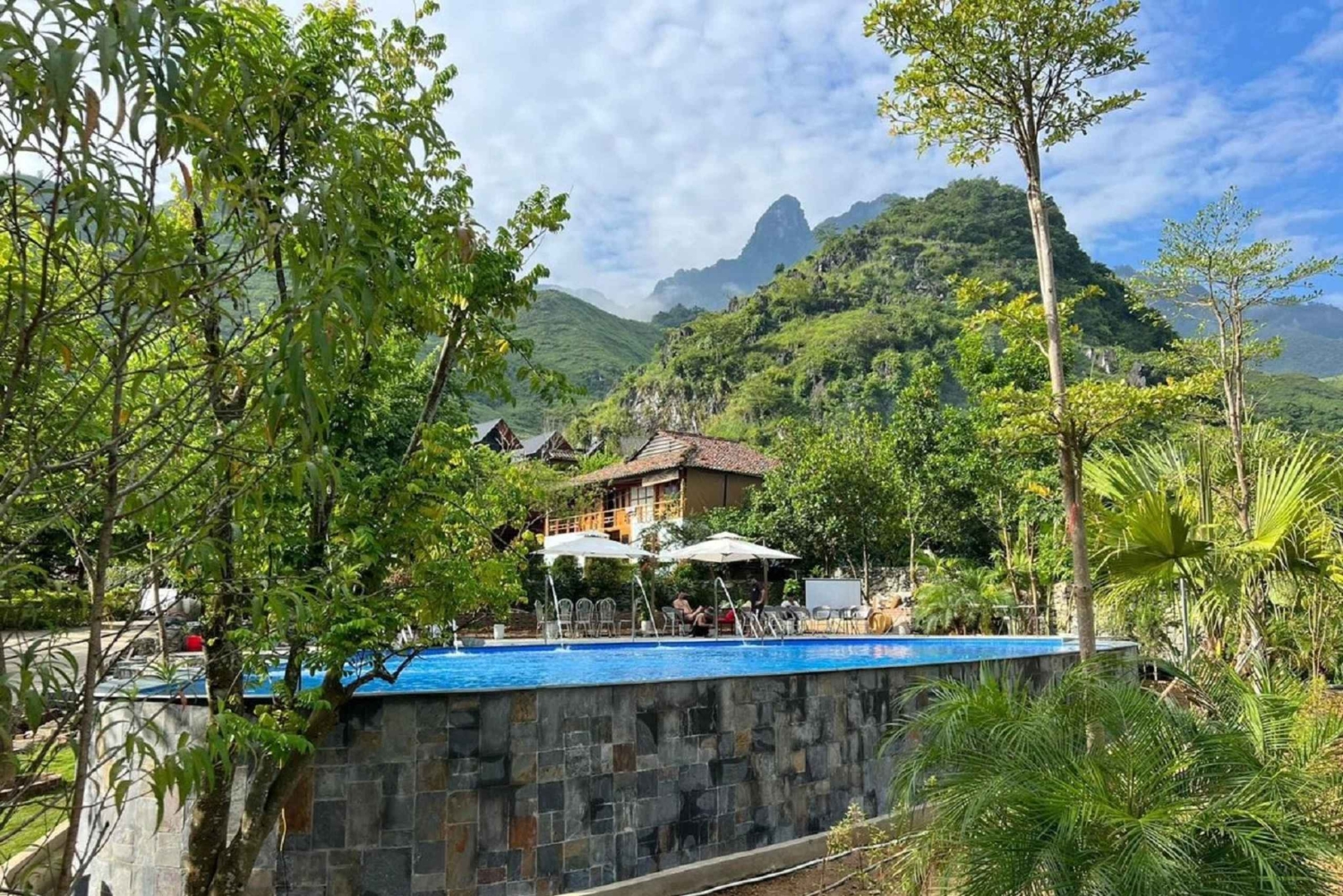 Utforsk Ha Giang Loop med en 3-dagers tur fra Hanoi. Besøk Hmong King Palace, nyt tradisjonell lokal vietnamesisk mat, kjør gjennom svingete fjellpass på motorsykkel med våre profesjonelle lokale easy riders og guide. Natt 1: Hanoi til Ha Giang med luksuriøs limousin-sovebuss 19:30: Møt opp på Charming Travel - 31 Lo Su, Hoan Kiem. 20:00 - 20:30: Komfortabel luksus limousin sovebuss til Ha Giang. Dag 1: Kong HMong-palasset - Dong Van by Høydepunkter: Chin Khoanh-passet - H'mong-kongens palass - Transport: Motorsykkel med enkel fører 140 km - Måltider: B, L, D B, L, D (Spesiell gratis flyt av Happy vann - lokal vin) - Overnatting på hotell med meget god beliggenhet sentralt i Dong Van Town. 04:00: Sjekker inn på Ha Giang Homestay for en lur 07:30: Spise frokost. 08:30: Start reisen med sjåføren og guiden din Mot Dong Van, Chin Khoanh-passet, hjemsted for det store geo-arvstedet Dong Van Karst Plateau. Med endeløse rismarker, kalksteinsberg og fantastisk utsikt. Besøk Hmong King's Palace, hjemmet til Vuongs familie i Sa Phin. Gratis oppbevaring av store bagger / ryggsekker hvis noen i garderoben på Ha Giang Hostel. Dag 2: Dong Van by - Ma Pi Leng-passet - Nho Que-elven - Du Gia lokale landsby Høydepunkter: Nho Que-elven - Lykkeveien - Ma Pi Leng-passet - Sky Walk - Meo Vac by - Transport: Motorsykkel med enkel fører 120 km - Måltider: B, L, D (spesiell fri flyt av Happy vann - lokal vin) - Sov i veldig avsidesliggende lokale homestay i Du Gia Local Village. Besøk berømte Du Gia Water Fall neste dag. Ma Pi Leng Pass. Med en høyde på 2000 meter, 'Kongen' av passene i Vietnam. Trek Sky Path for å se nærmere på hele dalen og Nho Que-elven. Kjør til Meo Vac, Mau Due og Lung Ho. Dag 3: Du Gia Village - Lung Tam Village - Ha Giang - Hanoi Høydepunkter: Morgennaturen - Svømming i fossen - Lung Tam-landsbyen - Transport: Motorsykkel med lettkjørt fører 95 km. Limousinebuss til Hanoi - Måltider: B, L B, L Besøk Lung Tam landsby, H'mong etniske kvinner dyktige tekstilprodukter. 15:00: Ankomst Ha Giang hostel 15:30 - 16:00: Comfort Limousine-buss tilbake til Hanoi. 23:00: Ankomst til Hanois gamlebydel. Gratis oppbevaring av ryggsekker eller bagasje på vårt Hanoi-kontor etter at du har sjekket ut av hotellet. Før turens avreise Gratis oppbevaring av ryggsekker eller bagasje på Ha Giang Homestay under turen Etter Ha Giang-turen tilbyr vi også omvisning med buss til Sapa hvis du ønsker det. Vennligst gi oss beskjed på forhånd for det beste arrangementet. Vi tilbyr også henting fra Sapa hvis du ønsker avreise fra Sapa.Includes