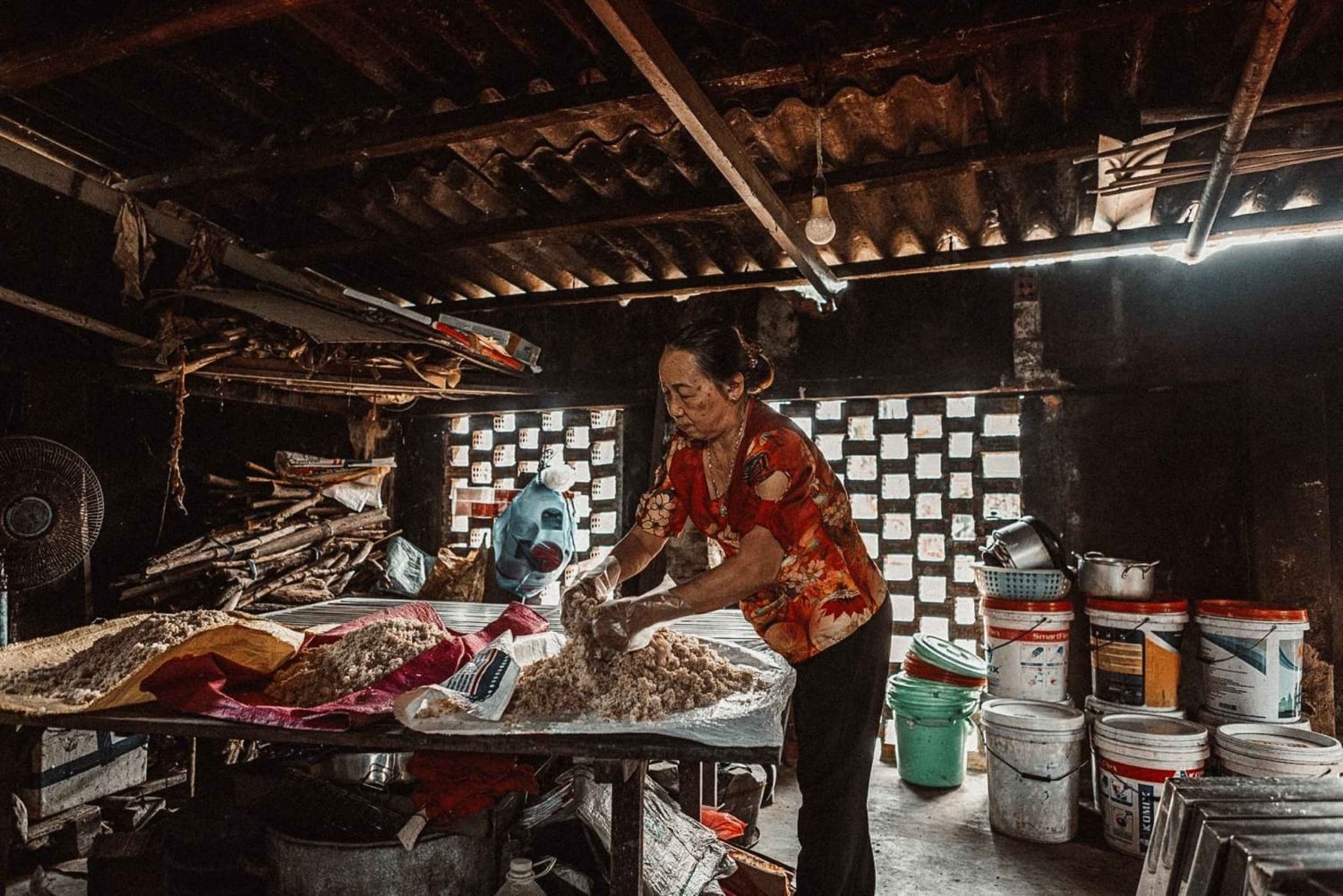 – La vårt vennlige lokale team ønske deg velkommen når vi henter deg på hotellet ditt i Hoi An. Fra begynnelsen av blir du ikke bare med på en tur – du går inn i en verden som normalt er forbeholdt lokalbefolkningen, hvor ekte forbindelser, levende tradisjoner og hverdagslig skjønnhet former en uforglemmelig reise. – Reisen begynner på et familiedrevet fiskesausverksted, hvor du finner ut hvordan Vietnams viktigste UMAMI-ingrediens lages. Gå gjennom den århundregamle prosessen, lukte på tønner med havsalt og se hvordan håndverkere gjør ansjos til essensen av vietnamesisk mat. – Deretter kjører vi gjennom rolige bakveier for å besøke regionens mest unike kaffebrenneri. Dette er ingen kommersiell kafé – det er et lidenskapsprosjekt drevet av en mesterbrenner som har viet livet sitt til å perfeksjonere den lokale bønnen. Gå inn i det rustikke verkstedet hans, oppdag hemmelighetene bak brenningsteknikkene, prøv deg på brenning og nyt en kopp så frisk og aromatisk at den omdefinerer hva «vietnamesisk kaffe» egentlig betyr. – Herfra begynner det oppslukende motorsykkelturen gjennom landsbyer som ikke er berørt av turisme. Glid langs fredelige veier med rismarker som skimrer under solen, passere fiskeoppdrettsanlegg, grønnsaksmarker, kokosnøttskoger og små familieverksteder. Du får se det daglige livet utfolde seg naturlig rundt deg – bønder som passer avlingene sine, barn som leker ved veien, eldre som hviler i skyggen – en stille, autentisk verden langt unna folkemengdene. – I en fiskelandsby ved elven møter du lokale fiskere og går om bord i de tradisjonelle kurvbåtene deres, og driver inn i tykke Nipa-palmejungler der elven smalner og naturen omfavner deg. Prøv deg på tradisjonell krabbefiske og hør intime historier om hvordan livet ved elven har formet generasjoner. Det er ingen båter som snurrer, ingen musikk, ingen gimmicks – bare naturens og kulturens fredelige rytme som blander seg til et uforglemmelig øyeblikk. – Reisen din fører deg deretter til det beskjedne hjemmet til en tradisjonell mattevever, en av de gjenværende mesterne av dette håndverket som er i ferd med å forsvinne. Sitt ved siden av henne, vev sammen et stykke av en kulturmatt som har blitt brukt i vietnamesiske hjem i århundrer, og hør hvordan denne stille, vakre tradisjonen forsvinner etter hvert som yngre generasjoner vender seg til moderne arbeid. – Til slutt kommer du til et ekte hjemmebrenneri, hvor en lokal familie fortsatt produserer små partier risvin ved hjelp av hederlige metoder. Gå gjennom hvert trinn i bryggeprosessen, utforsk den rolige hagen og smak på over 15 varianter av autentisk vietnamesisk rislikør – hver med unike smaker og historier. – Når oppdagelsesdagen din er over, sørger vi for en trygg og komfortabel tur tilbake til hotellet, slik at du kan slappe av mens du reflekterer over menneskene du møtte, historiene du hørte og de sjeldne, vakre øyeblikkene du har opplevd. – Dette er mer enn en tur – det er en ekspedisjon inn i hjertet av det virkelige Vietnam, hvor kultur, håndverk og samfunn ønsker deg velkommen som en venn. Bli med oss og gjør dagen din i Hoi An til en virkelig minneverdig reise.Includes