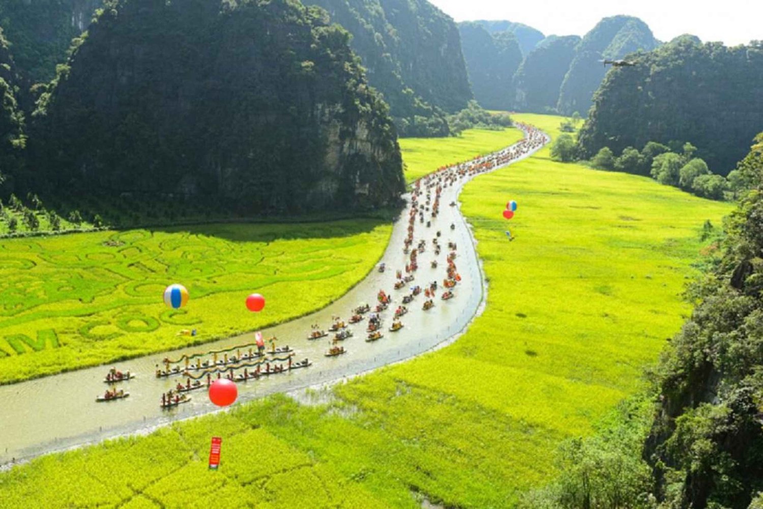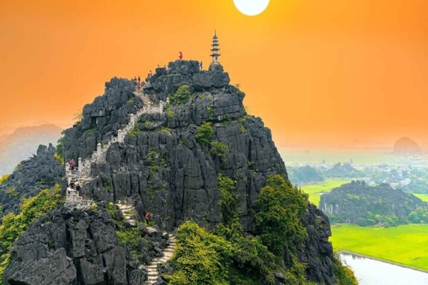 Begin your adventure with a convenient pickup from your hotel in Hanoi. Head to Hoa Lu, the ancient capital of Vietnam, and explore its historic temples and pagodas. Next, hop on a bike and cycle through the stunning landscapes of Ninh Binh, surrounded by majestic limestone mountains. Enjoy a delicious buffet lunch featuring authentic Vietnamese cuisine, with vegetarian options available. After lunch, embark on a 2.5-hour boat ride through the breathtaking Trang An landscape, a UNESCO World Heritage Site. Marvel at the natural beauty of the area as you glide through caves and past towering cliffs. Finally, visit Mua Cave, a must-see destination known for its panoramic views of the surrounding countryside. Climb to the top for a stunning vista before heading back to Hanoi.Includes