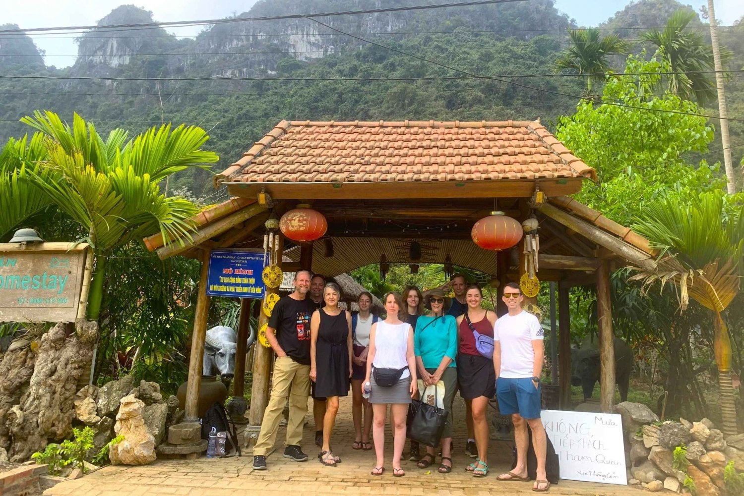 Traslado de ida e volta no teu hotel no bairro antigo de Hanói ou em Ninh Binh 1 noite de estadia em casa de famÃlia na vila de Viet Hai + 1 noite de estadia em cruzeiro guiadoGuia de turismo simpático e incrÃvel que fala inglês