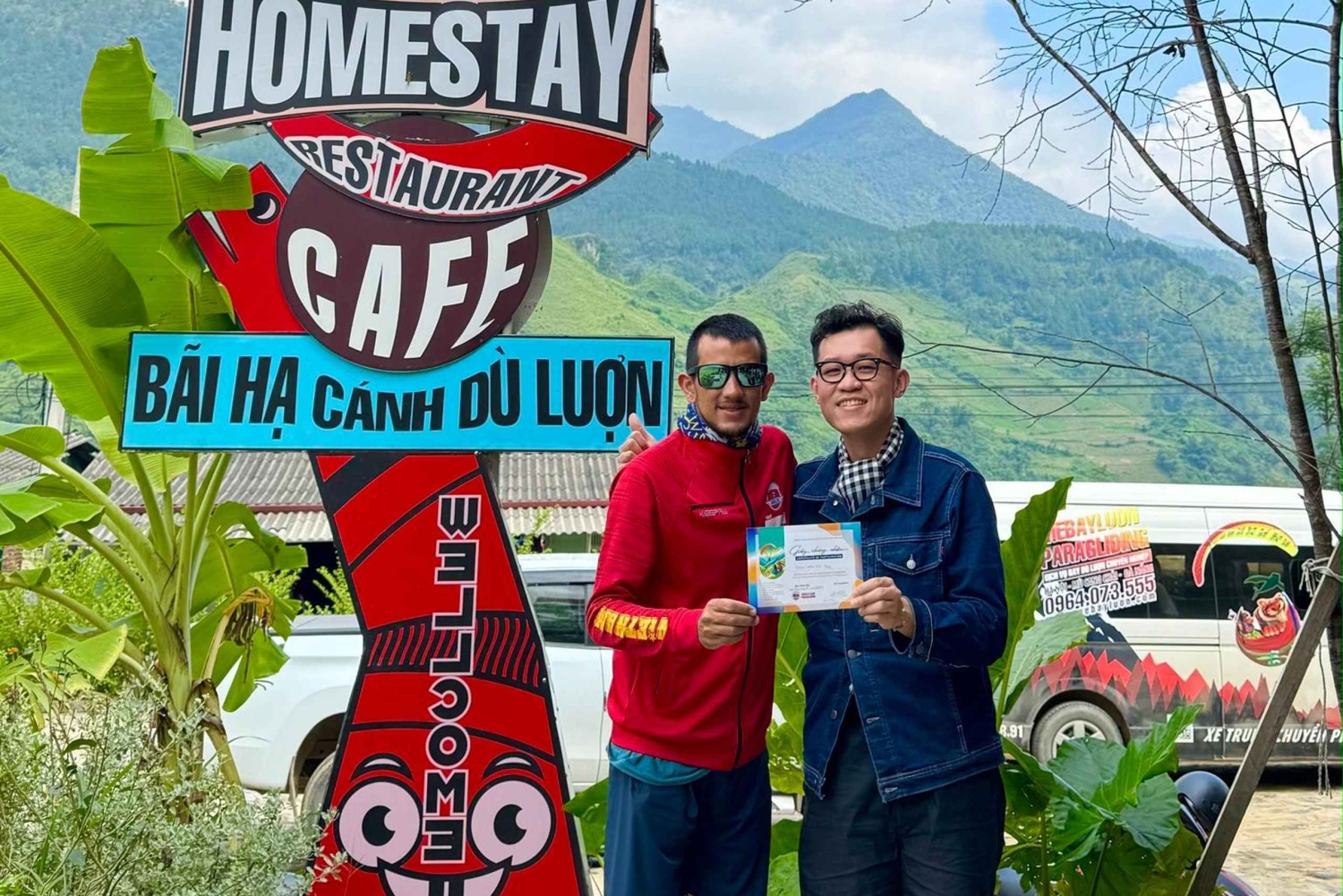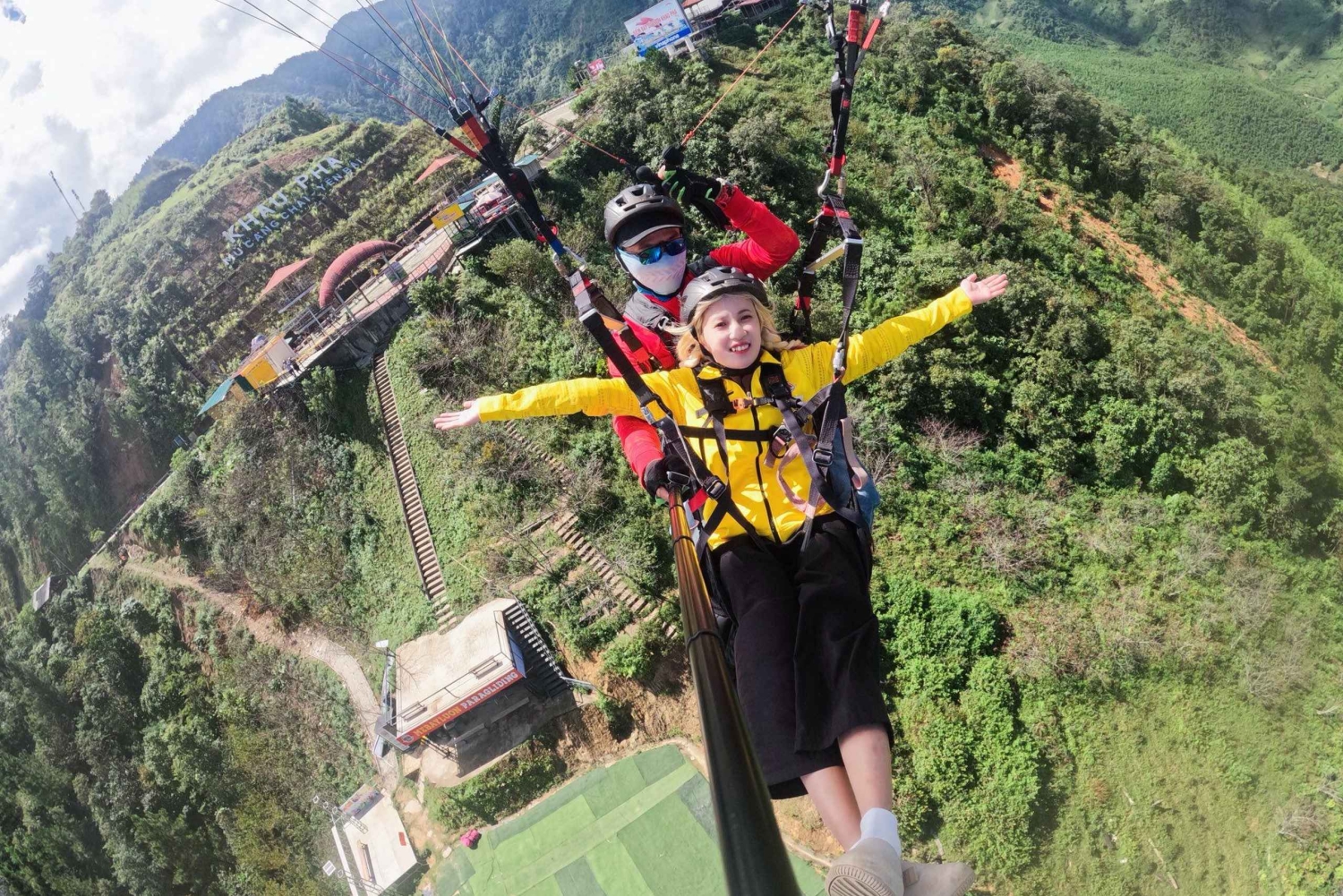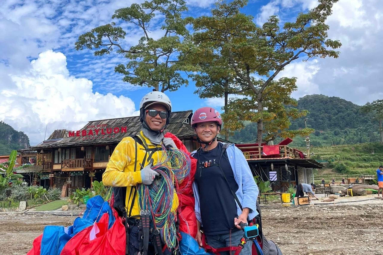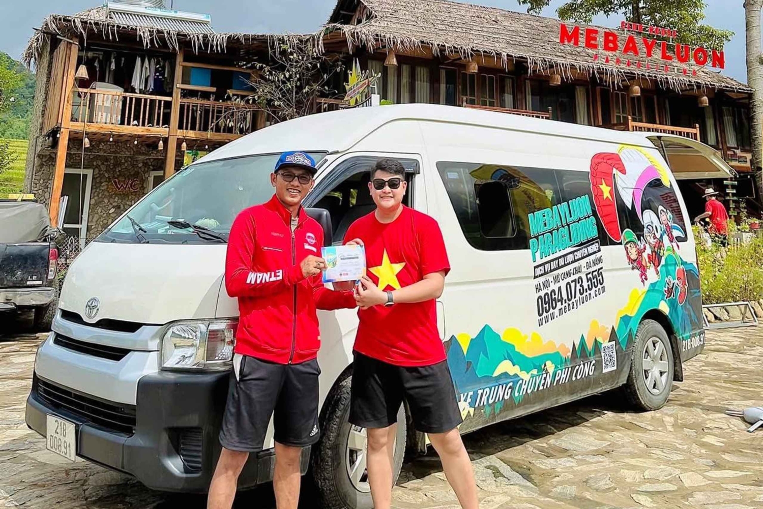 Localizado a cerca de 250 km de Hanói, Mu Cang Chai é conhecido pelos seus magníficos campos de arroz em socalcos — muitas vezes descritos como 'escadas para o céu'. A beleza selvagem e cativante da paisagem faz dela um dos destinos mais icónicos do norte do Vietname. Do ar, a vista abre-se para vales coloridos pontilhados com casas tradicionais de palafitas das comunidades tailandesas e H'mong, criando uma cena serena e pitoresca. A experiência é como flutuar com o sol e o vento — um momento único que muitos viajantes apreciam. Todos os voos são operados por uma equipa profissional de pilotos, entre os mais experientes do Vietname, com algumas das maiores horas de voo do país. O equipamento é rigorosamente inspecionado antes e durante as operações, e os pilotos são certificados internacionalmente, garantindo uma experiência de parapente segura e inesquecível sobre Mu Cang Chai.Includes