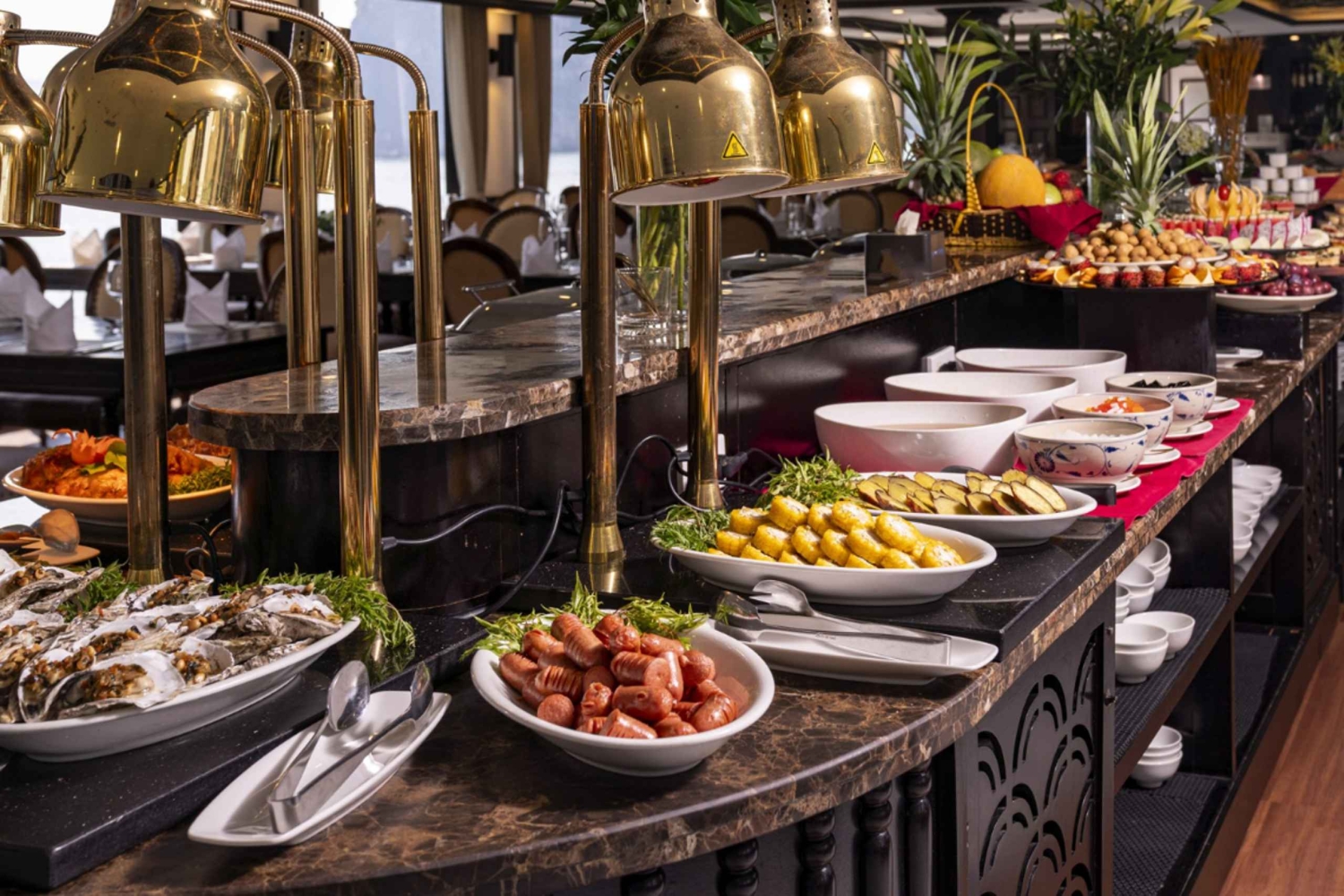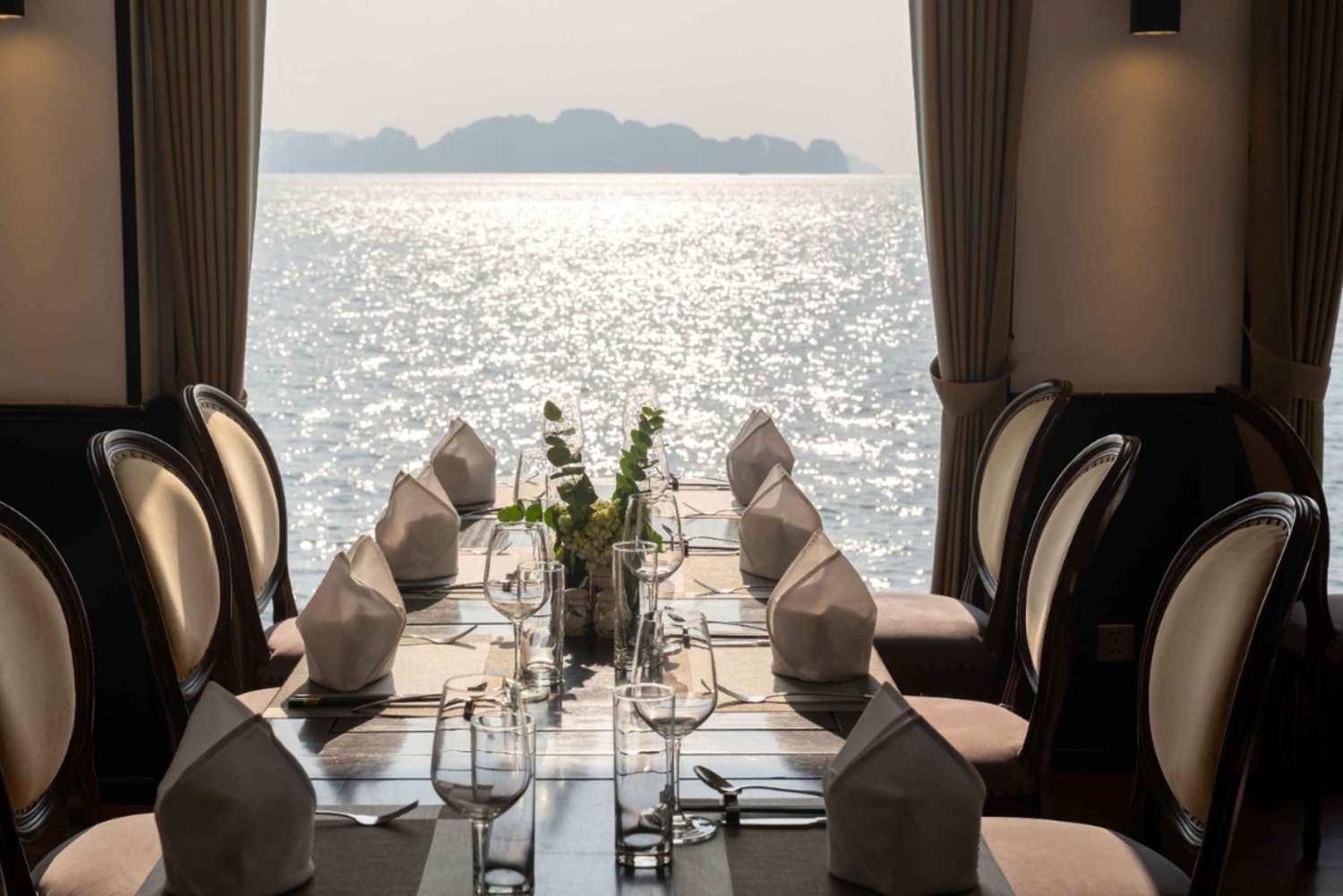 - - Delicia-te com um grande buffet com mais de 60 pratos europeus-asiáticos e especialidades locais. - Descobre um paraíso esmeralda sereno onde imponentes falésias de calcário se refletem na água cristalina, num barco de bambu ou caiaque - Admira a Sung Sot Cave – a maior e mais deslumbrante gruta da Baía de Ha Long, onde estalactites cintilantes criam um mundo místico de fascinantes formações rochosas. Visita a Ilha Titop – Um local ideal para mergulhar em águas cristalinas ou caminhar até ao pico para uma vista panorâmica deslumbrante da majestosa baía. Desfruta de uma pausa para o chá com música ao vivo a bordo enquanto admiras a beleza quase surreal da Baía de Ha Long ao entardecer.