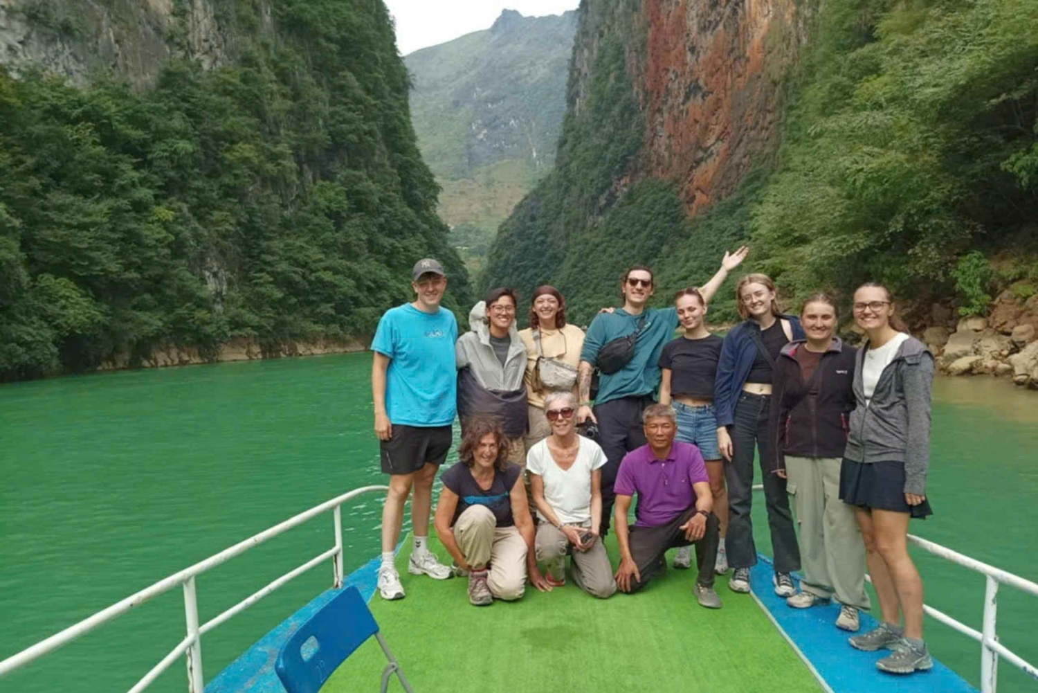 Noite 1: 19h Serviço de busca no hotel (albergue) na cidade de Sapa, embarque no autocarro grande e partida para a cidade de Ha Giang - Chegada a Ha Giang de manhã cedo e check-in no albergue para dormir uma sesta. -Dia 1: Ha Giang - Quan Ba - Yen Minh - Dong Van, aprox. 135 km de carro (B,L,D). 8h30: Depois do pequeno-almoço, encontro com o guia de turismo e com o guia fácil, seguimos a 'Estrada da Felicidade' e partimos para norte da cidade de Ha Giang. Subiremos o desfiladeiro de Quan Ba - Bac Sum, o Geoparque do planalto cársico de Dong Van e chegaremos à Porta do Céu de Quan Ba (o observatório da montanha está situado acima de uma estrada íngreme em ziguezague com vista para as montanhas majestosas. A paisagem é composta por campos de arroz ilimitados). Vuong Chinh Duc - Rei dos H'mong. Subindo para a cidade de Dong Van, parando na cidade velha de Dong Van, levá-lo-emos ao antigo forte construído pelos franceses. Desfruta de um jantar vietnamita local, música ao vivo, karaoke com uma família de minorias étnicas. Passa a noite livre e descansa. - Dia 2: Dong Van - Ma Pi Leng - Mau Due - Du Gia (cerca de 120 km de carro - B,L,D) Saída da casa de família, pequeno-almoço e continuação da viagem para o mercado de Dong Van localizado no complexo da cidade velha de Dong Van, a maior troca de bens e cultura no planalto rochoso de Dong Van. - Meo Vac. Depois da experiência no mercado de Dong Van, continuaremos a atravessar alguns dos desfiladeiros de montanha mais majestosos que alguma vez verás, e subiremos o penhasco da morte, antes de subir o desfiladeiro 'Ma Pi Leng'. O desfiladeiro Ma Pi Leng torna-se a estrada que todos os amantes de trekking querem conquistar. No cimo do desfiladeiro, a partir do miradouro Panorama, podes observar o aspeto impressionante das montanhas e dos campos de terraços. Abaixo do teu pé está o desfiladeiro de Tu San, o local que todos os visitantes desejam pisar pelo menos uma vez. Depois, segue para Mau Due, onde desfruta da hora do almoço, atravessa os desfiladeiros rochosos e descansa para admirar a beleza selvagem das majestosas montanhas naturais, para se aprofundar nas montanhas do sul e chegar à pitoresca aldeia de Du Gia e visitar e nadar, saltando na cascata no meio de uma floresta verde profunda criada pela natureza há milhares de anos. Passa a noite numa casa de família étnica local na aldeia de Du Gia. - Dia 3: Du Gia - Duong Thuong - Thuan Hoa - Ha Giang (aprox. 100 km de carro) (B,L) Depois do pequeno-almoço, partida para Sul, despedida de Du Gia, passagem pelas montanhas altas abaixo, vale de Duong Thuong com campos largos e passagens altas e sinuosas. É muito baixo e perigoso. A paisagem da rua Thuong até Thuan Hoa é muito majestosa, atravessando o desfiladeiro ao longo do vale Song Lo até Ha Giang. O almoço será servido no nosso albergue, depois do qual podes visitar a aldeia local perto do nosso albergue ou descansar durante algumas horas. Chega à cidade de Ha Giang às 16 horas.Includes