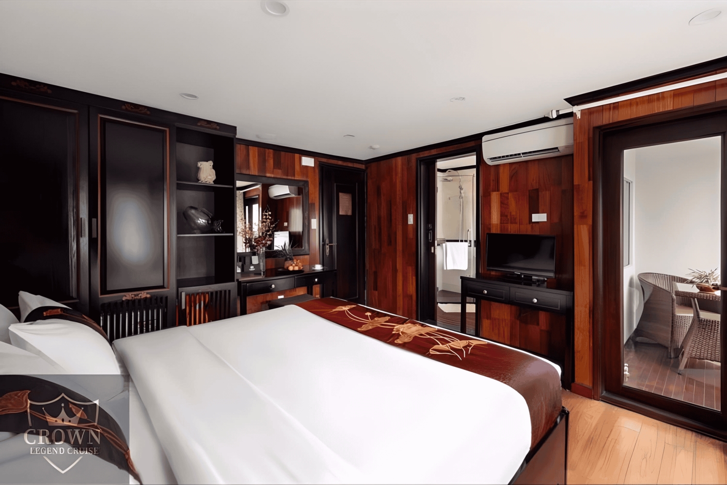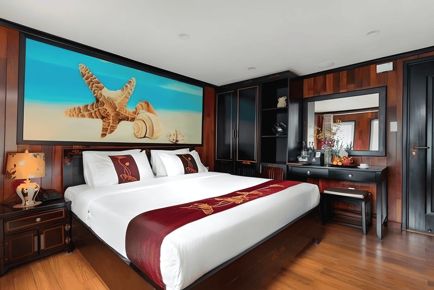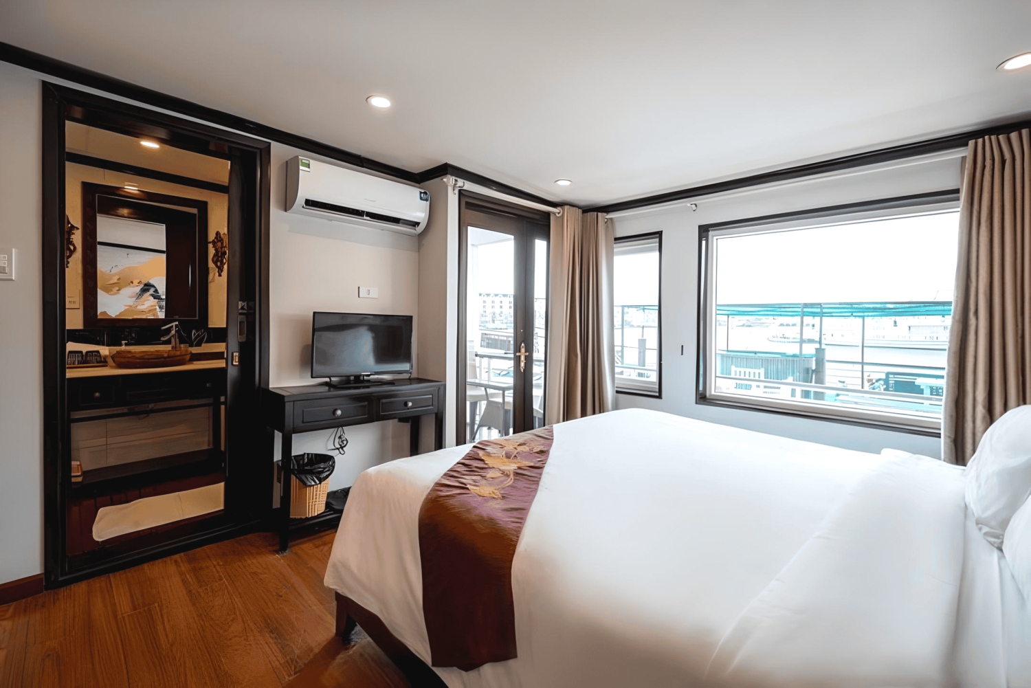 Jantar x 1 Café da manhã x 1 Almoço x 2 Água engarrafada Chuveiro com entrada e água quente, banheiro privativo. Banheira para cabines tipo suíte Banheiro com todas as comodidades, mediante solicitação WIFI GRATUITO na área pública do cruzeiro e no escritório do cruzeiro Todas as refeições e ingressos para todas as atividades Caiaque/Barco de bambu, natação na praia, aula de culinária, aula de Tai Chi, bebidas no happy hour Traslado de ida e volta de Hanói a Halong (3 horas de viagem em rodovia com ônibus/limusine) Ingresso/Admissão - Caverna Sung Sot, Ilha Ti Top, Caverna Luon, Baía de Ha LongEasy cancellation