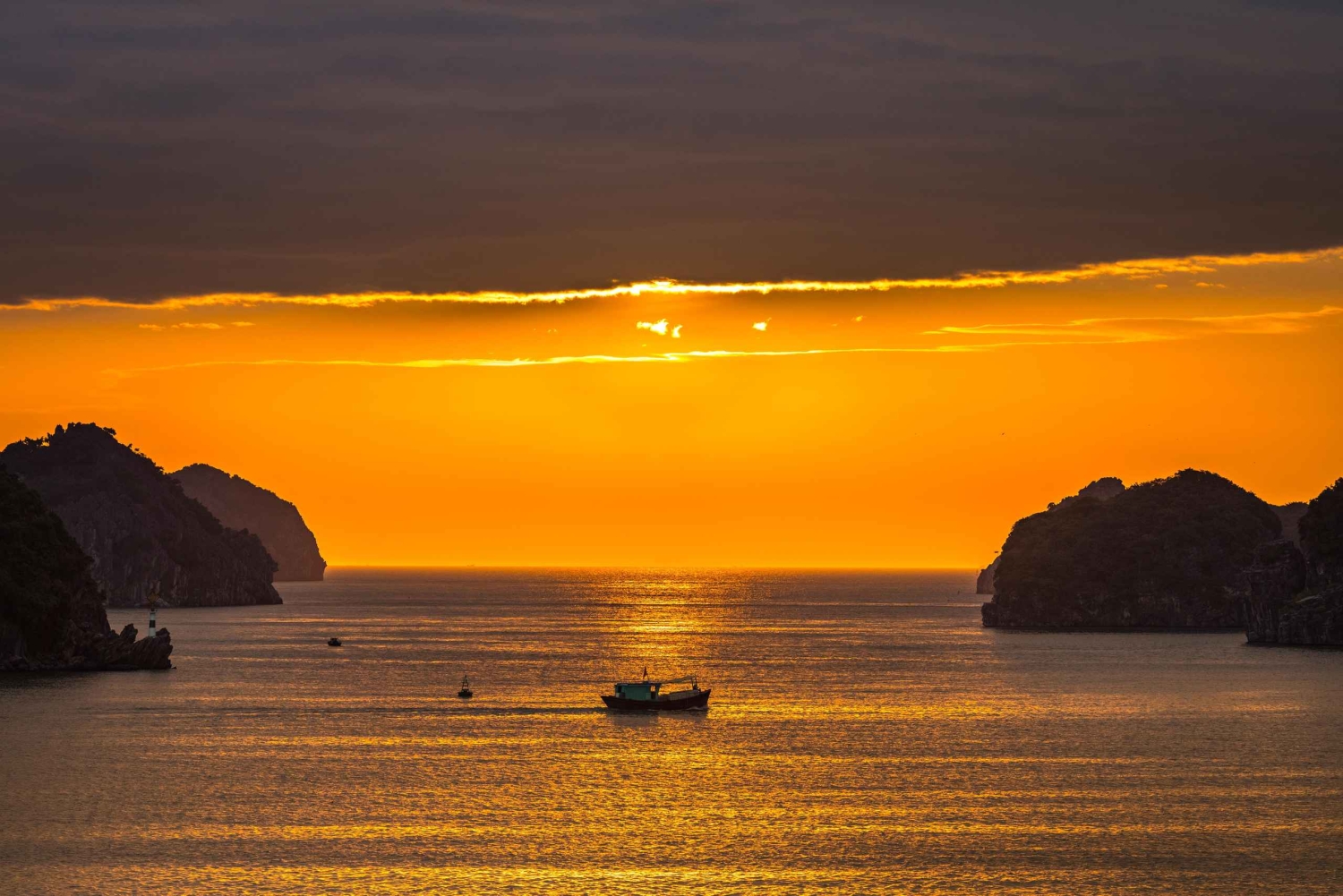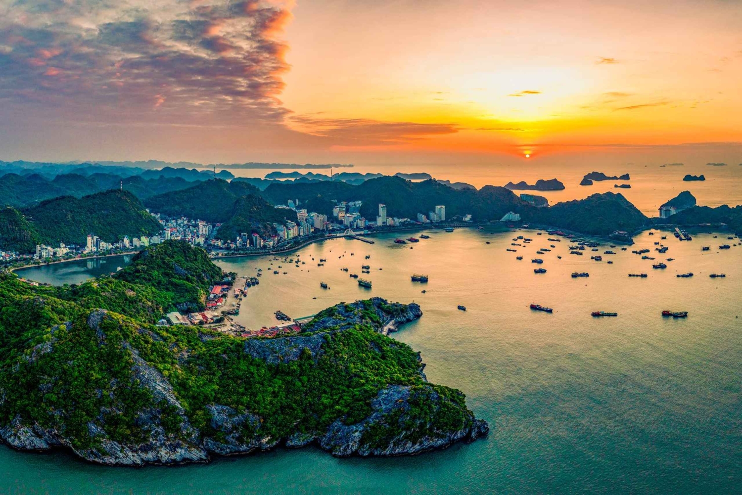 8h00 - 8h30: Você será buscado em seu hotel em Cat Ba por um de nossos experientes guias de turismo e viajará de ônibus para o porto de Cai Beo. 9h00: Você embarcará em nosso belo barco e fará um cruzeiro ao norte da Baía de Lan Ha. O barco nos leva pela vila de pescadores de Cai Beo. Continuamos a visitar centenas de pequenas ilhas e seguimos para o norte com uma variedade de formas, como velas, sapos e focas. Há centenas de pequenas praias de areia na Baía de Lan Ha, que veremos no caminho para o norte até a Baía de Ha Long. 9h30: Primeira parada nas praias de três pêssegos para nadar e mergulhar com snorkel para ver os recifes de coral, onde há muitas praias de areia dourada e lisa.... 10h30: O barco aterrissa em uma casa flutuante e, em seguida, você faz um passeio de caiaque pela caverna de túneis em arco de rocha, até lagoas escondidas e descobre a caverna Dark - Bright (o nome local é Hang Ca). 12h00: Desfrute de um almoço tradicional vietnamita no barco com o seu guia. 13h00: O barco segue em direção ao norte para ver a parte sul da Baía de Ha Long, um patrimônio natural mundial; 14h30: Continuação da viagem para o sul para ver outra parte da Baía de Lan Ha, nossa parada de barco em uma praia selvagem, também é um lugar ideal para nadar na água azul clara e na areia branca. 16h30min: Saímos da praia selvagem e voltamos para o porto de Ben Beo, onde você poderá apreciar o início do mundialmente famoso pôr do sol. 17h00: Chegaremos de volta ao centro da cidade de Cat Ba e, em seguida, você retornará ao seu hotel.Includes