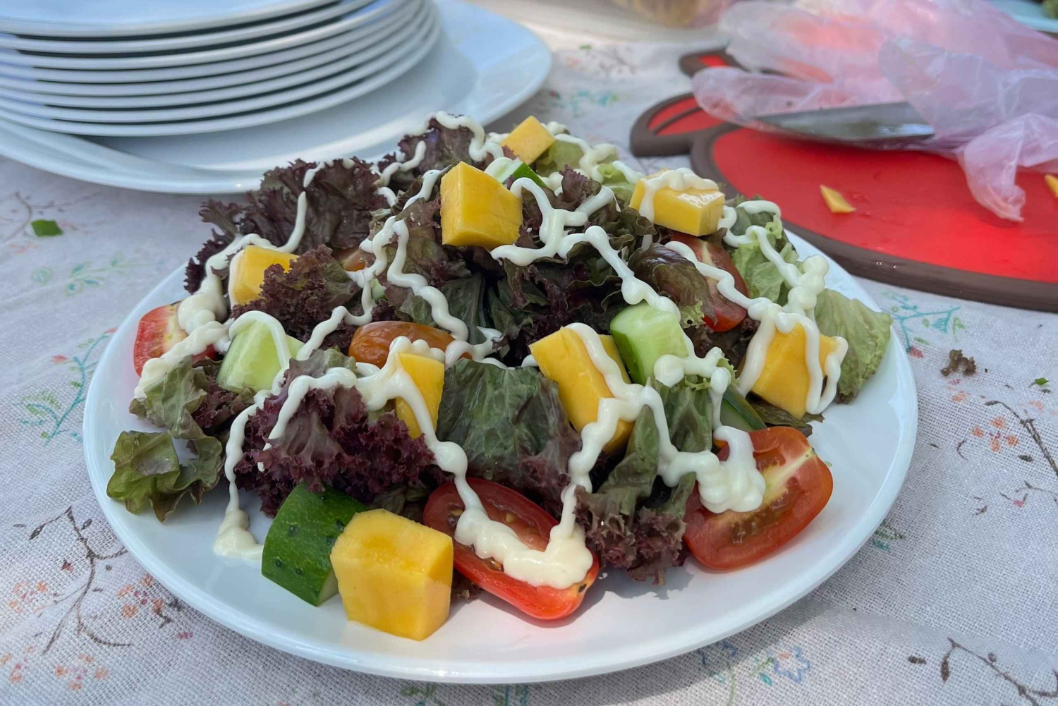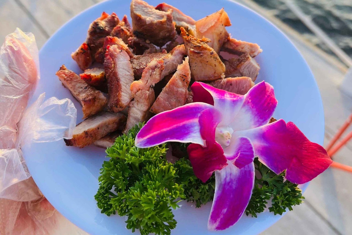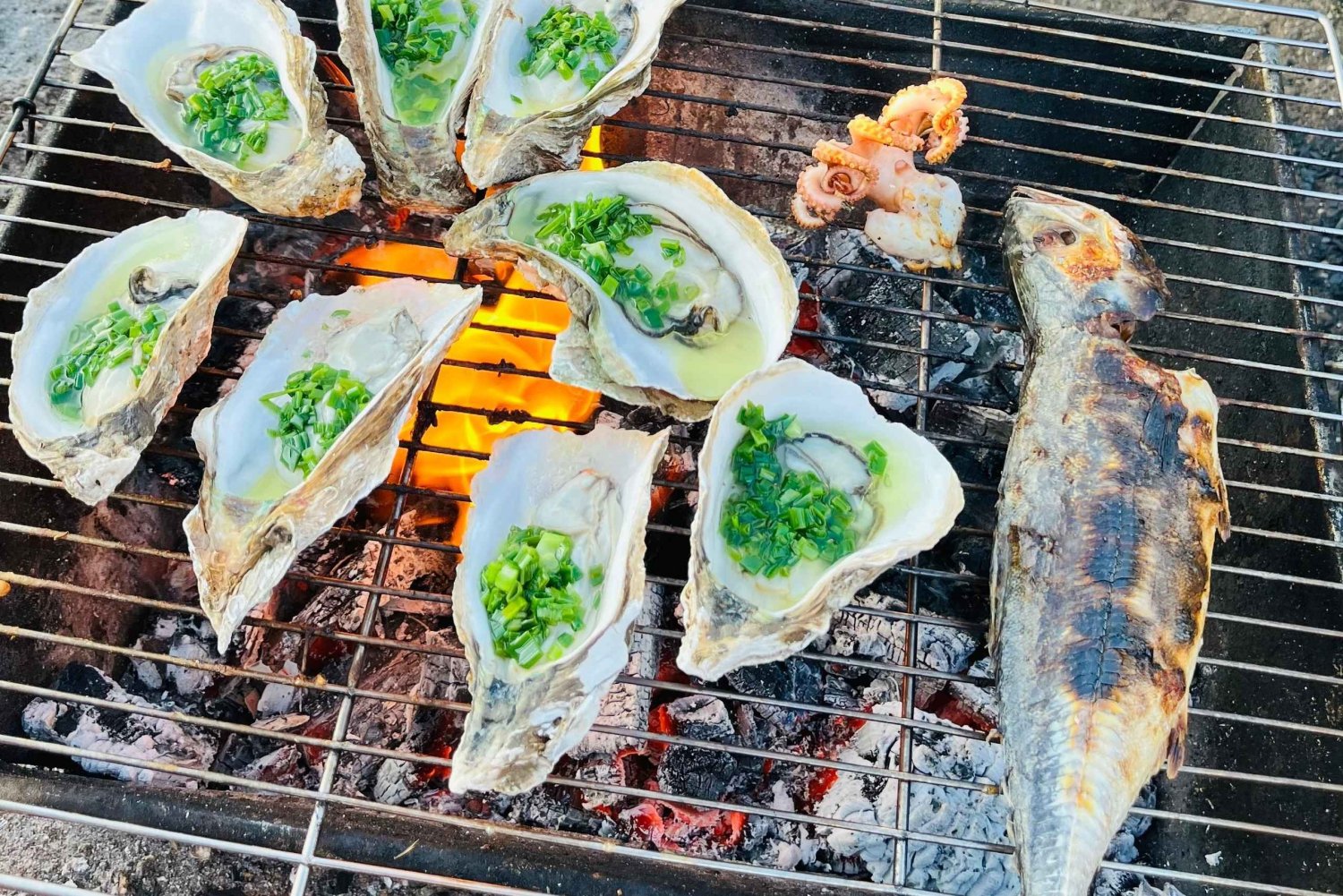 - A freshly prepared seafood BBQ lunch is served on a peaceful, hidden beach