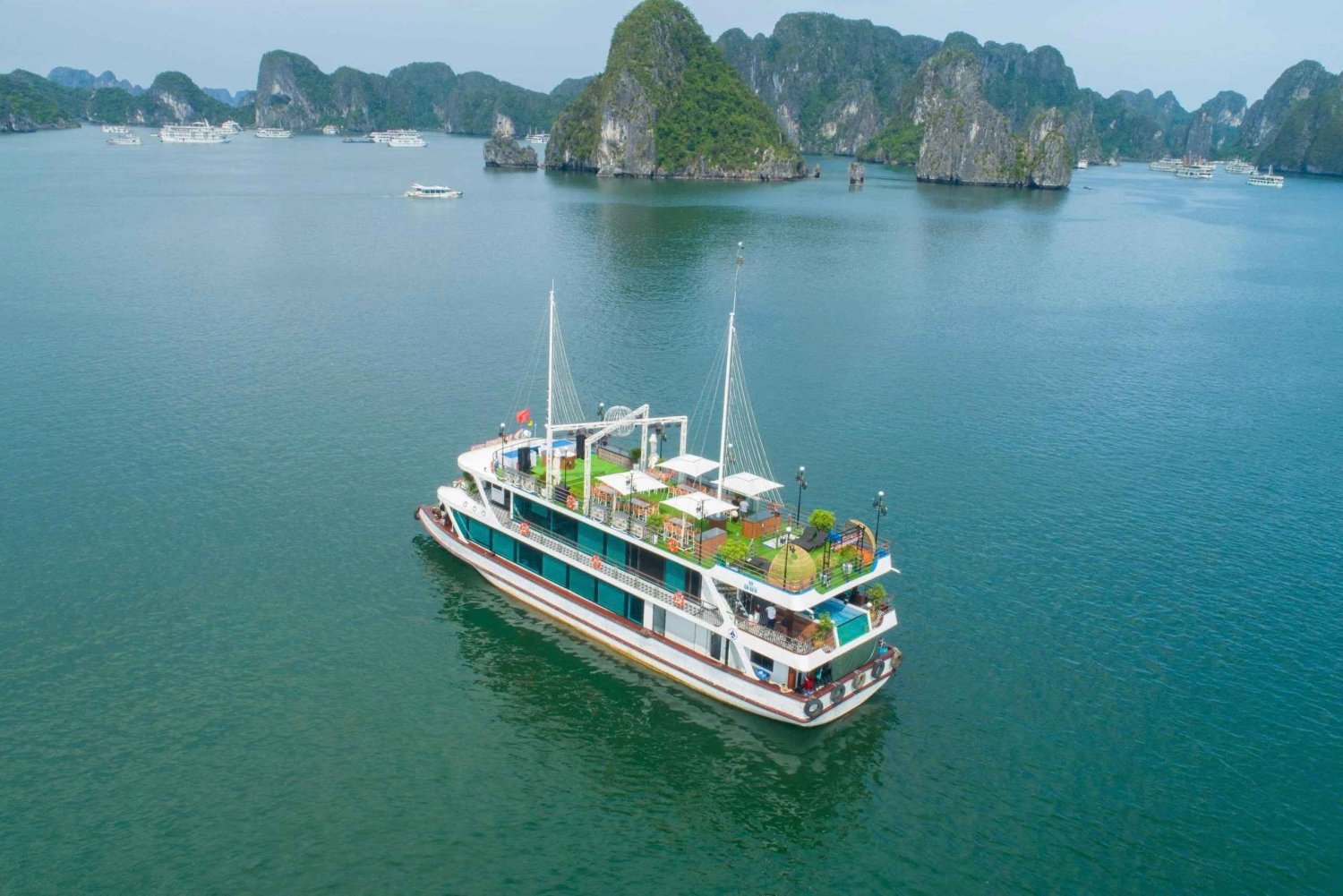 Ha Long Bay is a remarkable natural World Heritage Site of Vietnam recognized by UNESCO, famous for its thousands of stunning limestone islands, mysterious caves, and breathtaking landscapes. The bay attracts visitors with its pristine beauty and a variety of sightseeing activities. Starting early in the morning, around 7:45 AM to 8:15 AM, travelers will be picked up from their hotel in Hanoi’s Old Quarter (if this service has been booked). From there, the bus will take you across bridges and lush green fields, heading towards Ha Long Bay via the highway, with approximately 2.5 hours to reach the destination. During the journey, there is a 15-minute stop for rest and relaxation. Upon boarding the boat, guests will be welcomed with a refreshing drink, followed by a briefing from the cruise manager about maritime safety regulations and the sightseeing itinerary as the cruise sails through thousands of limestone islands of the heritage site. Get ready to begin your journey to explore the stunning beauty of this famous bay. Enjoy a hearty lunch featuring a variety of Asian and European dishes, catering to all tastes. The boat is equipped with modern entertainment systems, including a 100-inch LED screen or large TV, along with stage lighting, creating an ideal space for karaoke, performances, presentations, or lively entertainment activities. The trip also takes you to visit Sung Sot Cave, the largest cave in the bay, where you can admire magnificent stalactites and stalagmites. Next, explore Luon Cave, a unique cave where you can paddle kayak or take a traditional boat ride with local guides to discover the breathtaking natural scenery. Then, the journey continues to TiTop Island, where you can swim in the clear waters or hike to the top for a panoramic view of Ha Long Bay’s spectacular scenery. In the afternoon, guests can relax on the sun deck, enjoy a sunset party with fresh fruits, and lively music through a modern sound and lighting system. The infinity pool on the boat offers stunning views, making it the perfect spot for photos and capturing memorable moments with loved ones. You will also have the opportunity to take free souvenir photos with your national flag, creating beautiful keepsakes of this memorable trip.Includes