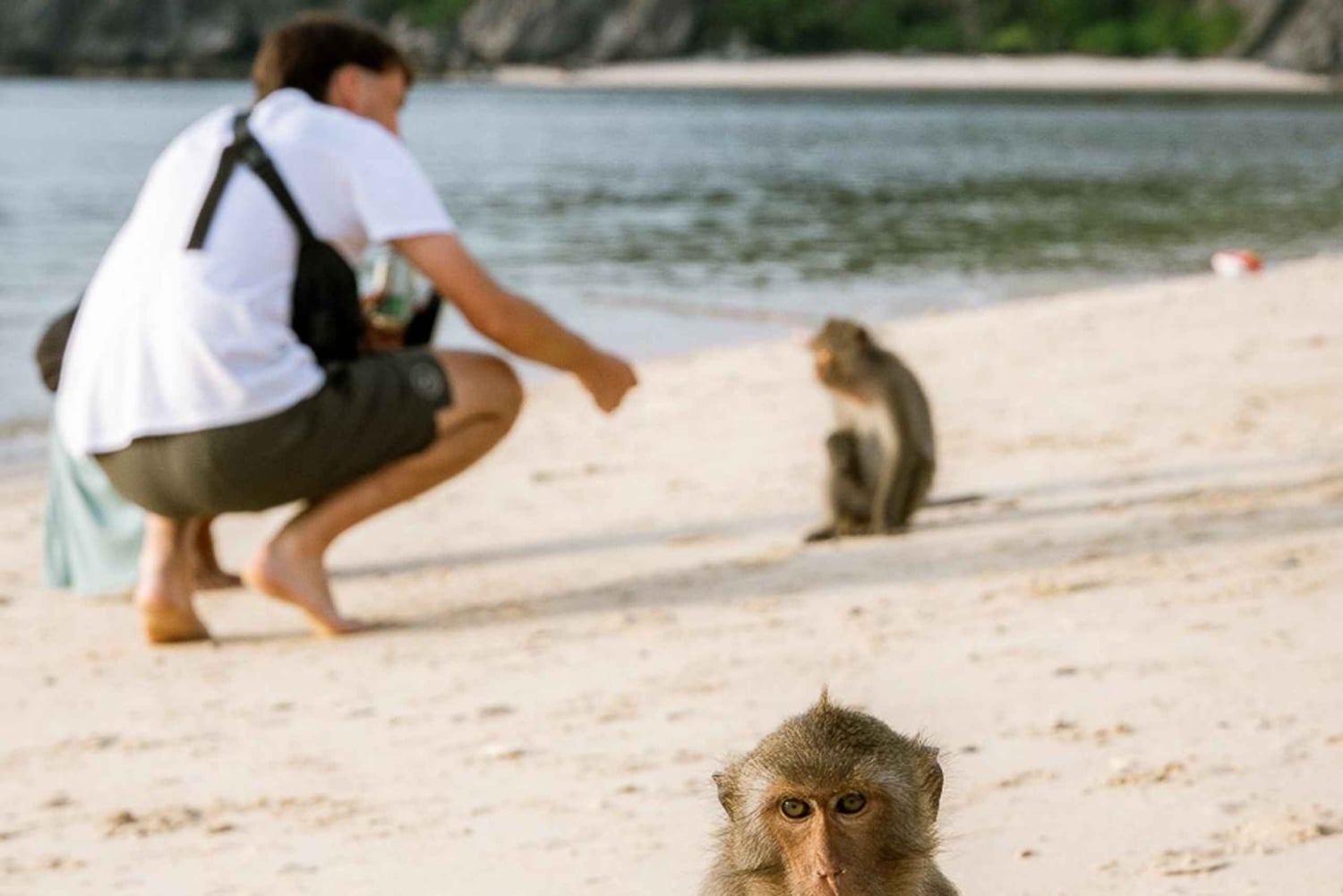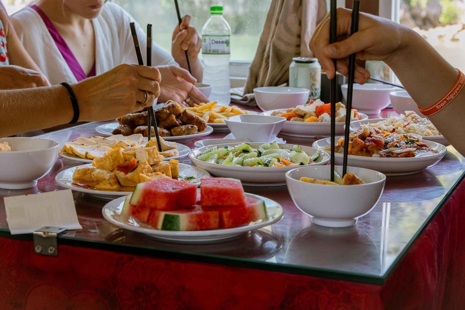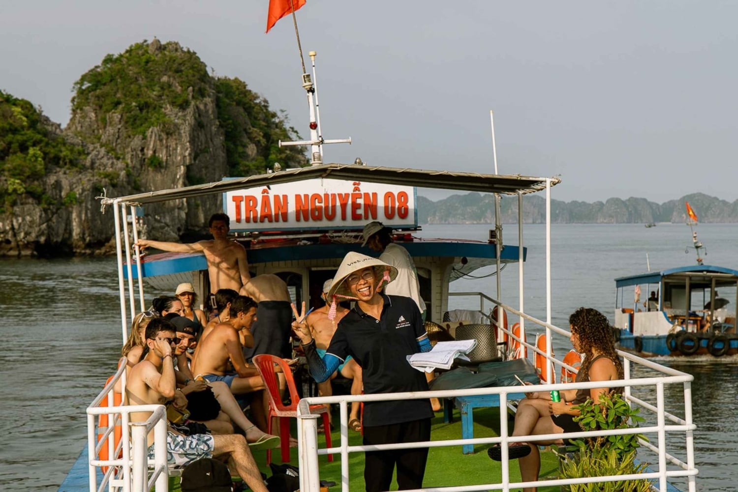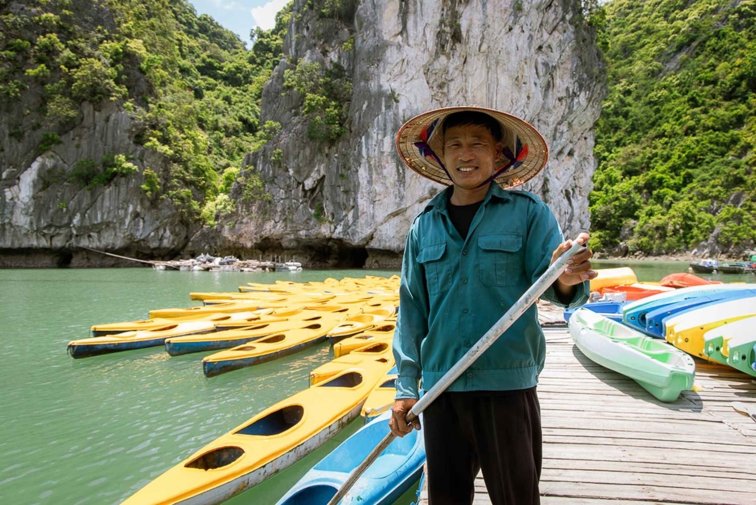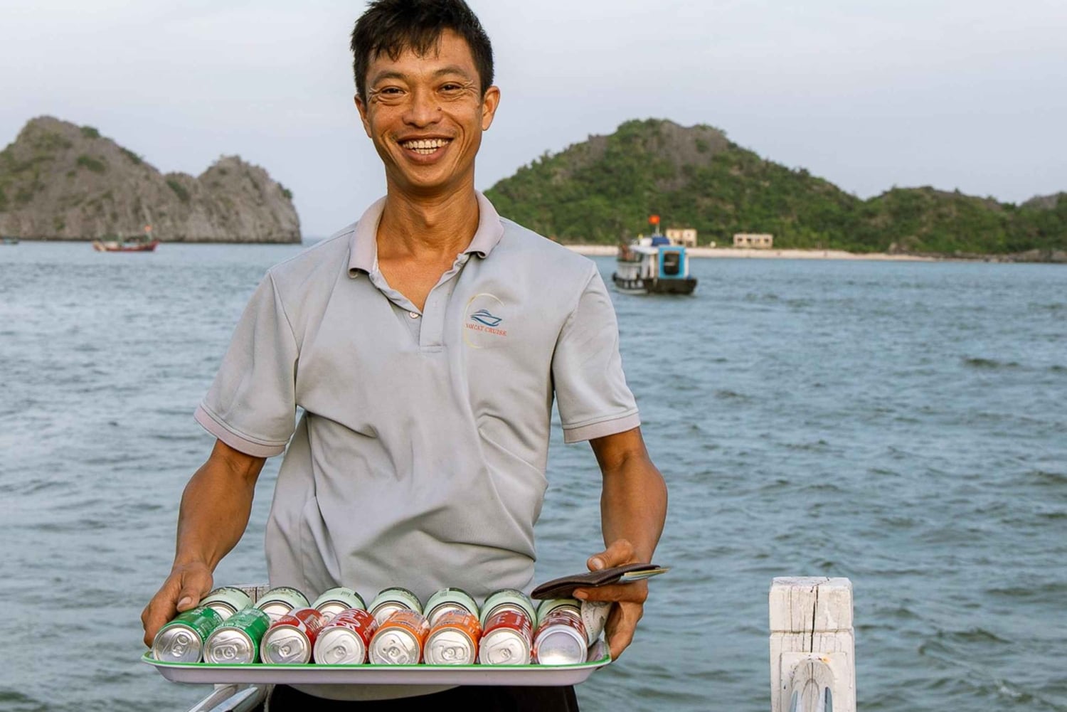 Vår tur börjar med en bekväm hotellupphämtning från ditt boende på Cat Ba Island. Vi hämtar dig mellan kl. 08.00 och 08.15 på vintern och mellan kl. 08.15 och 08.30 på sommaren. (Vi kontaktar dig i förväg för att bekräfta den exakta tiden). När du anländer till Ben Beo Pir går du ombord på vår traditionella båt och börjar navigera genom den fantastiska Lan Ha Bay. När vi kryssar kan du beundra de imponerande kalkstensformationerna och passera Cai Beo, en av Vietnams äldsta och största flytande fiskebyar. Du får se hur byn fungerar och lära dig om de lokala fiskarnas vardagsliv. Därefter kryssar vi till den hisnande Ha Long-bukten, ett världsarv. På vår väg går vi ombord på kajaker och paddlar genom den största kalkstensarkipelagen i Vietnam. Vi kommer att ta oss igenom vackra grottor och utforska gömda områden! Du kan njuta av utsikten när du navigerar i det klara, lugna vattnet. Se till att använda solskyddsmedel om det är en ljus dag. Efter ditt kajakäventyr återvänder vi till båten för en utsökt lunch med färska skaldjur och vegetariska alternativ, tillagade av vår lokala besättning. Du kan koppla av på däck och njuta av det fantastiska landskapet när vi passerar Ha Long Bay. När lunchen är klar kommer vår kapten att hitta den perfekta platsen att kasta ankare, vilket ger dig tid att ta ett dopp. Du kan simma till den avskilda och lugna Ba Trai Dao-stranden, eller använda vår utrustning för en snorkling för att upptäcka områdets livliga marina liv. Gästerna älskar också att hoppa från sidan av båten! I slutet av resan stannar vi till framför Monkey Island. Håll utkik efter öns lekfulla invånare! Dessutom kan du välja att klättra upp till toppen av ön och njuta av den fantastiska utsikten över Lan Ha-bukten. Vandringen kan vara utmanande, så se till att ta med dig ordentliga skor. Därifrån kryssar vi tillbaka genom fiskebyn under den vackra gyllene timmen innan vi återvänder till Ben Beo-piren. Resan avslutas runt kl. 16:00 till 16:30, där en buss väntar på att ta dig tillbaka till ditt hotell. Viktiga saker att tänka på: * Schema: Resplanen kan ändras beroende på väderförhållanden. * Apor: Att se aporna är mycket vanligt men garanteras inte eftersom de är vilda djur. * Beroende på tidvattnet kanske vår båt inte kan ankra direkt vid Monkey Island, så vi måste simma i land. För de som tänker klättra upp till toppen föreslår vi att du tar med en större vattentät väska för att bära dina vandringsskor.Includes