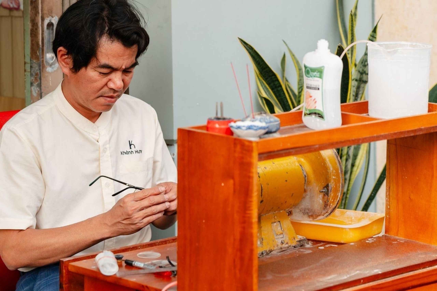 Ett par skräddarsydda glasögonbågar (för läsning eller bilkörning) tillverkade på plats på 30 minuter. Personlig synundersökning. Vietnamesiskt te/kaffe och traditionella snacks. Vintage fotohörna. Gåvor: Självdesignat vykort, tygväska från butiken och glasögonfodral. Historisk inblick i den traditionella butiken/optikern i Vietnam.Important Information