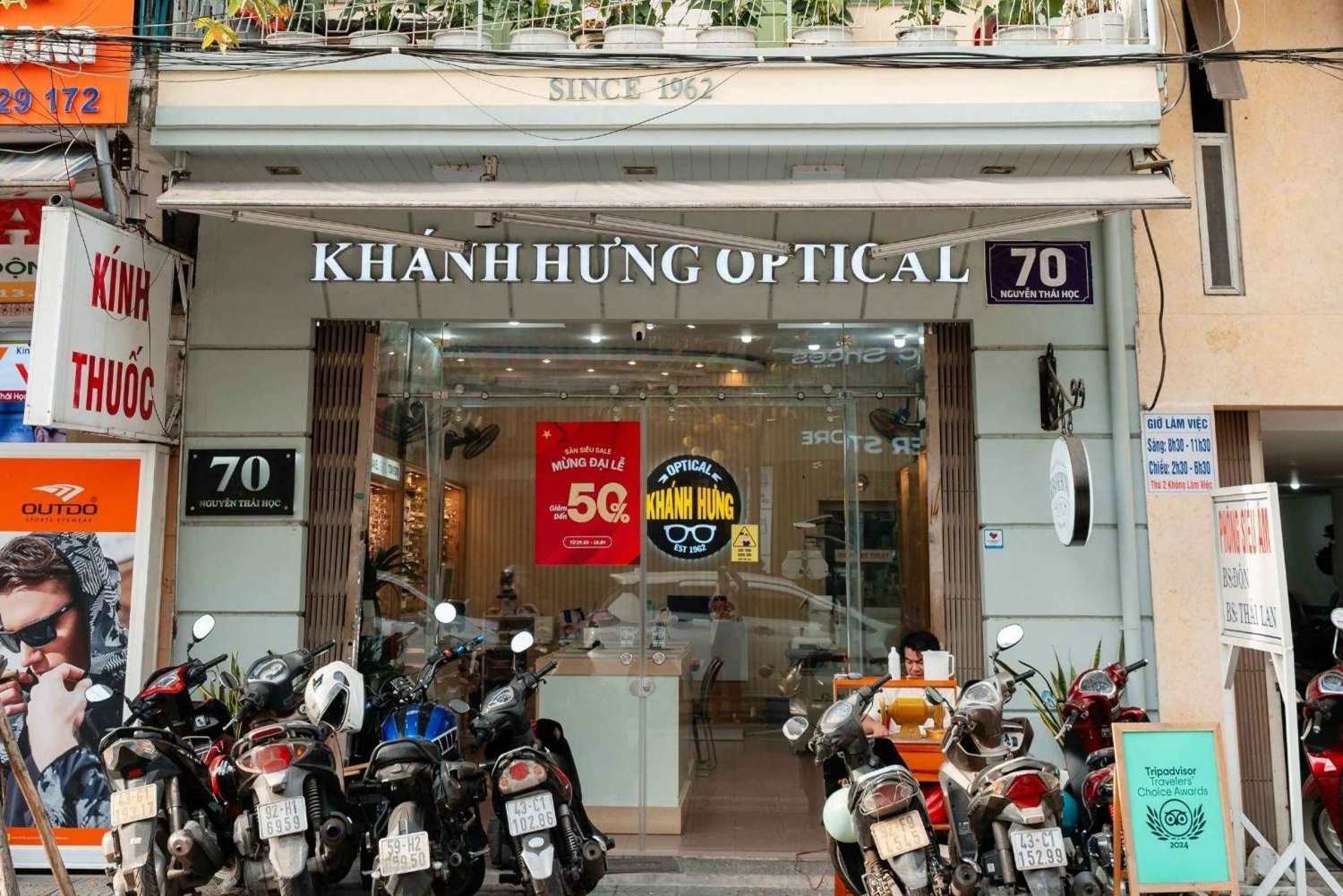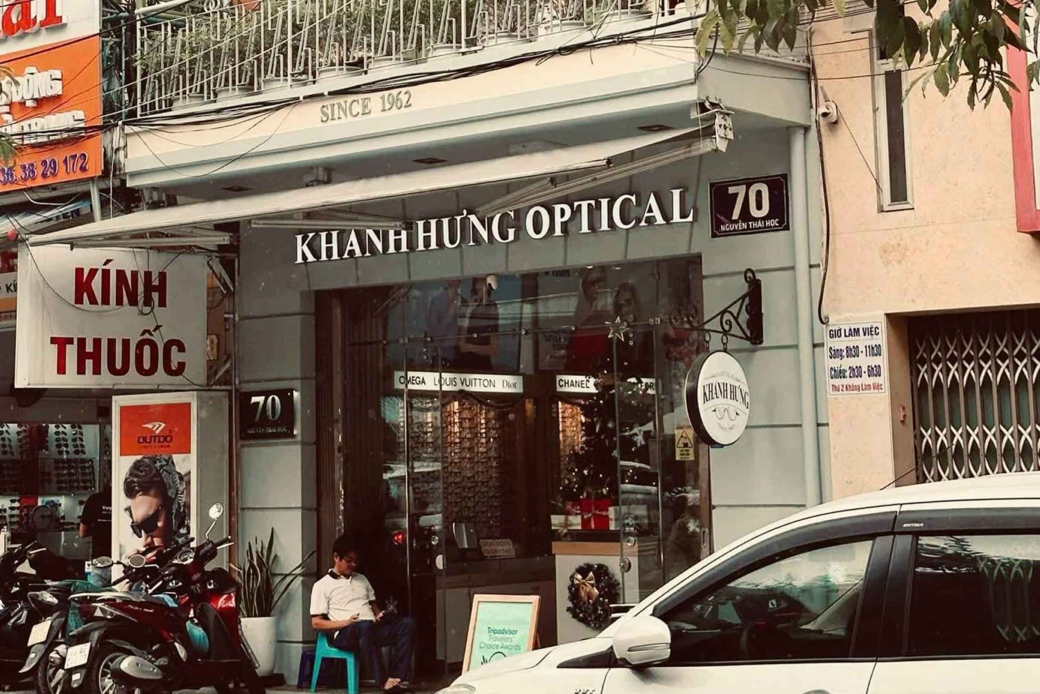 Kliv in i en gammal kolonial optikerbutik i hjärtat av Da Nang, en plats som har betjänat generationer av lokalbefolkning och resenärer, överlevt Vietnamkriget och bevarat sin vintagecharm från den franska kolonialtiden. Denna dolda pärla erbjuder en unik resa tillbaka i tiden, där du kan välja ditt perfekta par glasögon och njuta av en avkopplande paus med traditionellt vietnamesiskt te eller kaffe medan dina glasögon tillverkas av experter. Vad du kan förvänta dig: - Utvalt urval av bågar: Bläddra igenom en stilren kollektion av bågar som passar din ansiktsform och stil. Oavsett om du behöver en snabb synundersökning eller har ett recept, tillverkas dina skräddarsydda glasögon på plats på bara en halvtimme. - Linsalternativ: Välj mellan baslinser, övergångslinser eller linser som blockerar blått ljus, alla anpassade efter dina behov. - Avkopplande atmosfär: Njut av traditionellt vietnamesiskt te i ett elegant rum från kolonialtiden, fullt av vintagecharm. Lär dig mer om optikens historia och hur den överlevde upploppen och bombningarna under Vietnamkriget och förblev ett pålitligt namn inom synvård. - Kulturarv: Upptäck det unika kulturarvet och de gamla antikviteterna i en traditionell vietnamesisk butik, komplett med en hörna för att be till förfäderna som speglar den djupt rotade traditionen av förfädersdyrkan i vietnamesiska familjer. - Premiumtillval (mot avgift): Förbättra din upplevelse med premiumtillval som antireflexbehandling, progressiva glas eller specialtonade glas. - Vintagefotohörna: Ta stilfulla bilder i en liten vintagefotohörna och ge ditt besök en nostalgisk touch. - Exklusiva souvenirer: Få ett autentiskt vykort och en handgjord tygväska från butiken. Dina färdiga glasögon levereras i ett exklusivt graverat glasögonfodral. Följ med oss på en oförglömlig upplevelse!Includes