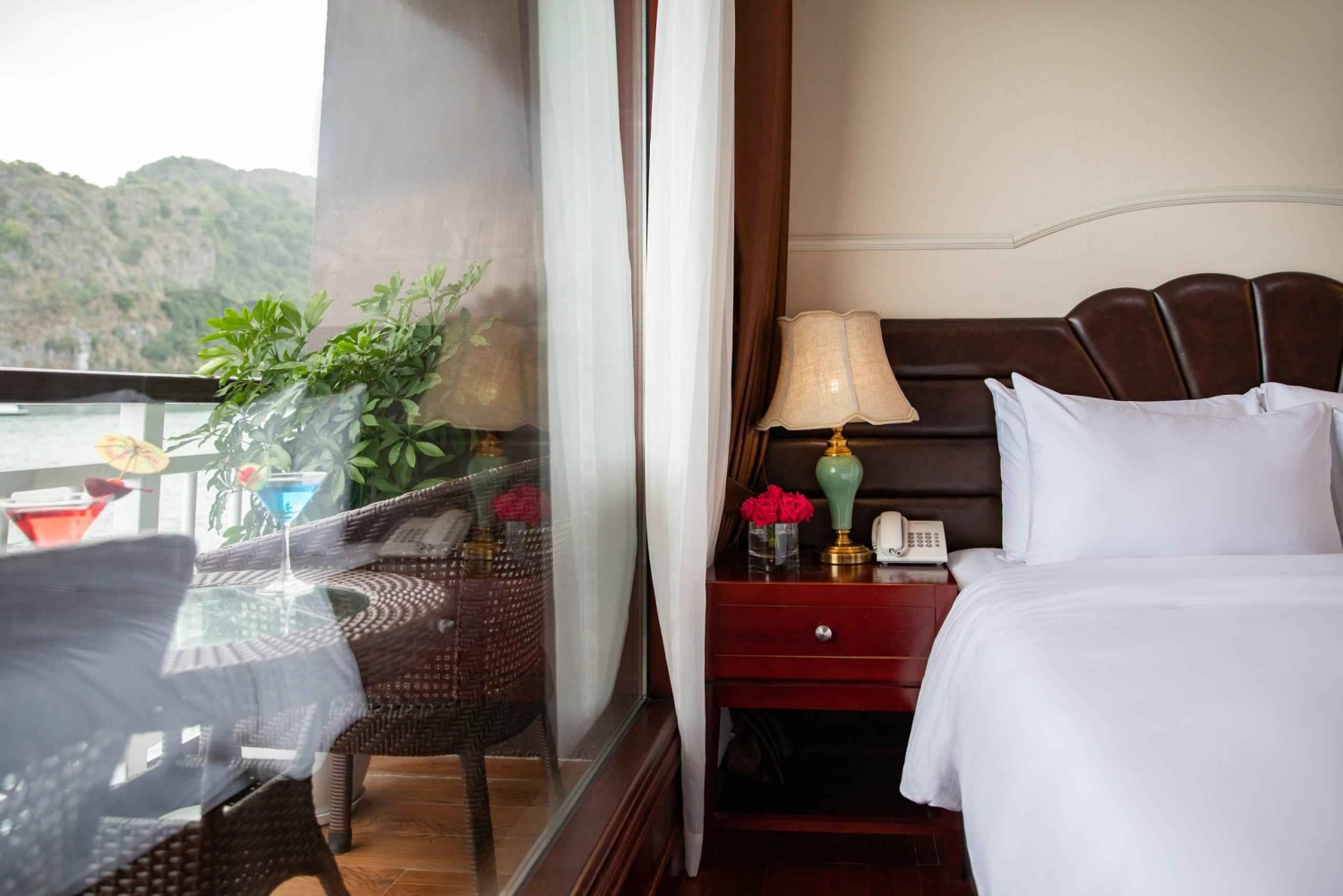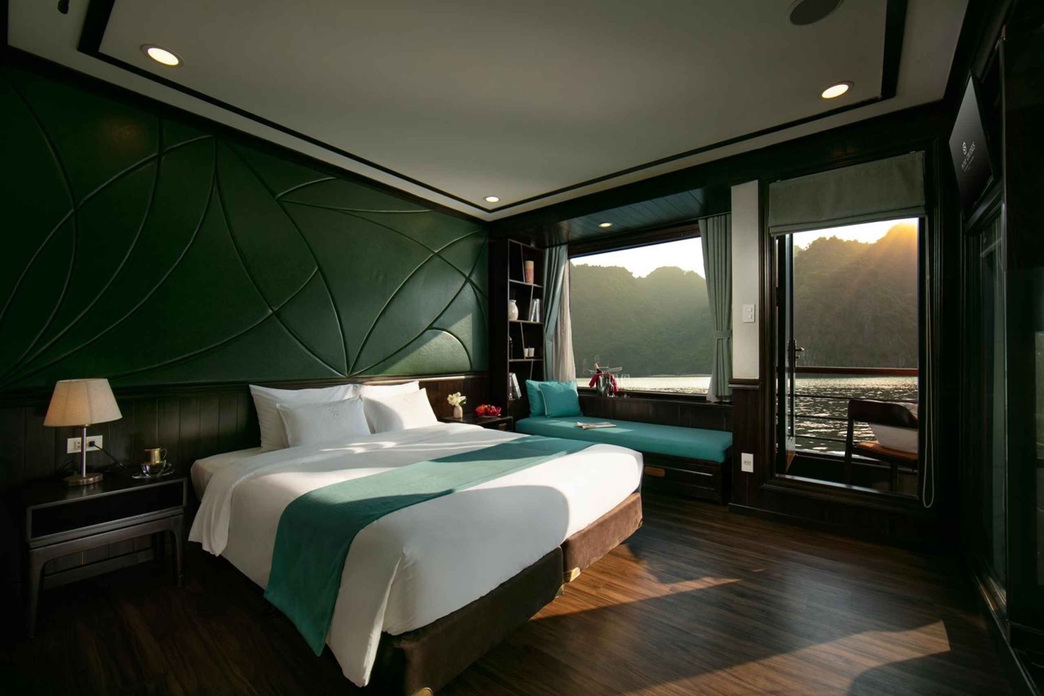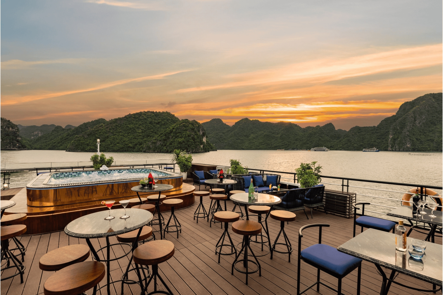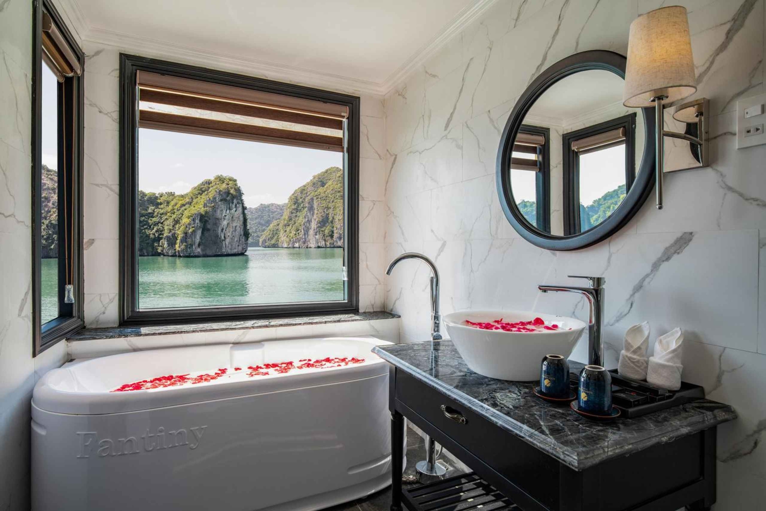 Njut av solnedgången med en kopp te och utforska grottor med bambubåt på en 2-dagars kryssning med 1 natt från Hanoi till Halongbukten och Lan Ha-bukten. Paddla kajak, simma i bukten, träna tai chi i soluppgången och fiska bläckfisk. Koppla av i en lyxig hytt med privat balkong, restaurang ombord, bar och många andra exklusiva bekvämligheter. Detaljerad resplan Dag 1: Hanoi - Halongbukten - Lan Ha-bukten 08:00 - 08:30 | Upphämtning från hotell Guiden hämtar dig från hotell i Hanois gamla kvarter eller områdena Tam Coc och Trang An (Ninh Binh) och avgår till Tuan Chau-hamnen med limousine. 11:30 - 12:00 | Ombordstigning Välkommen ombord på kryssningens restaurang. Njut av en välkomstdrink medan du lyssnar på en kort genomgång av resan. Därefter kan du njuta av en traditionell lunchbuffé innan du checkar in i din hytt. 14:30 - 15:30 | Grottutforskning och kajakpaddling - ordnas beroende på tidvattnet Alternativ 1: Utforska Dark & Bright Cave med kajak eller bambubåt i cirka en timme. Därefter återvänder du till huvudkryssningen för att simma runt båten. Alternativ 2: Åk till Ba Trai Dao Beach - en fantastisk destination för kajakpaddling runt kalkstensöar och simning i klart turkosblått vatten. 16:30 | Solnedgång och matlagningskurs Återvänd till kryssningen. Solnedgången är en av de mest magiska stunderna på dagen i bukten – missa den inte! Delta i en matlagningsdemonstration och lär dig att laga traditionella vietnamesiska vårrullar med kocken ombord. 19:00 | Middag och kvällsaktiviteter Njut av en läcker middag med skaldjur i restaurangen ombord. Efter middagen kan du njuta av en cocktail i den panoramiska baren eller prova på bläckfiskfiske. Övernattning i din privata hytt. Dag 2: Lan Ha-bukten – slut på kryssningen – återresa till Hanoi 06:00 | Tai Chi & soluppgång över bukten Börja morgonen med Tai Chi i den friska luften medan du beundrar soluppgången över bukten. 06:30 - 07:30 | Lätt frukost 07:45 - 08:45 | Utomhusaktivitet - ordnas beroende på kryssningens tillgänglighet på din bokningsdag Alternativ 1: Besök Trung Trang/Quan Y-grottan, som ligger i biosfärområdet Cat Ba Island - en av de mest imponerande grottorna i området. Alternativ 2: Kryssning till Tra Bau-området – en idealisk plats för kajakpaddling och för att njuta av den orörda naturen i Lan Ha-bukten. 09:00 - 09:30 | Utcheckning Återvänd till kryssningen och checka ut från hytten. 10:00 | Brunch ombord Njut av brunch medan kryssningen tar sig tillbaka till Tuan Chau-hamnen. 11:20 - 11:45 | Avstigning och återresa till Hanoi Avstigning i Tuan Chau hamn. Limousinetransfer tillbaka till Hanoi. 15:00 | Resan avslutas i Hanois gamla kvarter Anmärkningar - Vi erbjuder flera alternativ av nybyggda 5-stjärniga kryssningar med stålskrov för denna resplan. Kryssningen kommer att ordnas utifrån tillgänglighet vid bokningstillfället. - Avlämning i Ninh Binh istället för Hanoi är tillgängligt på begäran via e-post. - Gratis dekorationer för bröllops- eller jubileumshytter. - Gratis födelsedagstårta för gäster som fyller år på incheckningsdagen. - Vänligen kontakta oss via e-post om du har några specialönskemål.Includes